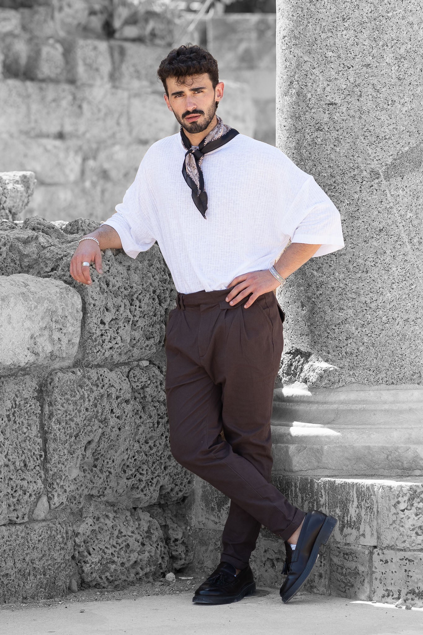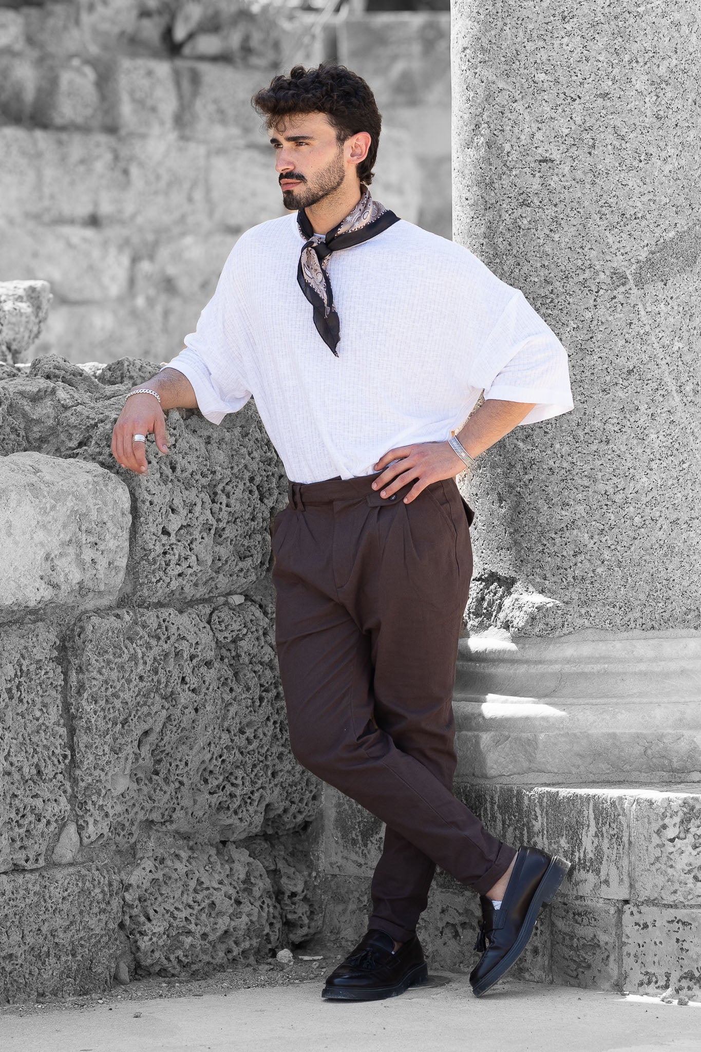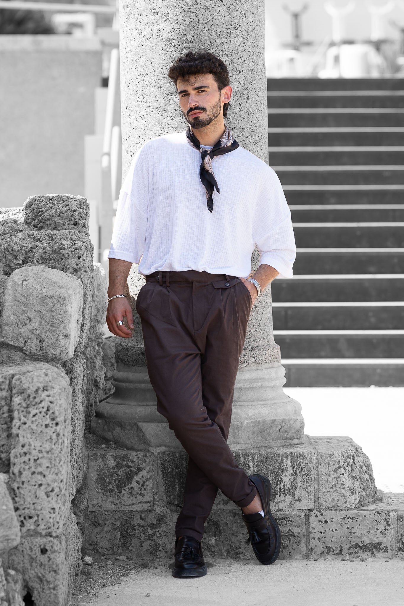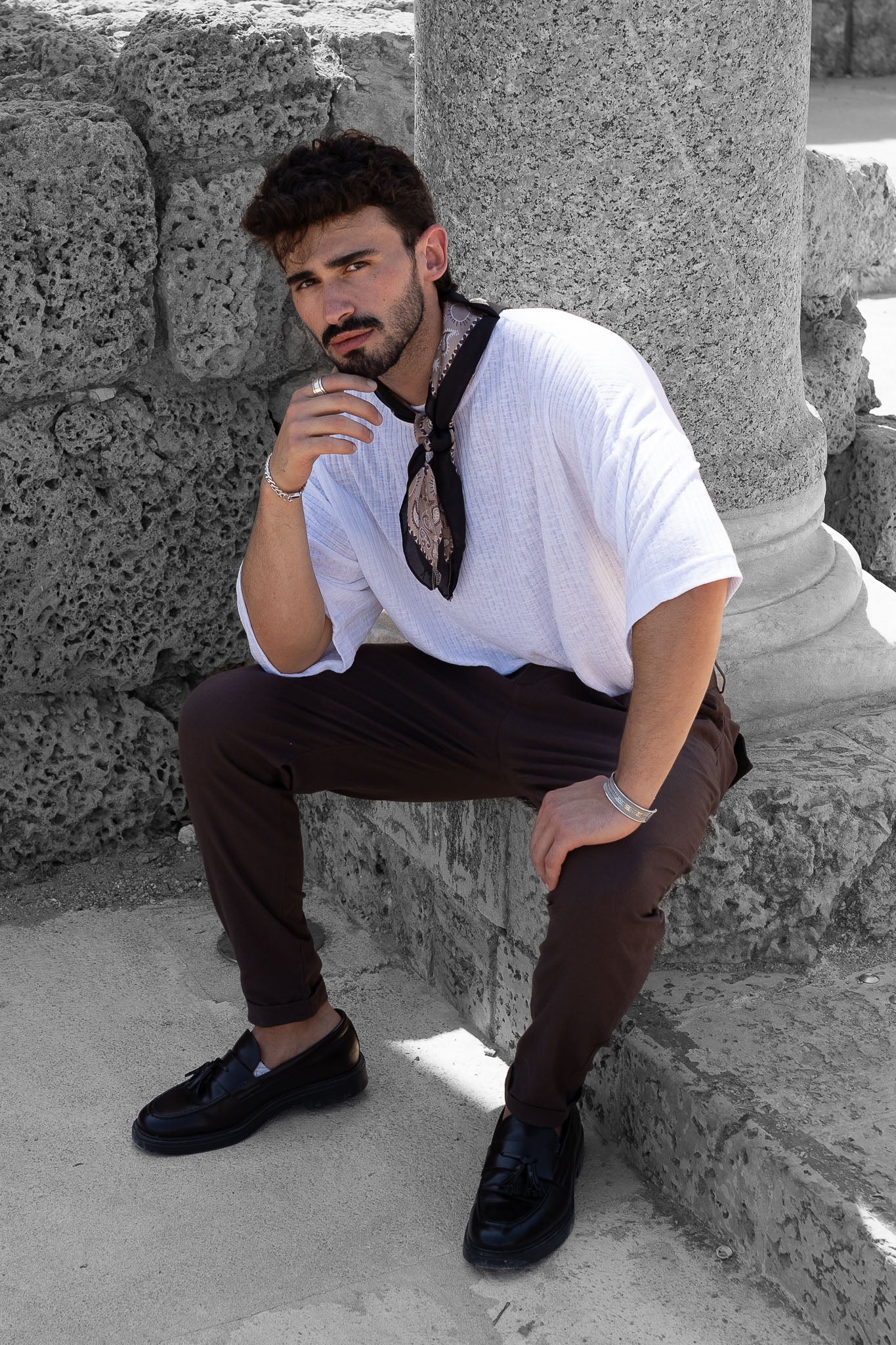 חולצת טי שרט בגזרת oversize עשויה מבד פשתן קליל ונעים בעיצוב ייחודי של טקסטורת פסים ,