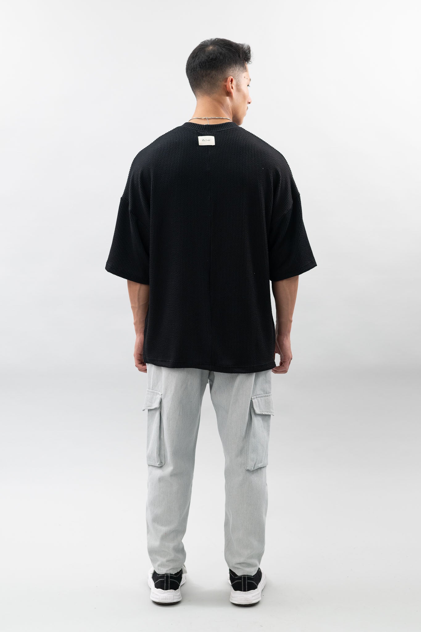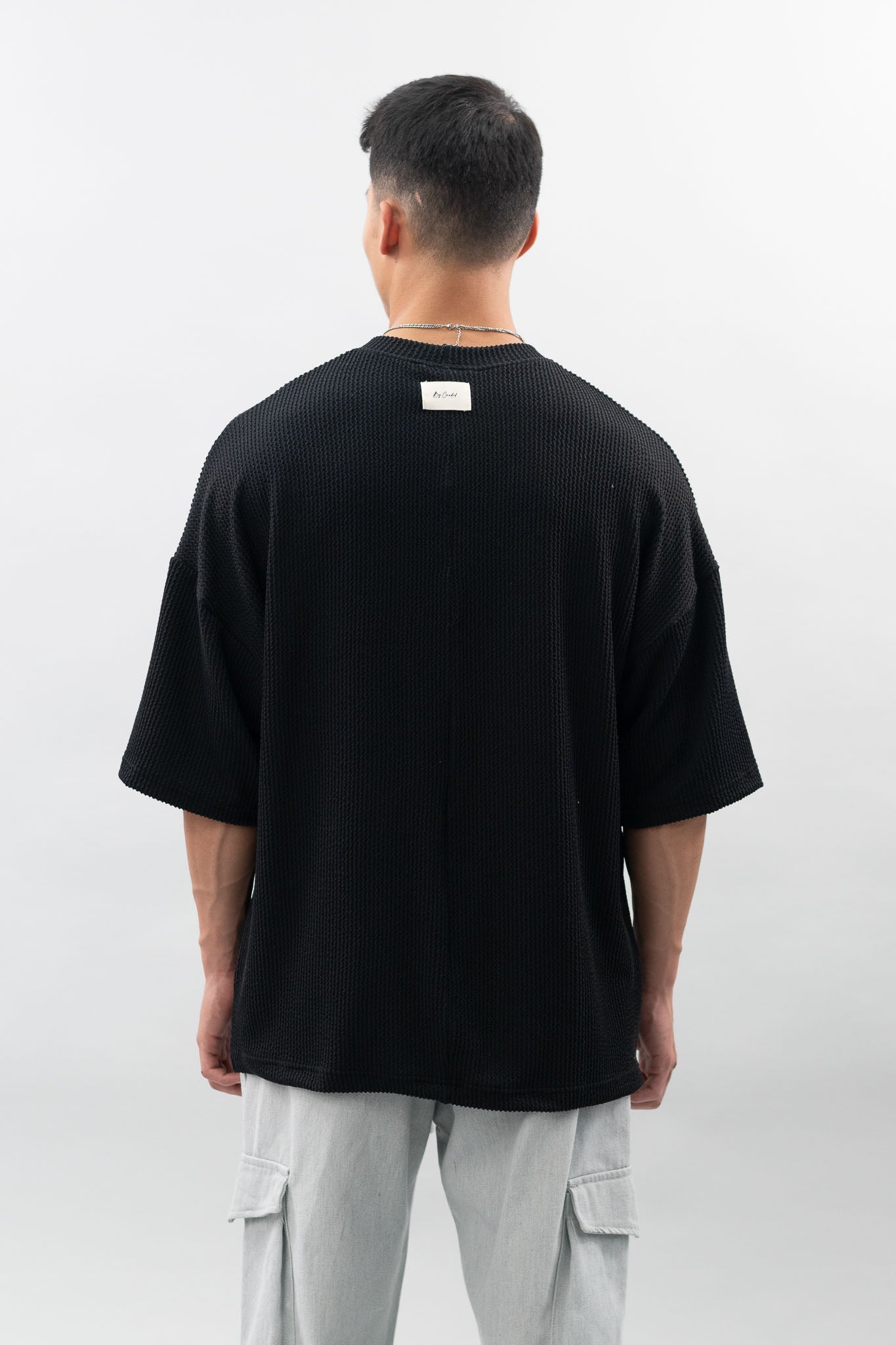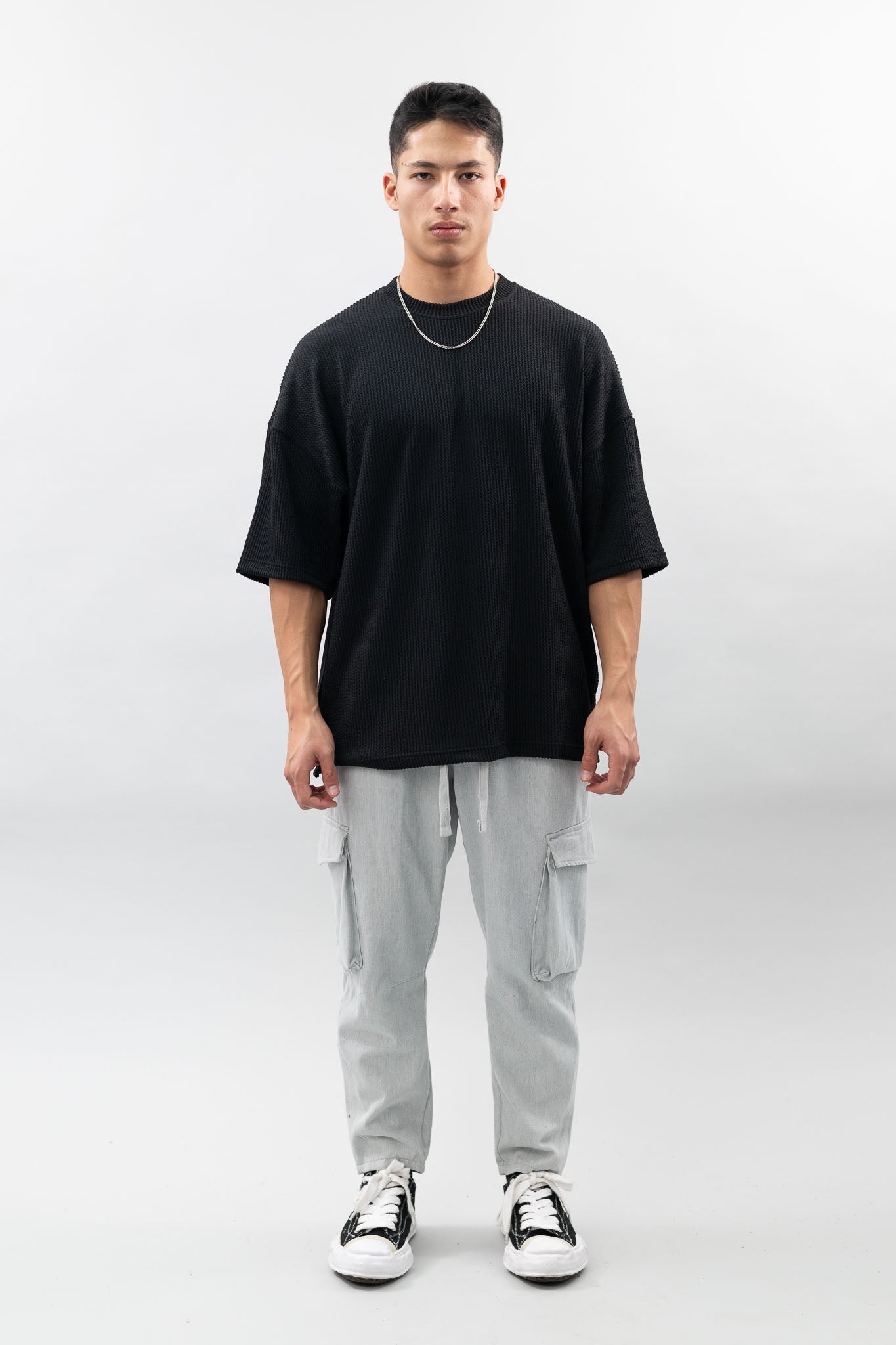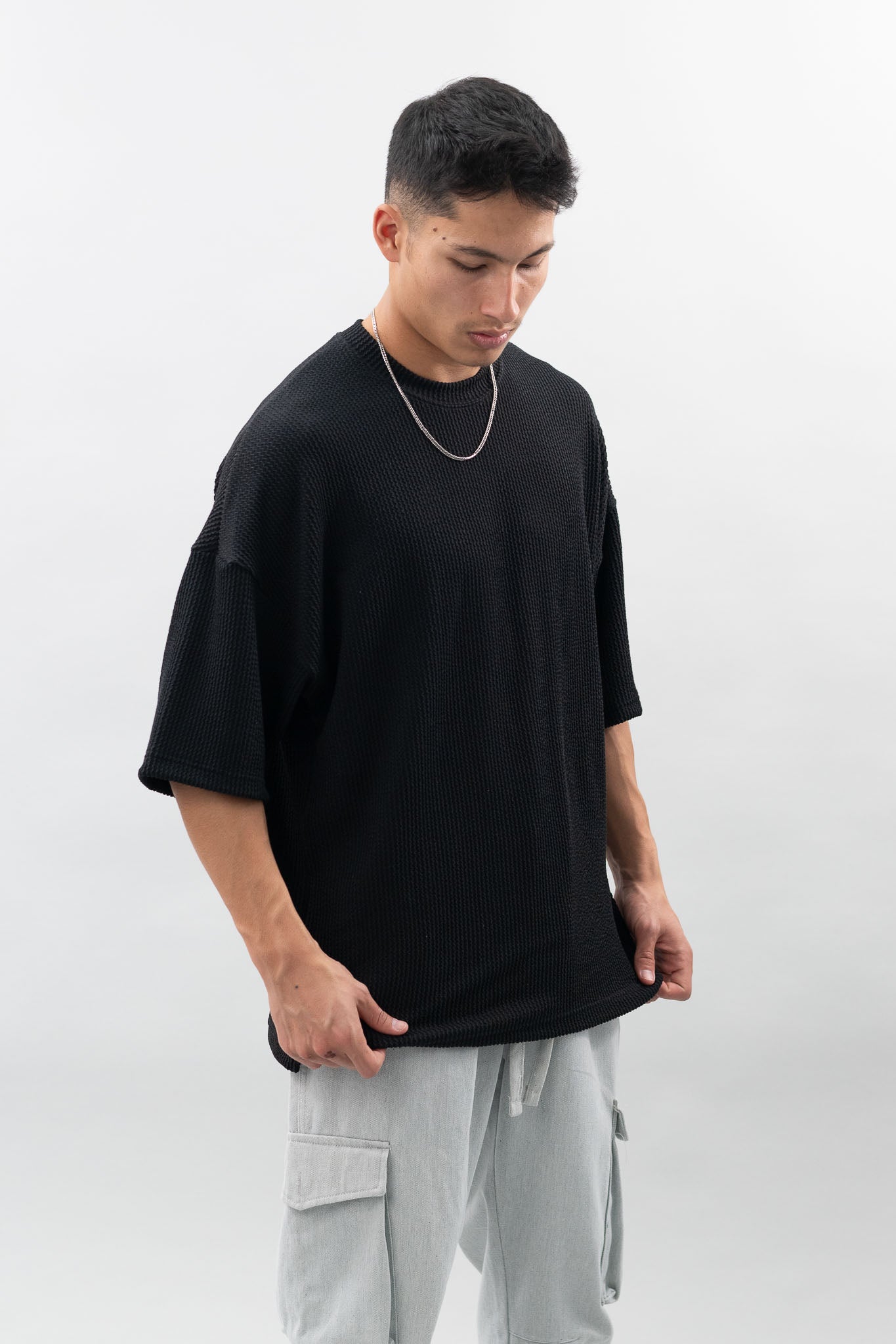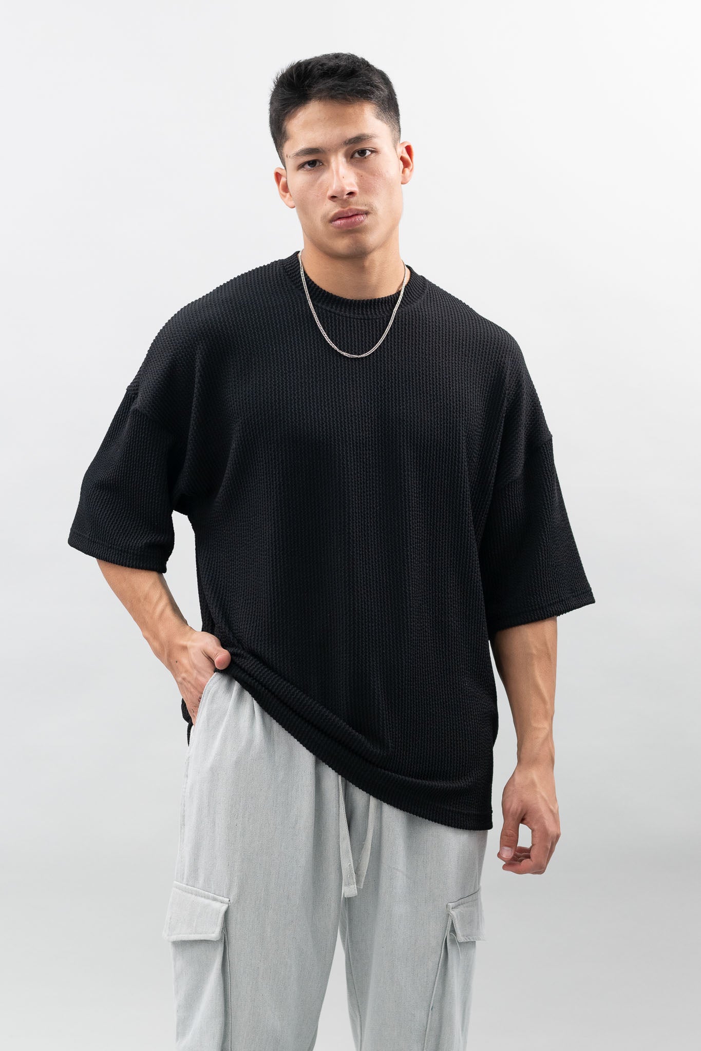טי שרט קצרה בגזרת super oversize, עשויה מבד סריג איכותי עם טקסטורה מיוחדת שמוסיפה ייחודיות .