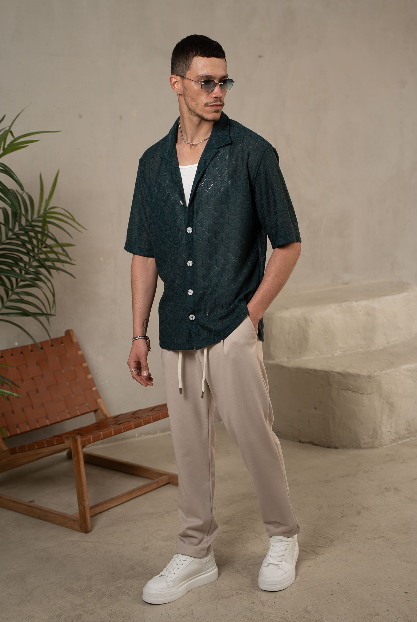 דוגמן בגובה 1.84 משקל 70 לובש מידה L מכופתרת קזואל קצרה בגזרת אוברסייז, עשויה מבד נעים
