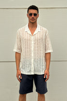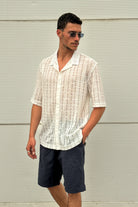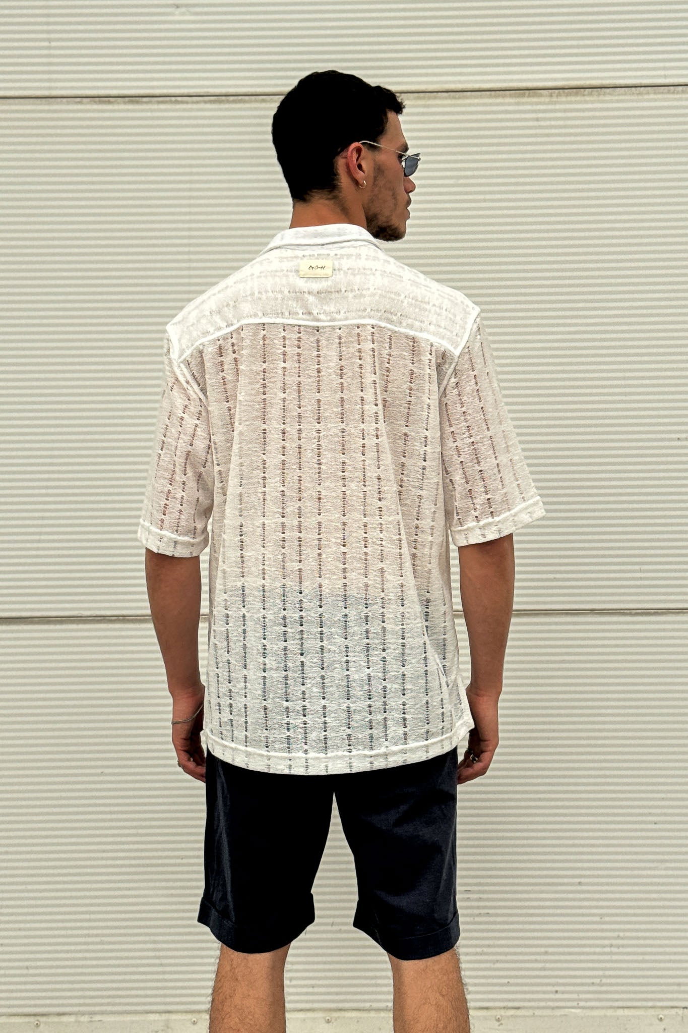 דוגמן בגובה 1.84 משקל 70 לובש מידה L מכופתרת קצרה עשויה מבד קליל ונעים, עיצוב אופנתי עם טקסטורה ,