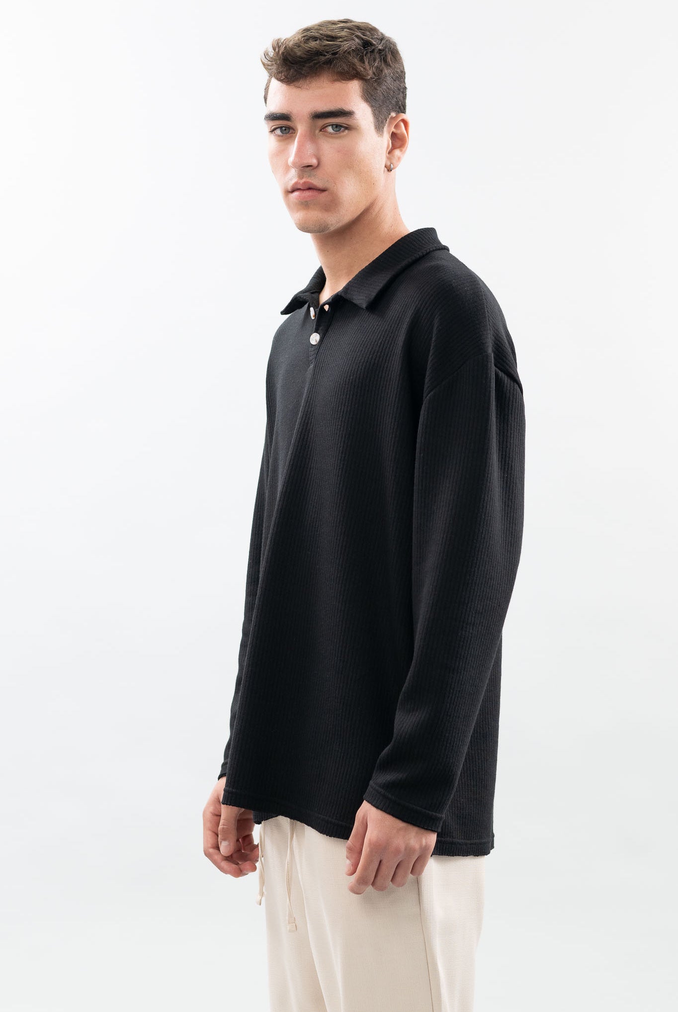 חולצת פולו עם שרוולים ארוכים, גזרת אוברסייז, יושבת יפה על הגוף.