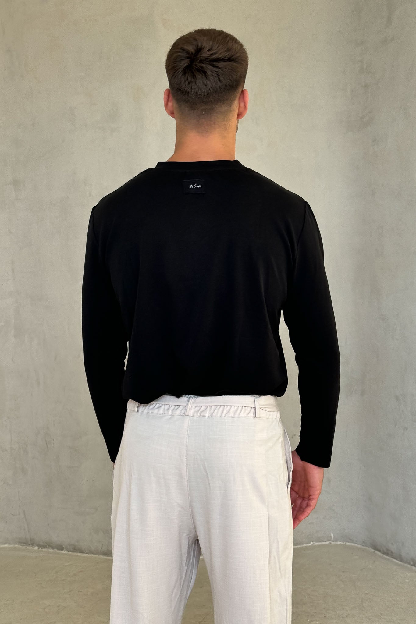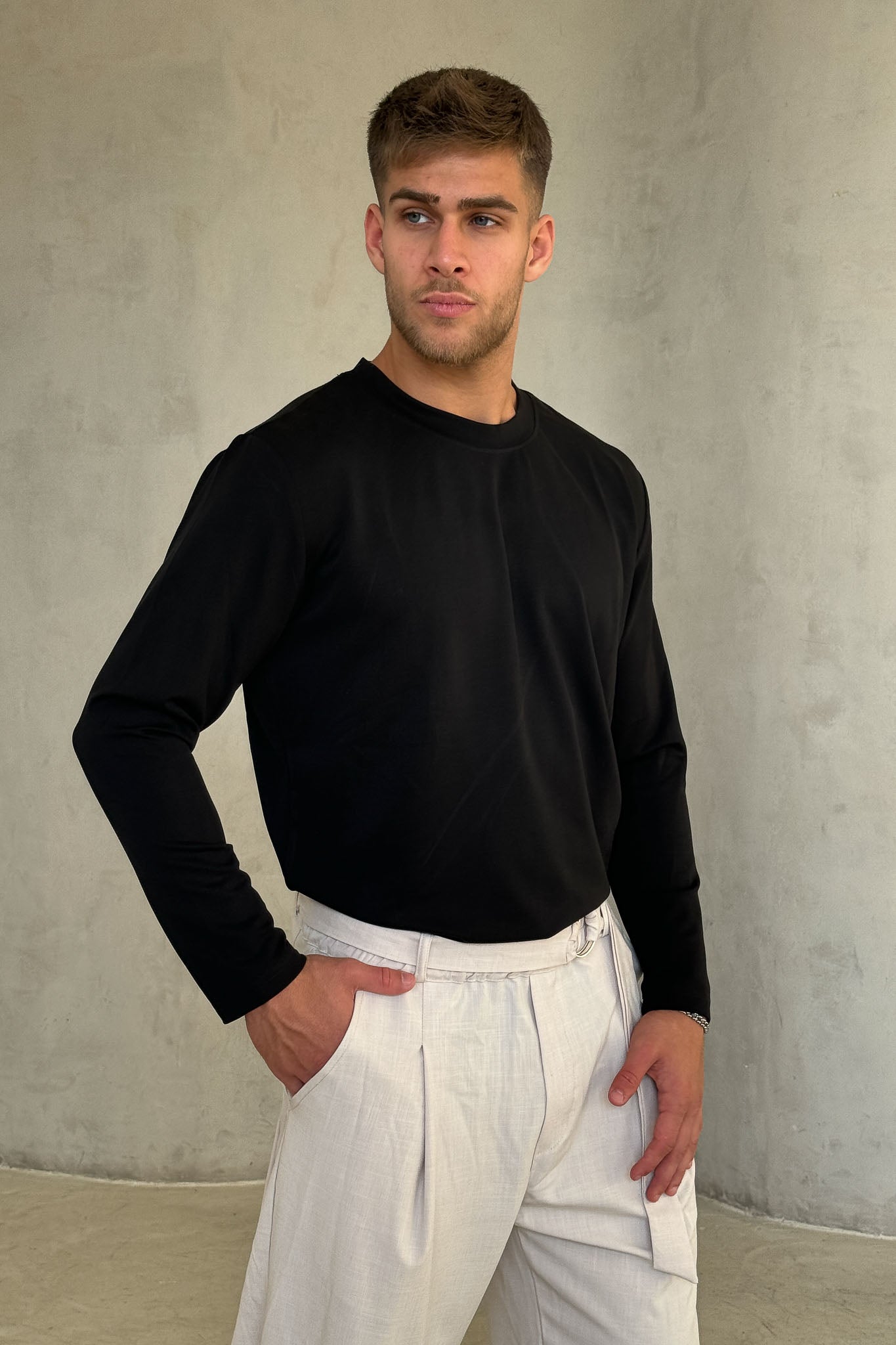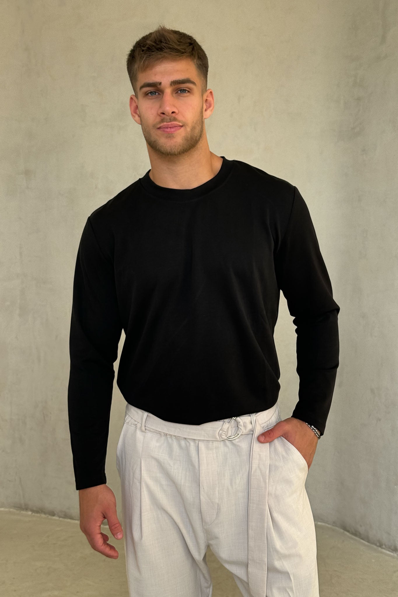 חולצה שחורה ארוכת שרוול מבד אחד הנעימים שיש, רכה במיוחד ונעימה על הגוף. גזרה נקייה ומדויקת שיושבת מושלם ונותנת לוק מינימליסטי, אלגנטי ויומיומי. מתאימה לכל אאוטפיט — משילוב עם ג’ינס ועד מכנסי בד קלאסיים. חובה בארון.