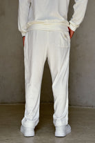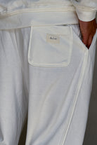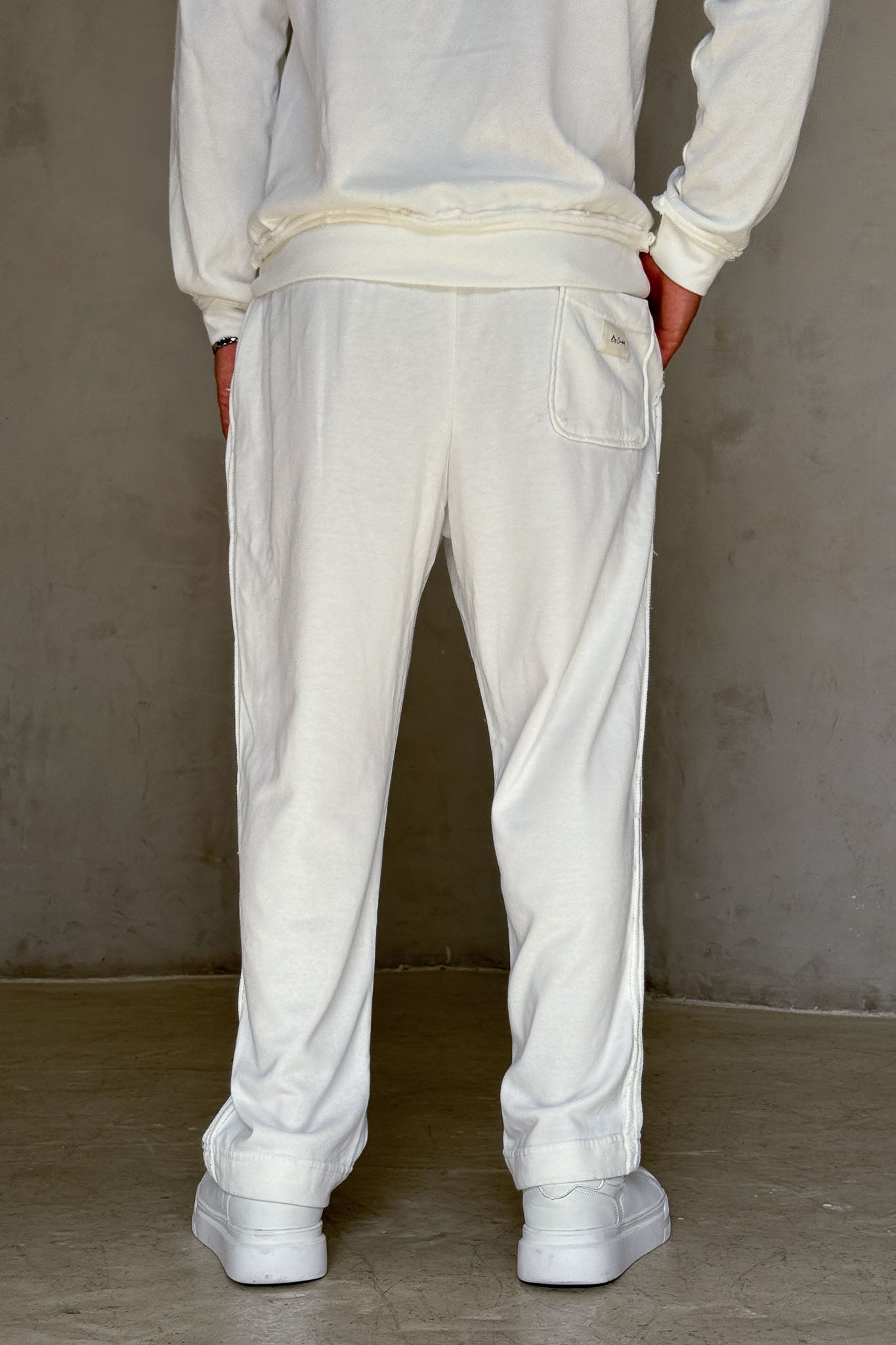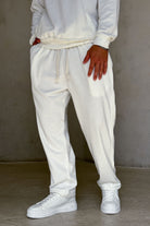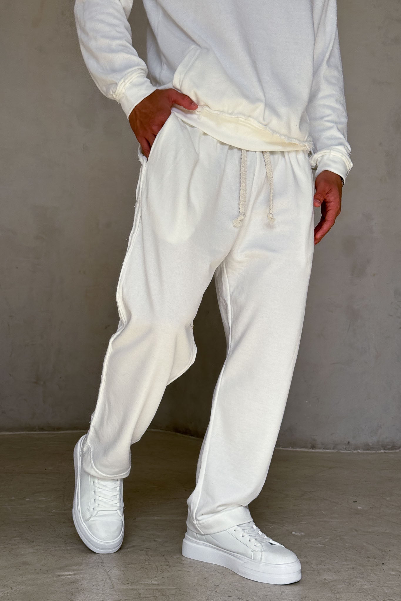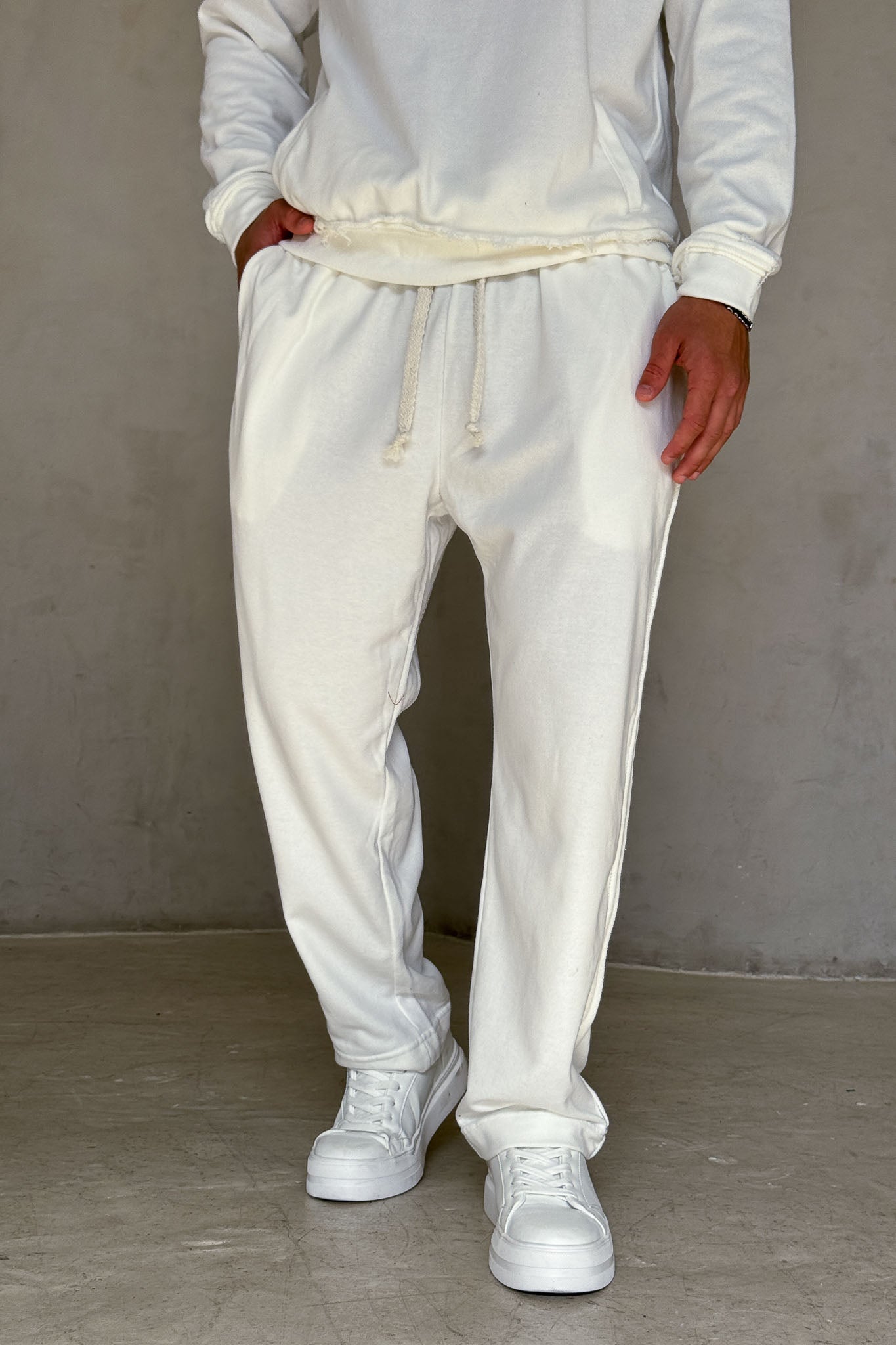 מכנס טרנינג לבן בגזרה נוחה ומשוחררת, מבד רך ונעים עם גומי ושרוך במותן לנוחות מקסימלית. יושב מושלם על הגוף ונותן לוק נקי, מודרני ויומיומי. מתאים לשילוב עם פוטר תואם או טי-שירט לבנה נקייה לסטייל מינימליסטי ומדויק.