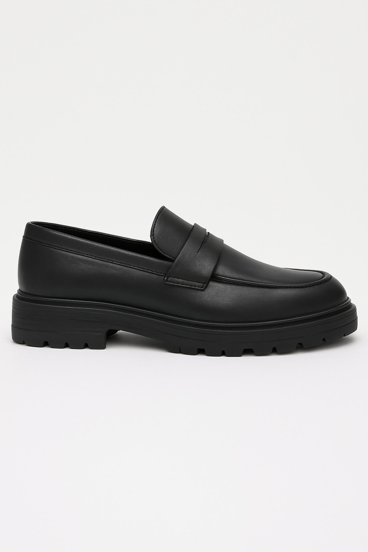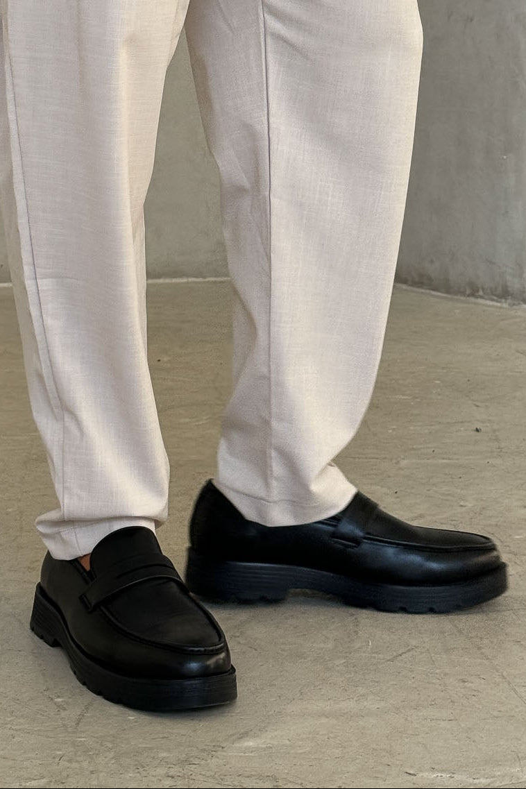מוקסין אלגנט שחור עם סוליה מאסיבית ומראה מודרני ומחודד. הנעל משלבת קלאסיות עם נוכחות — גימור חלק, רצועת מוקסין עליונה ועיצוב שמתאים גם ללוק ערב וגם ליום-יום נקי ומדויק. נוחה מאוד, יציבה, ומעלה כל אאוטפיט לסטייל גבוה יותר.