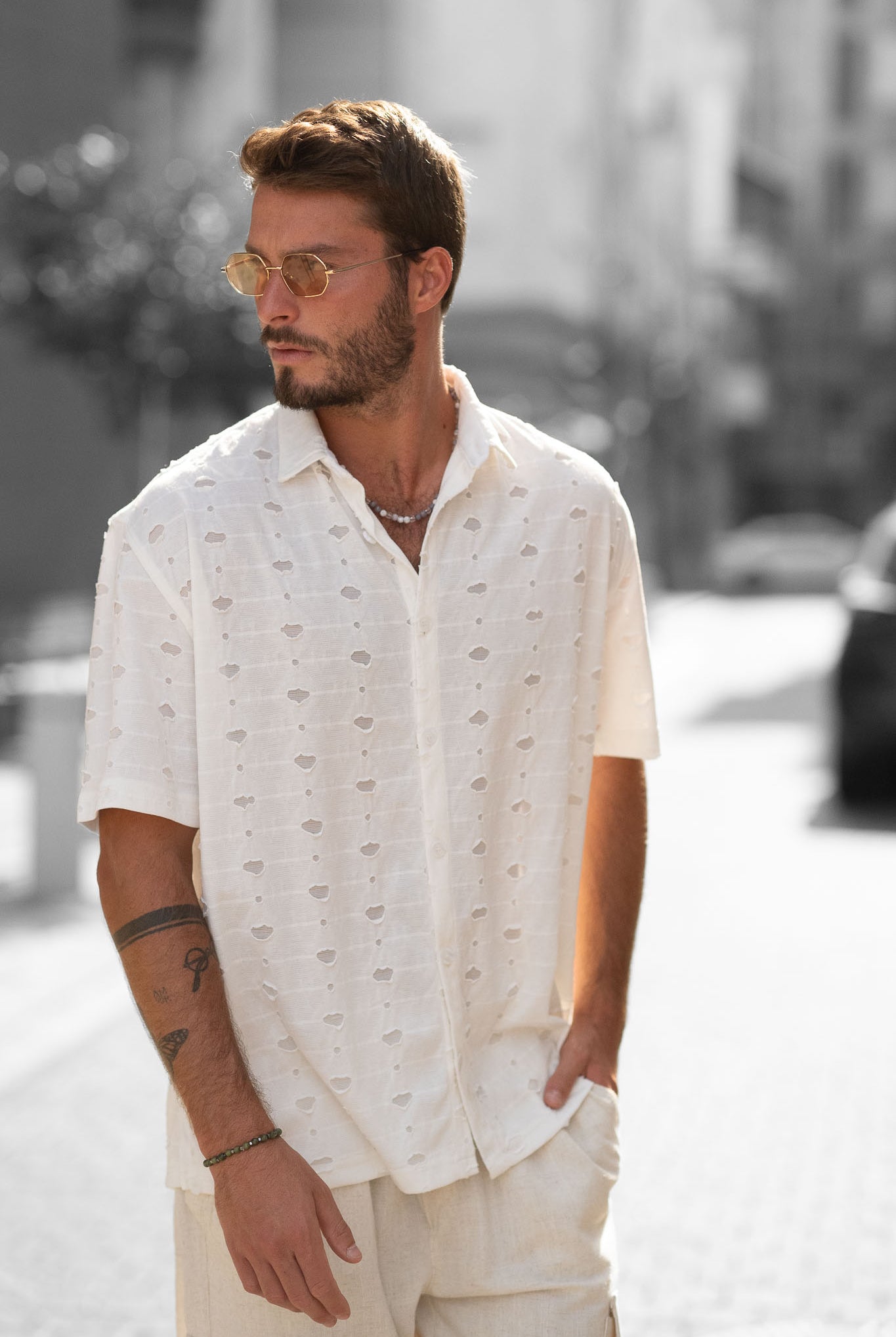 מידות הדוגמן - גובה 1.84 שוקל 80 מידה L מכופתרת קזואל קצרה בגזרת אוברסייז, עשויה מבד במראה פשתן עם חורים שמוסיפים טאץ' ייחודי.