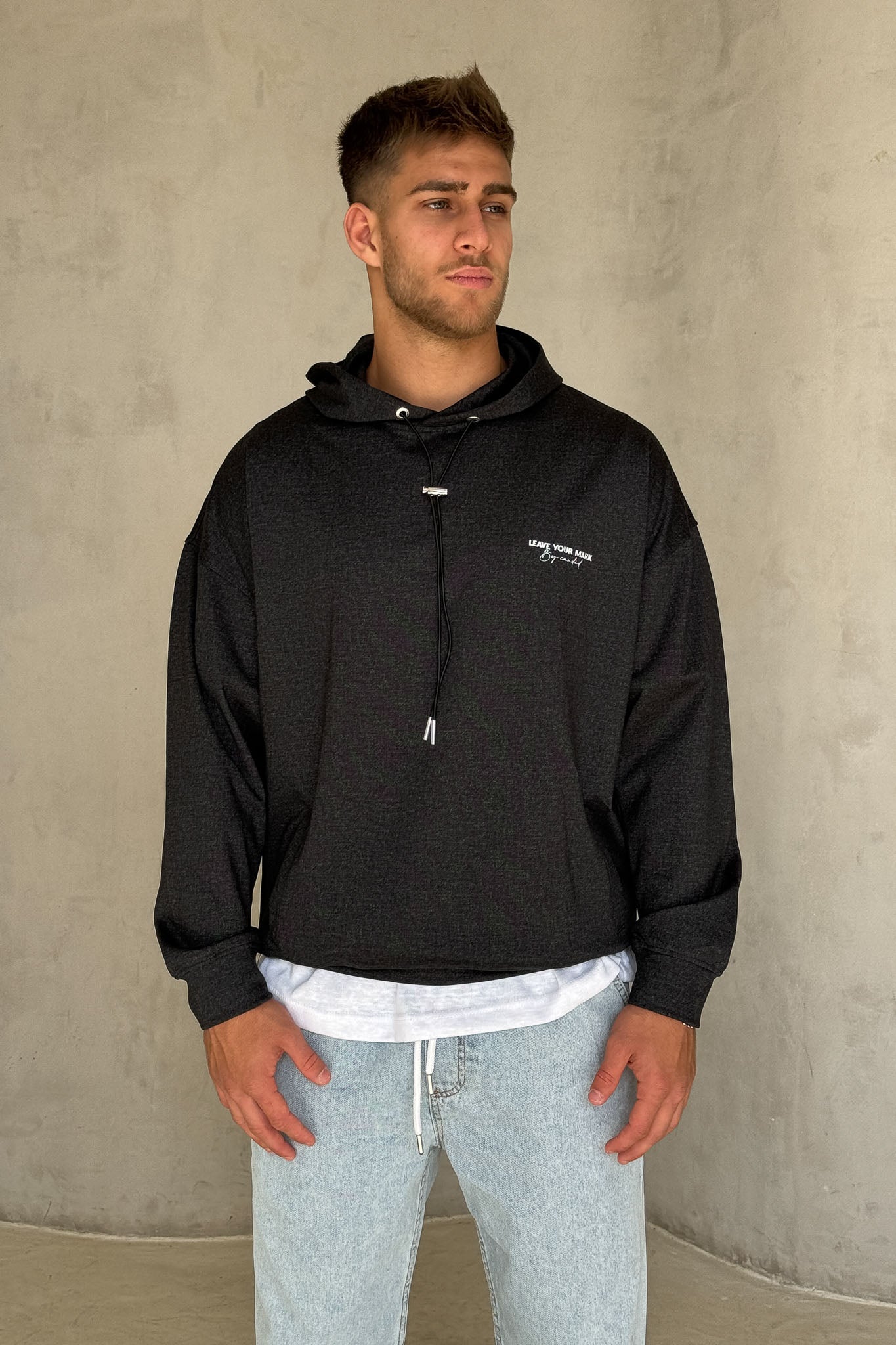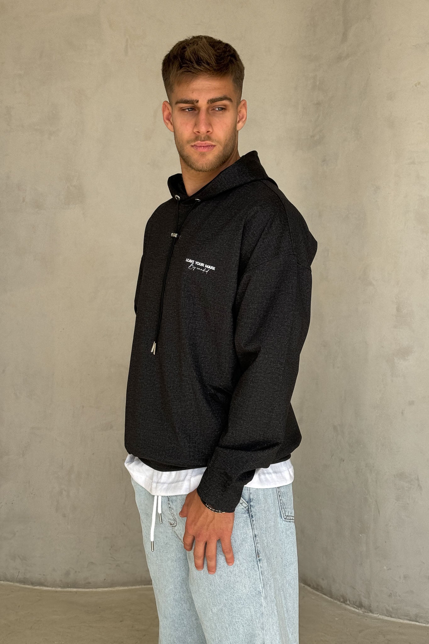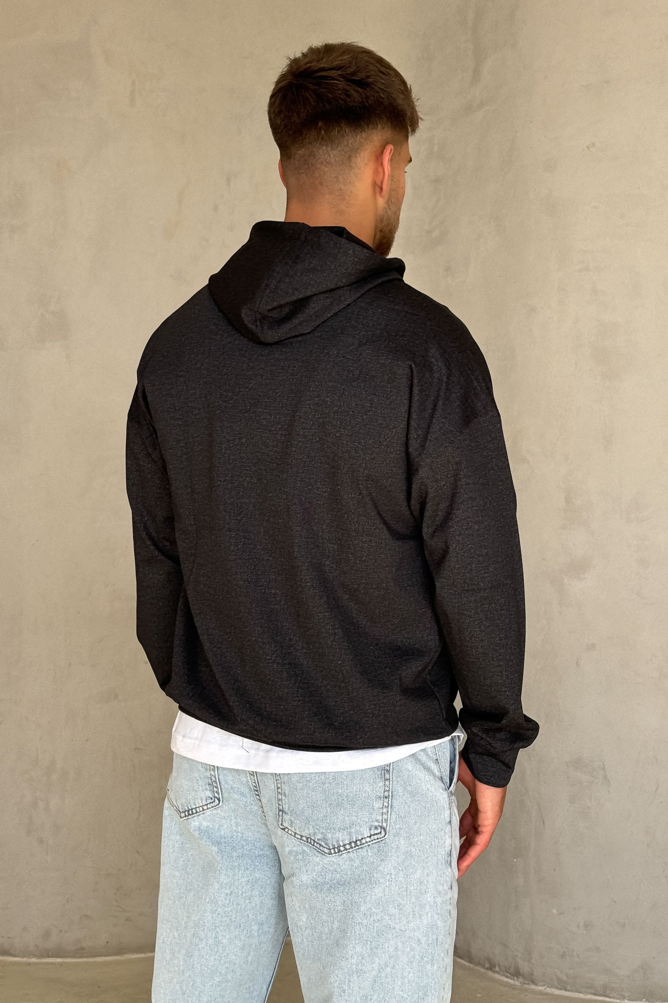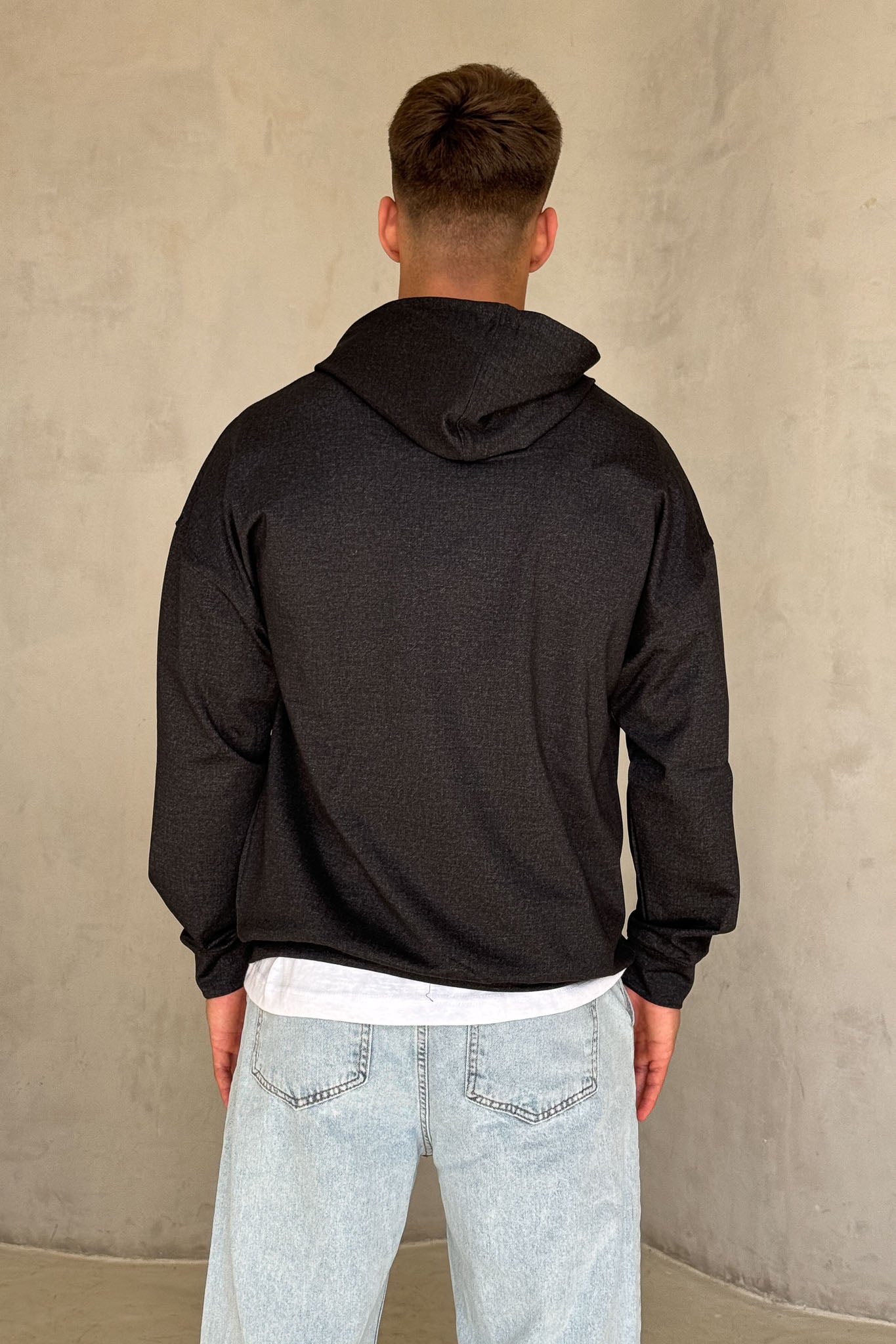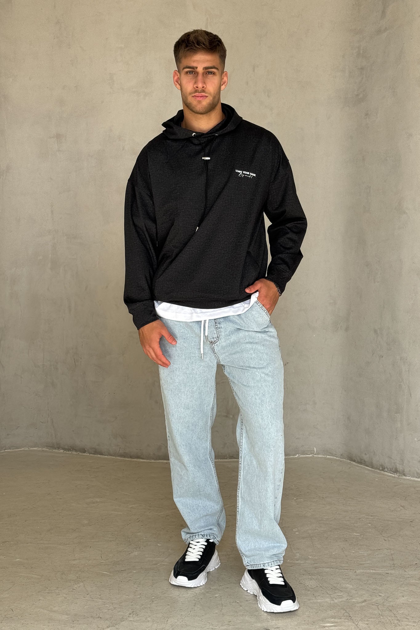 הדוגמן בגובה 1.87, משקל 84, לובש מידה L (גזרה רגילה עם נגיעה אוברסייזית קלילה).