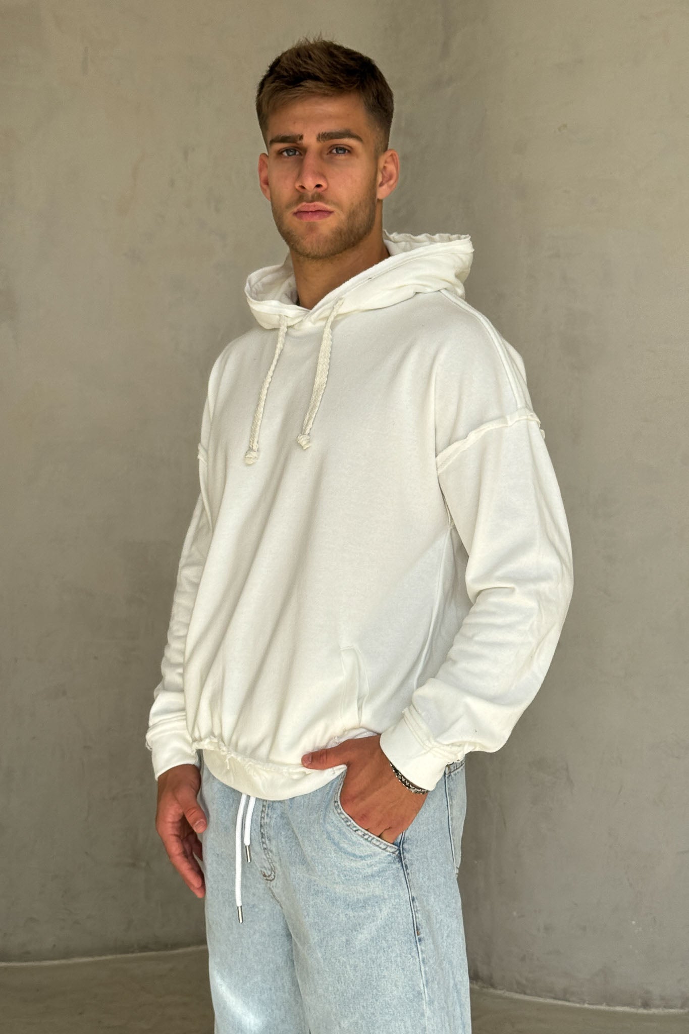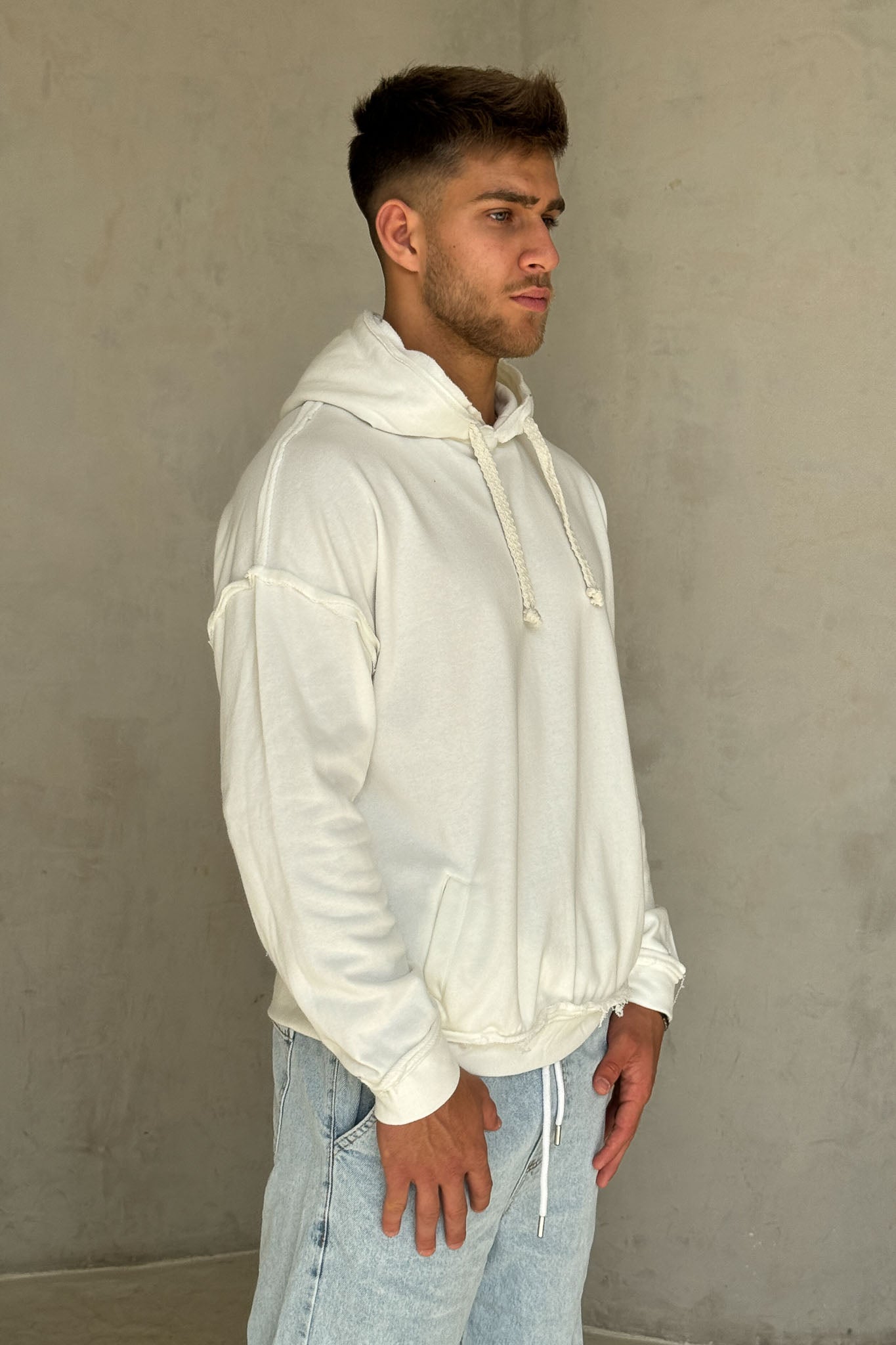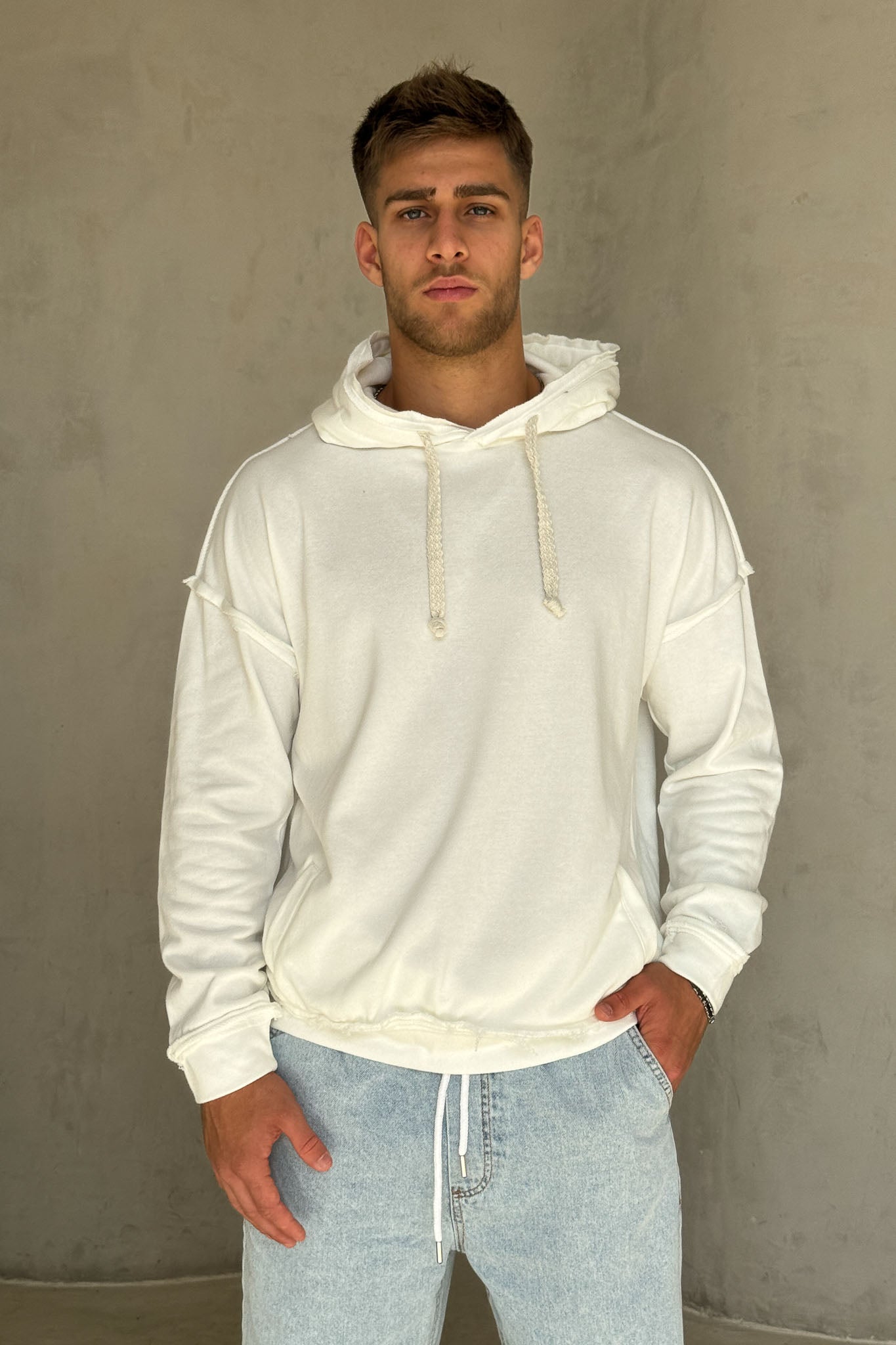 פוטר נעים ומדויק בגזרת אוברסייז עדינה, עם חוטי קשירה עבים בסגנון כבל שמוסיפים טוויסט ייחודי למראה. הקצוות הפרומים מעניקים וייב מעט מחוספס ומודרני, והבד הרך מספק נוחות מקסימלית לשימוש יומיומי. מושלם לשילוב עם ג׳ינס בהיר או מכנסי וופל ללוק אורבני קליל.