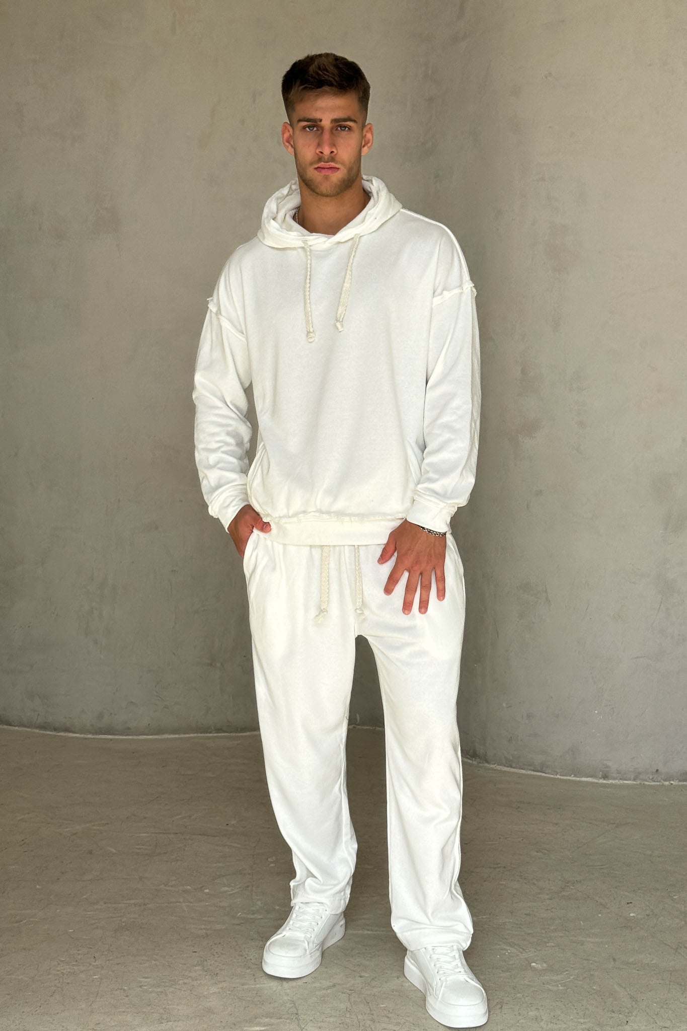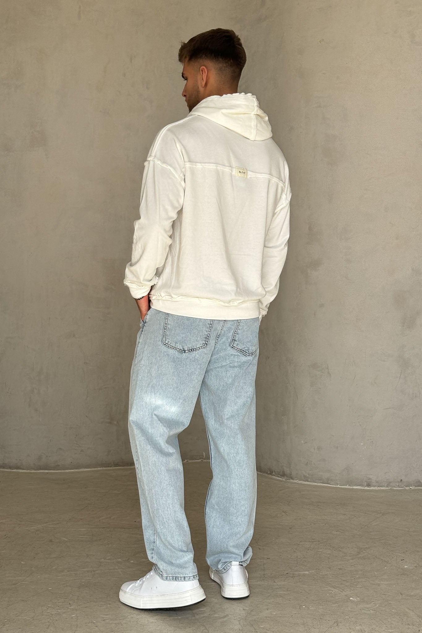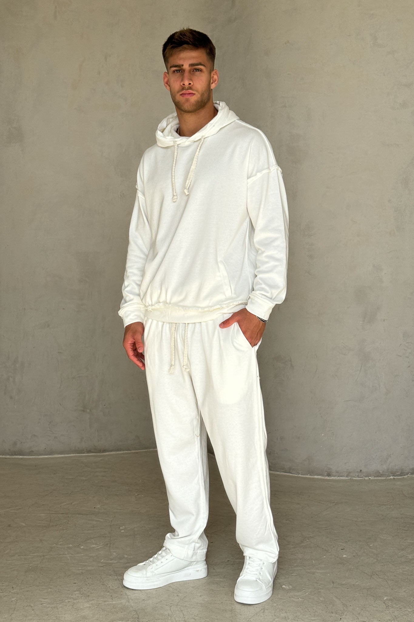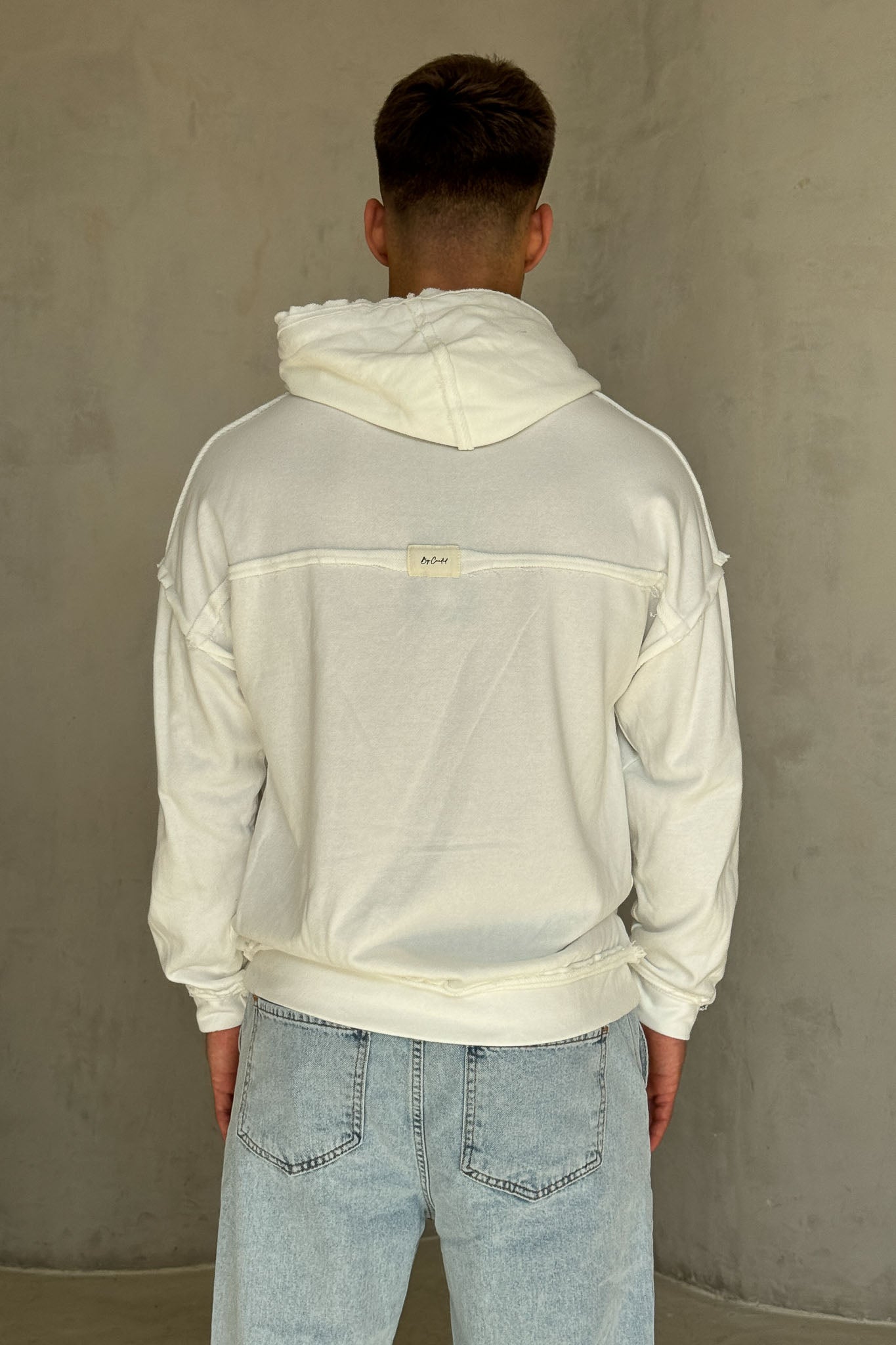 פוטר נעים ומדויק בגזרת אוברסייז עדינה, עם חוטי קשירה עבים בסגנון כבל שמוסיפים טוויסט ייחודי למראה. הקצוות הפרומים מעניקים וייב מעט מחוספס ומודרני, והבד הרך מספק נוחות מקסימלית לשימוש יומיומי. מושלם לשילוב עם ג׳ינס בהיר או מכנסי וופל ללוק אורבני קליל.