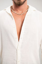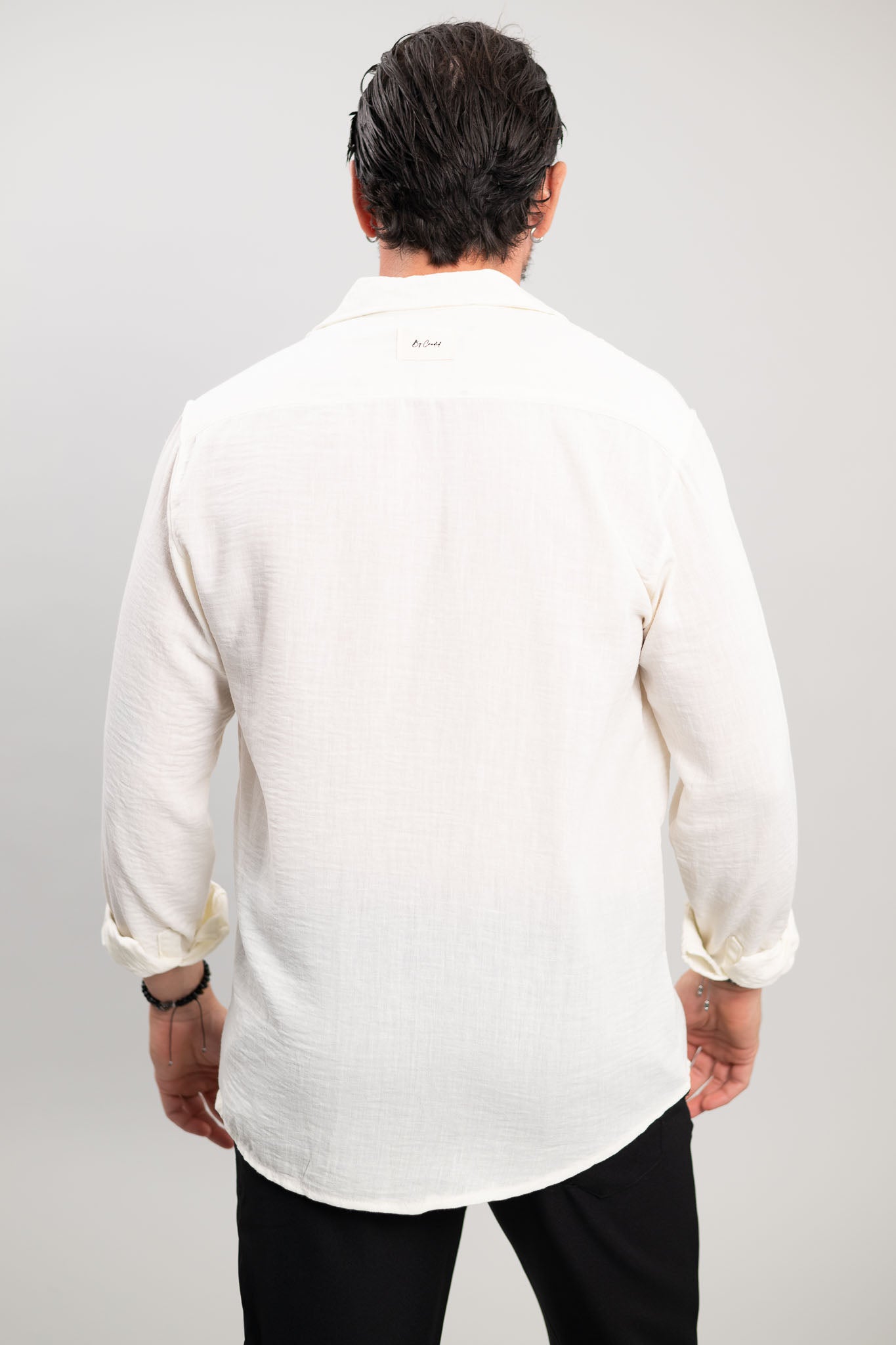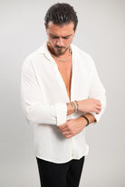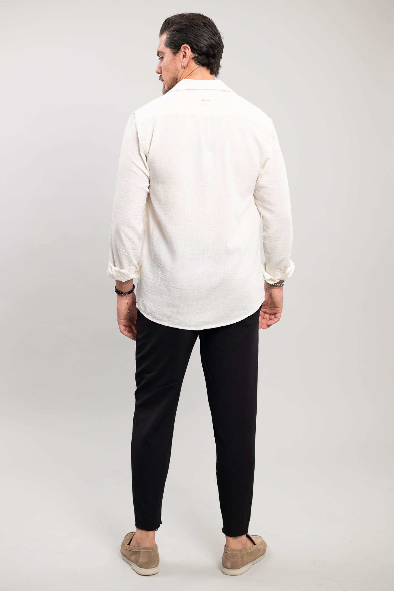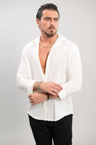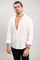 מכופתרת ארוכה בגזרת SLIM מבד פשתן נעים בצבע לבן.