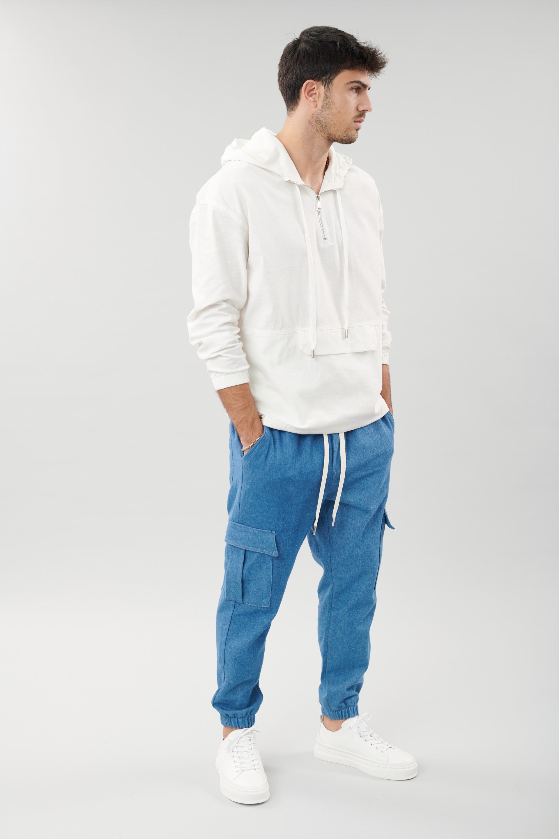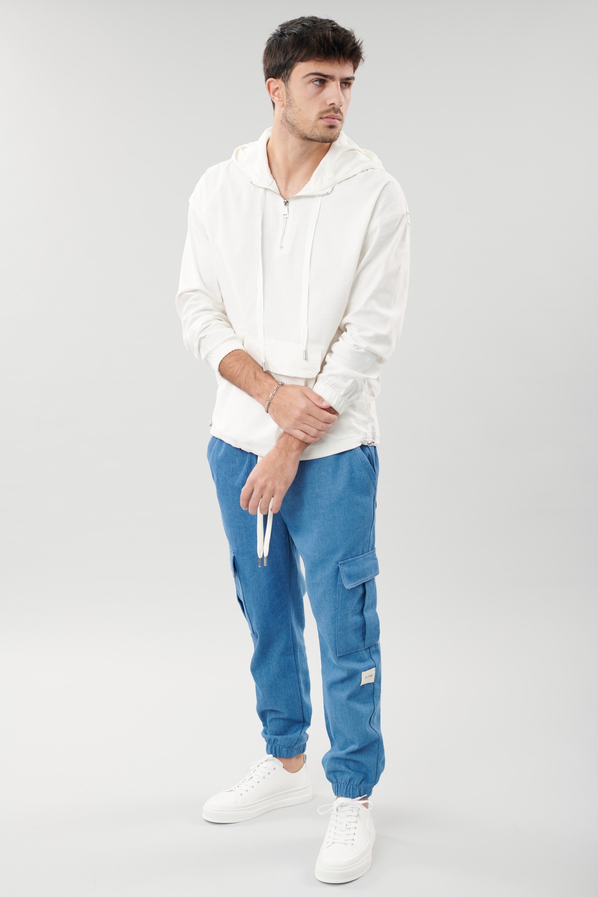 ג'קט קפוצ'ון עם שרוכים וריץ'רץ' , מתאים ללוק יום יומי , ניתן להקטין את רוחב החלק התחתון על ידי גומי , מגיע בצבע לבן