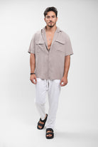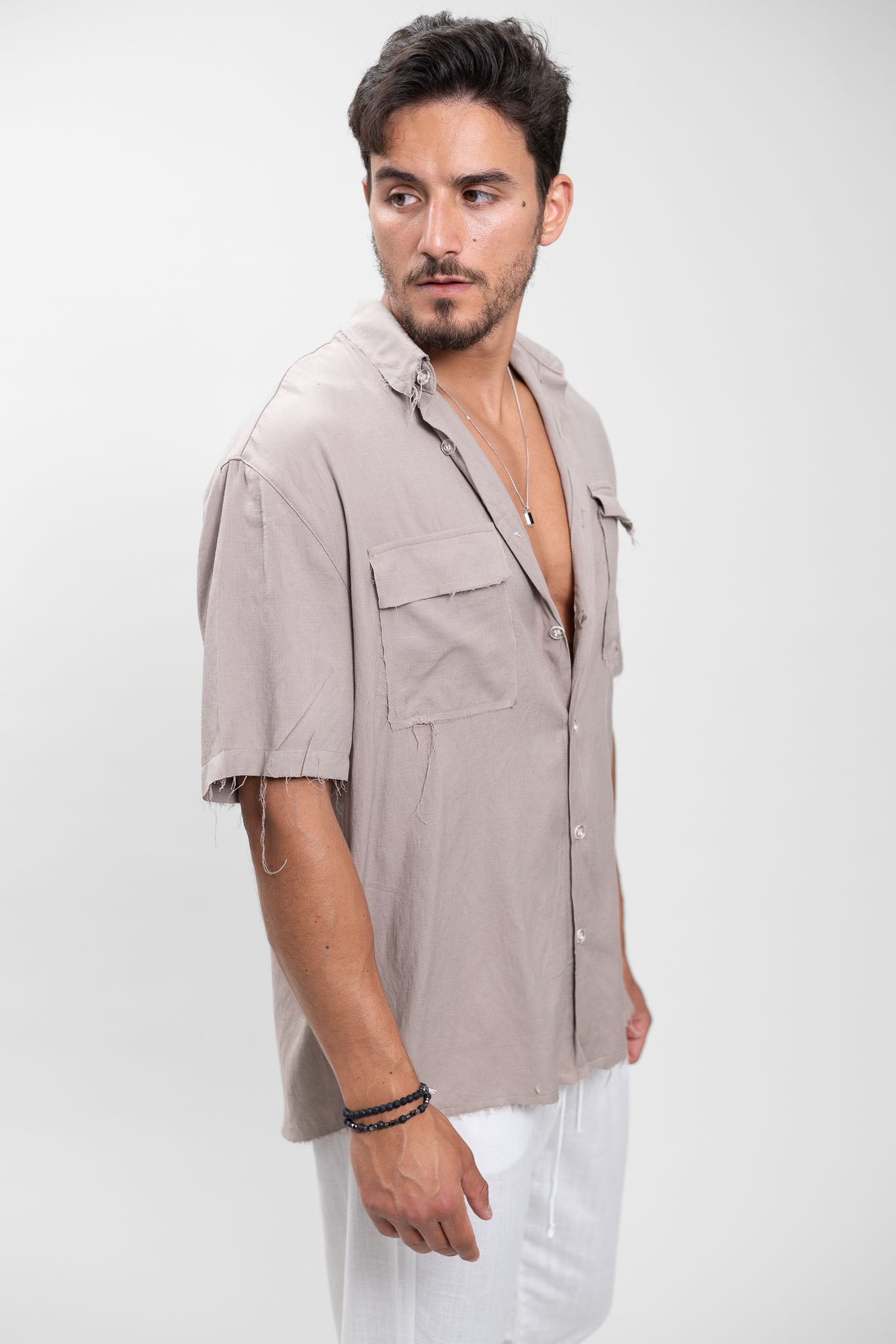 מידות הדוגמן : הדוגמן בגובה 1.79 שוקל 77 לובש מידה M מכופתרת קצרה בגזרת oversize עם צווארון קלאסי,