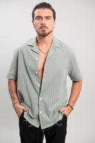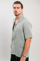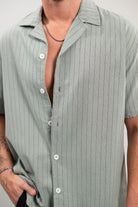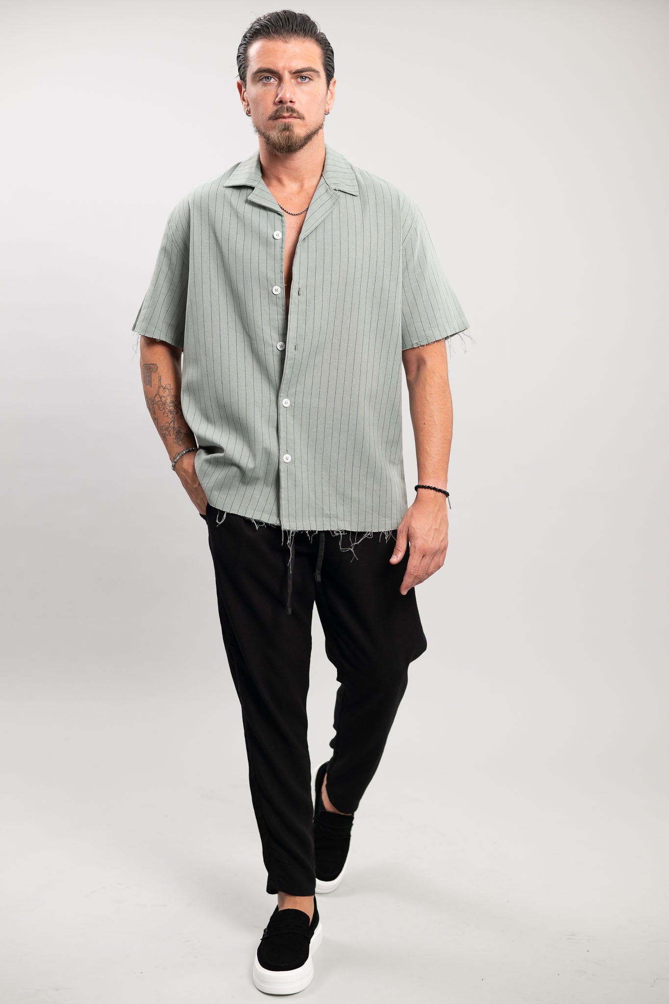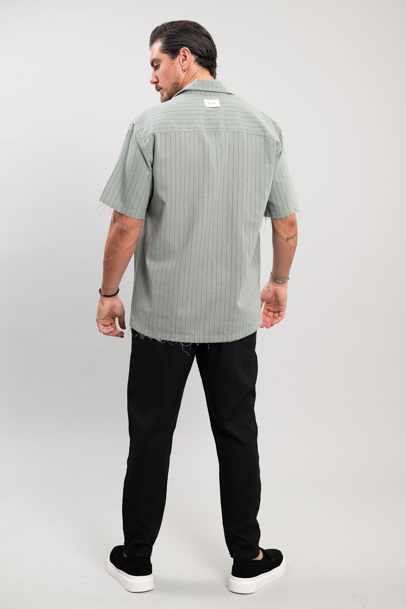 מידות הדוגמן - גובה 1.84 שוקל 80 מידה L מכופתרת בגזרת oversize מבד פשתן עם פסים נעים ונושם ,
