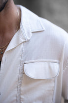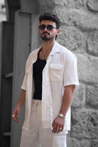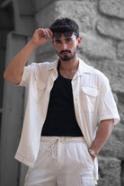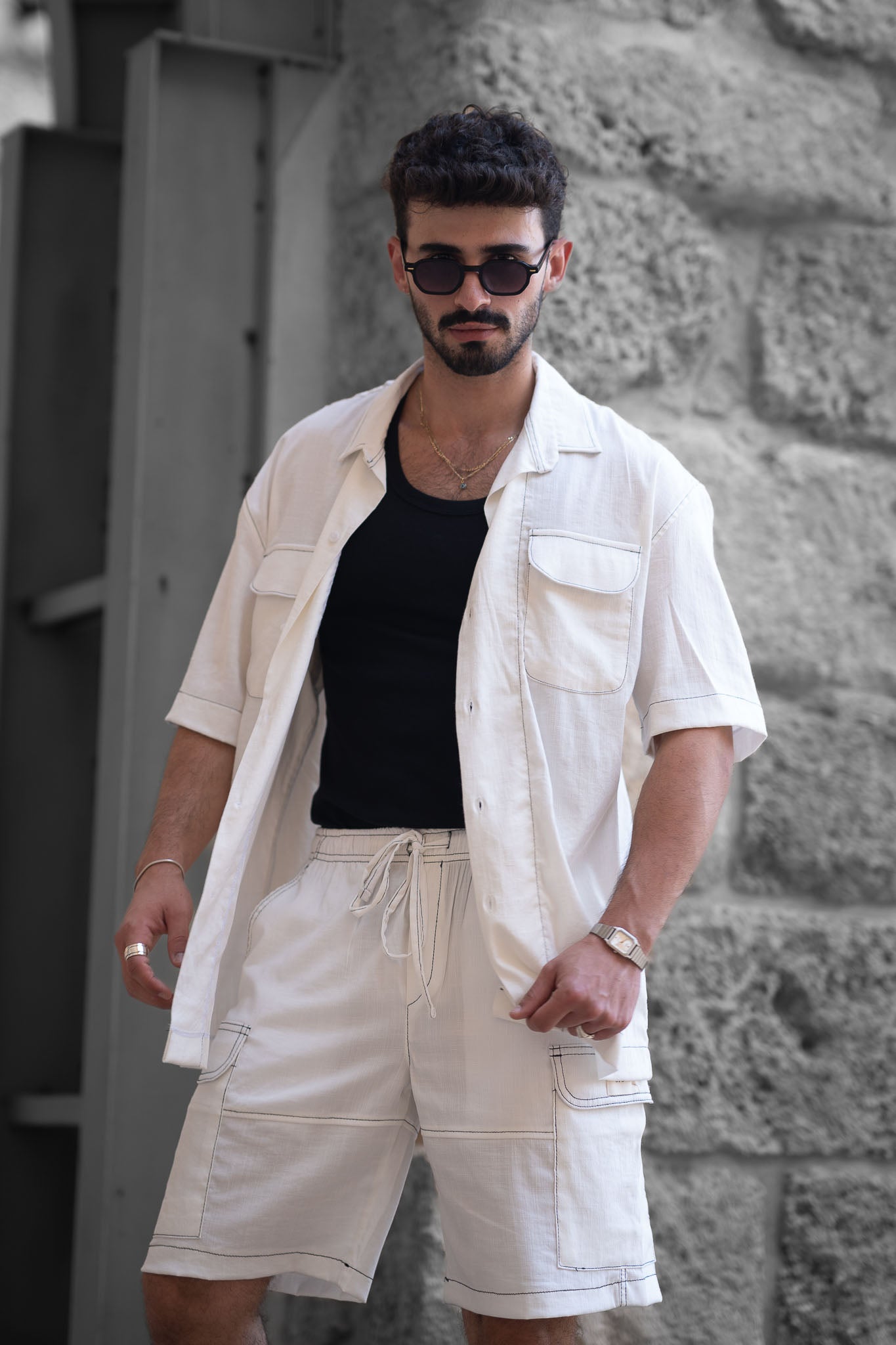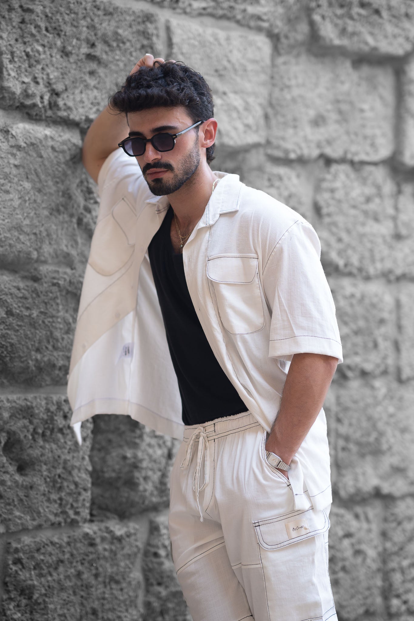 מידות הדוגמן - גובה 1.84 שוקל 80 מידה L מכופתרת קצרה בגזרת אוברסייז עשויה מבד פשתן אוורירי ואיכותי ,