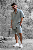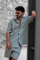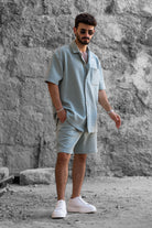 עם סיומת אנפיניש. החולצה מעוצבת כחלק מסט עם מכנסיים קצרים תואמים.