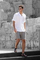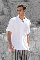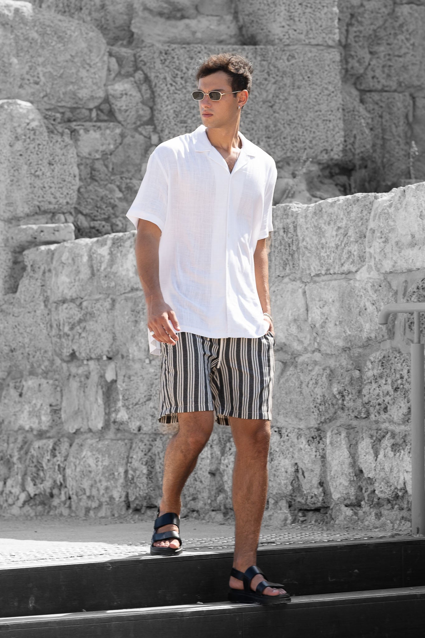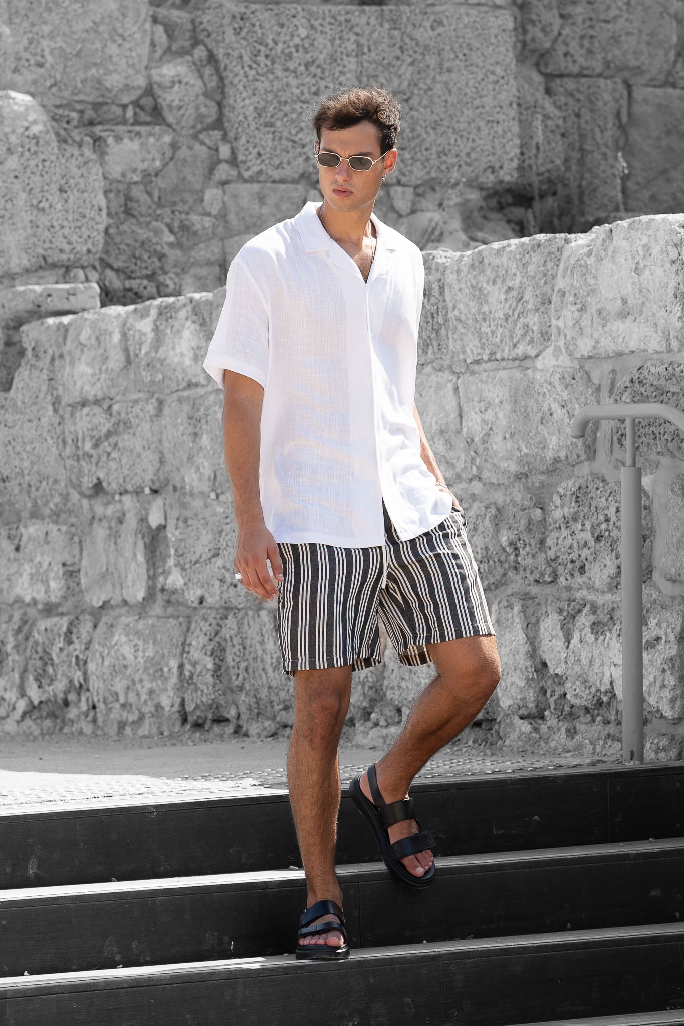 מידות הדוגמן - גובה 1.83 משקל 75 לובש מידה M מכופתרת קזואל קצרה בגזרת slim fit מבד פשתן רך ואוורירי.