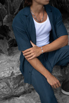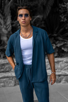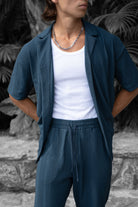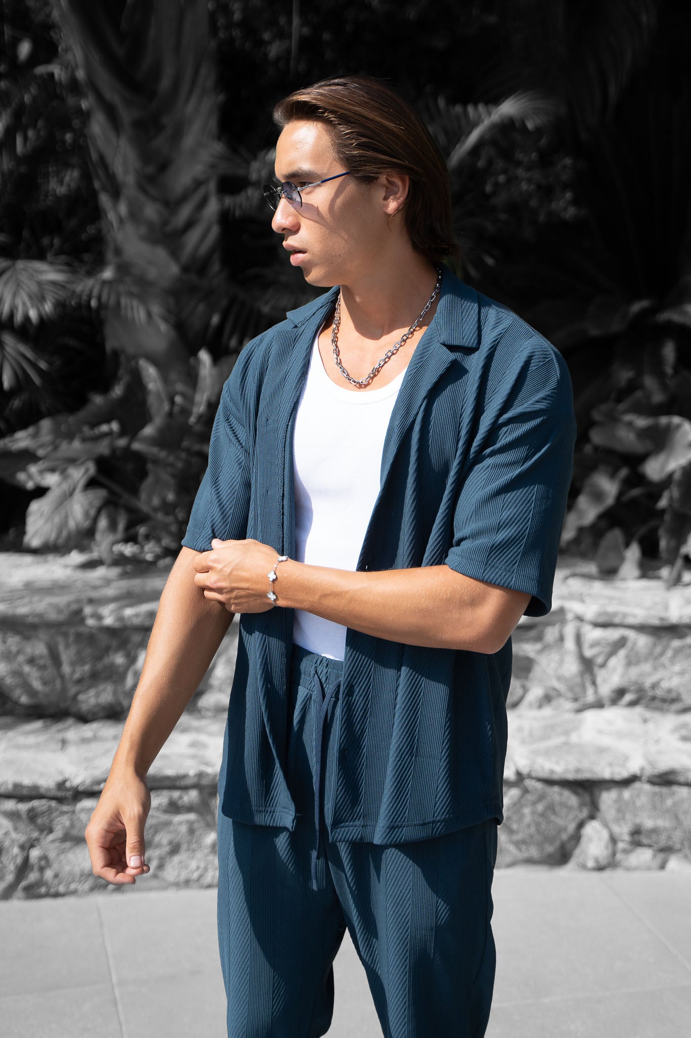 מכופתרת בגזרת אוברסייז קצרה, מבד איכותי ונעים עם טקסטורה החולצה מעוצבת כחלק מסט עם מכנסיים ארוכים תואמים.