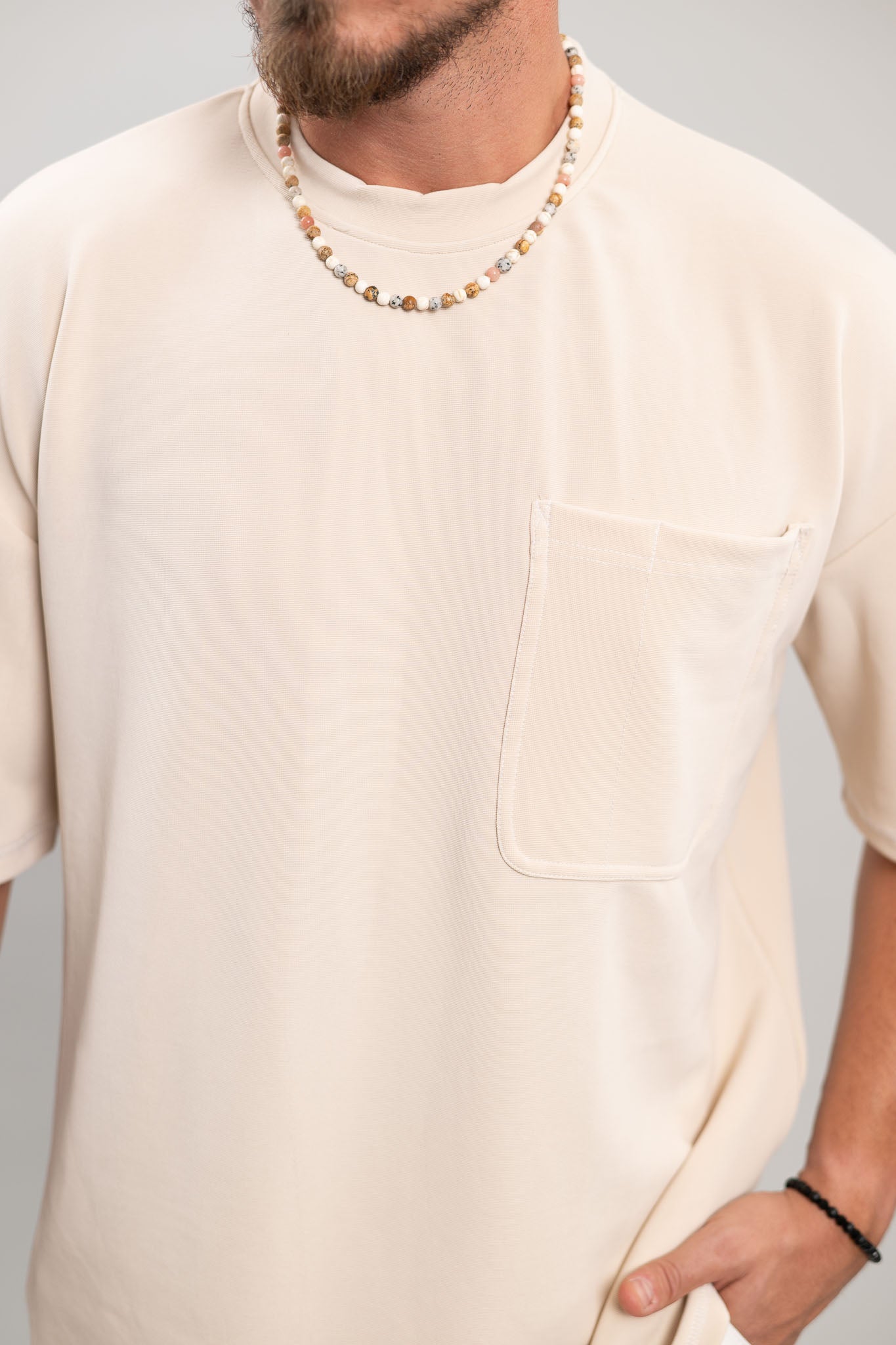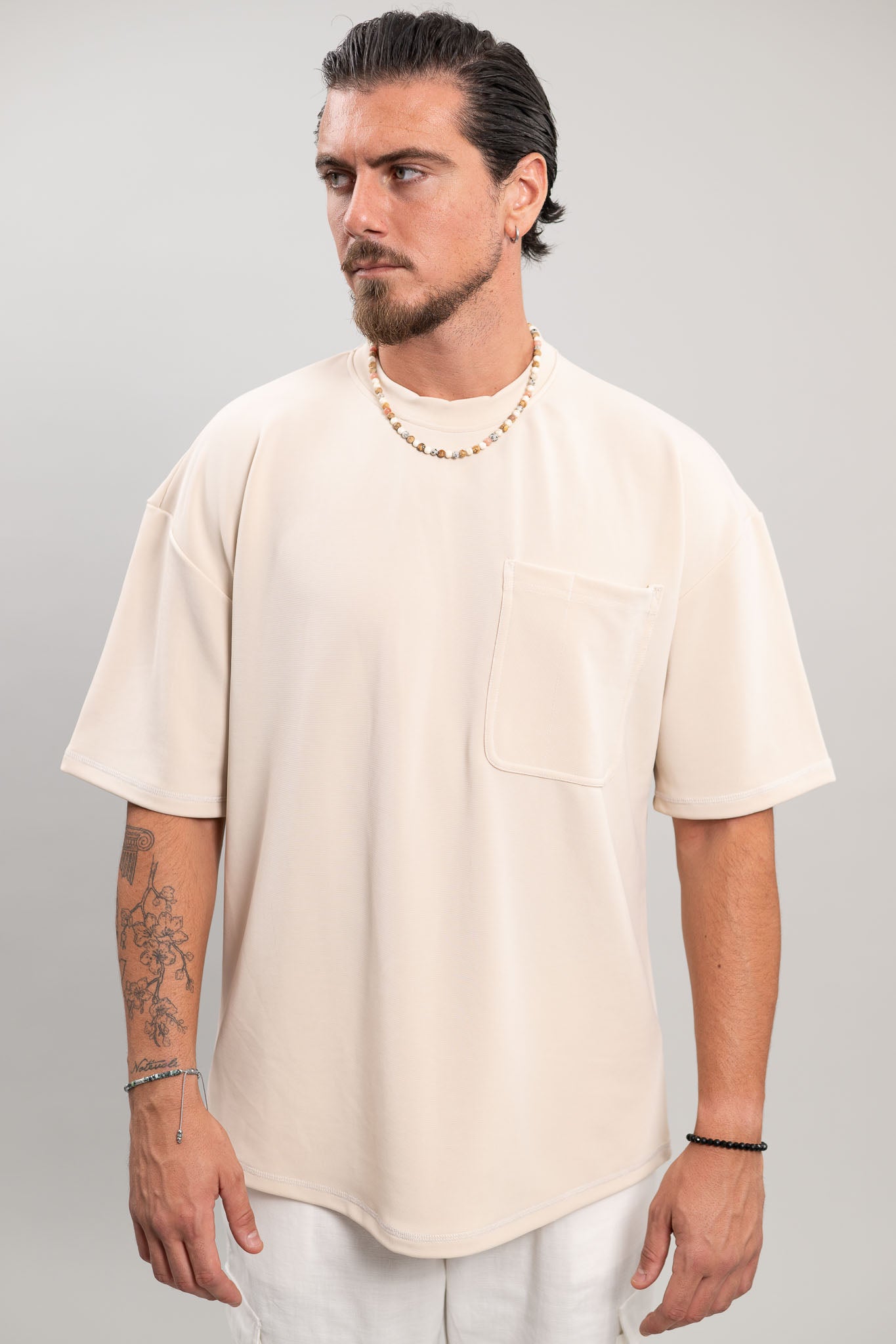 טי שרט קצרה בגזרת oversize , עם כיס מקדימה ותפרים בצבע לבן שיוצרים ניגוד עדין שיוצר מראה מתוחכם לחולצה ,
