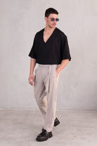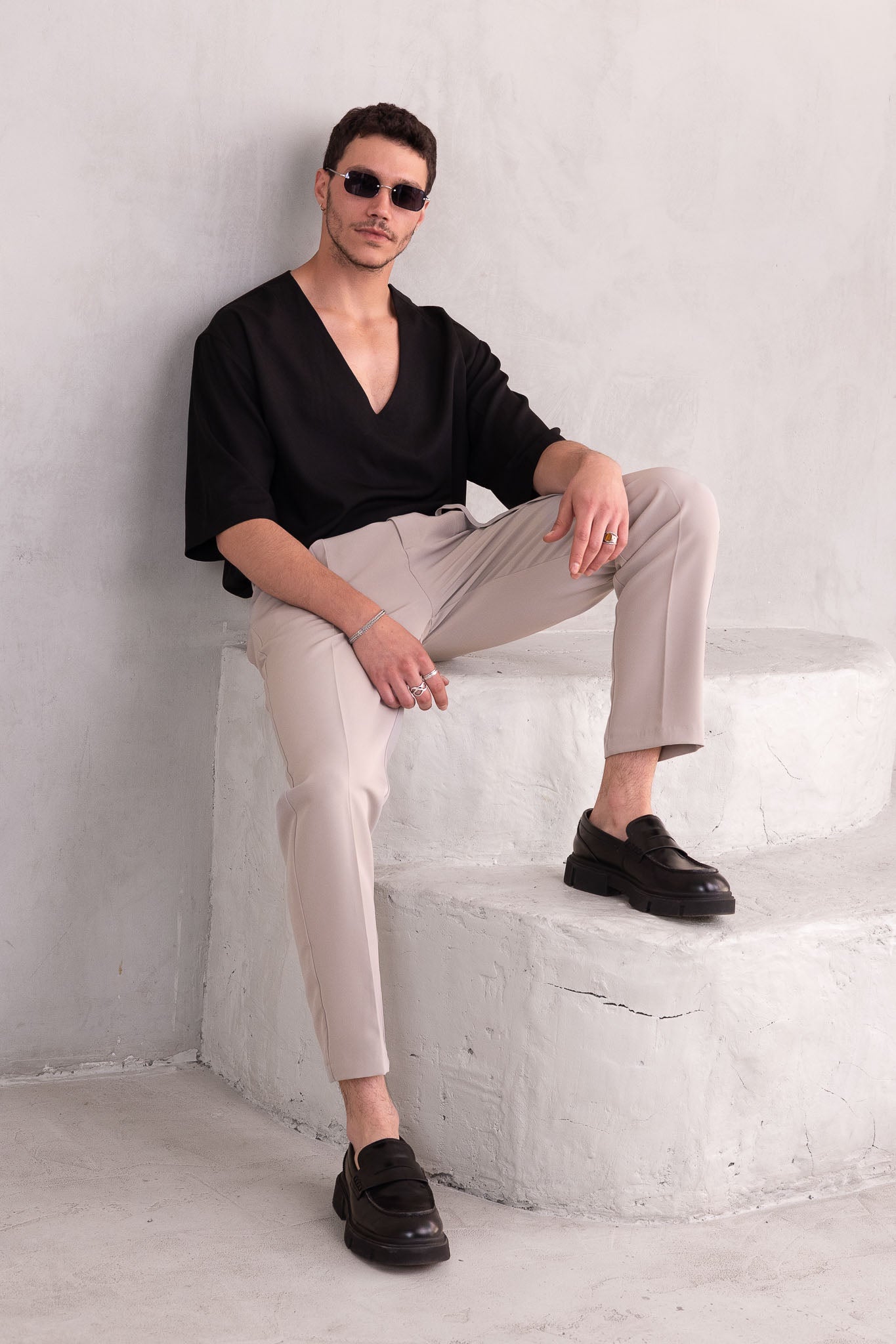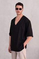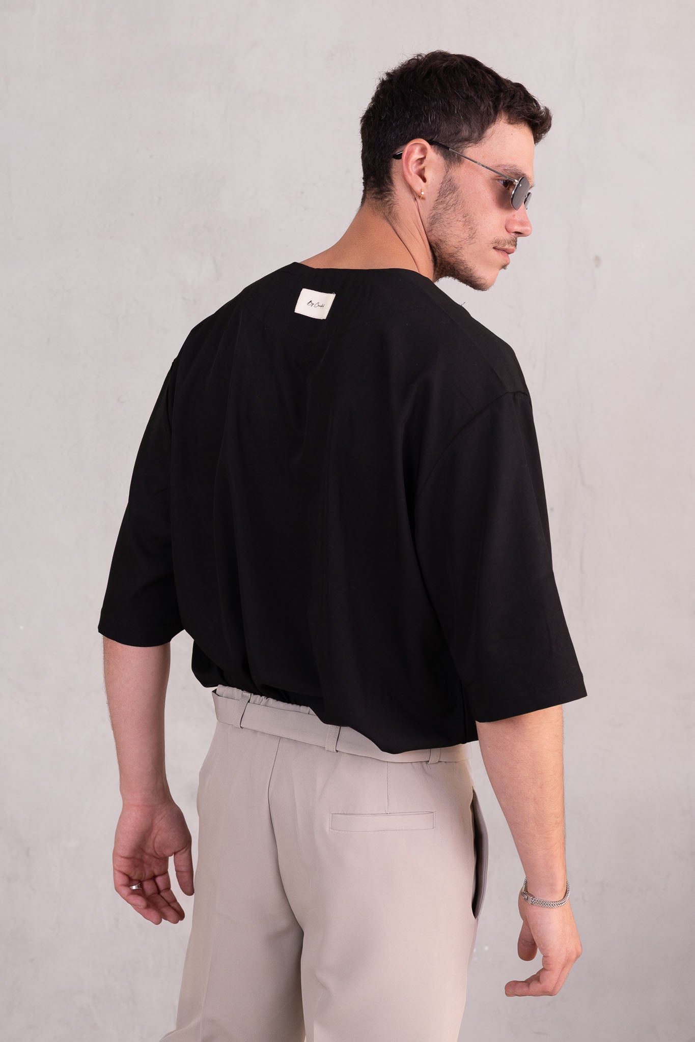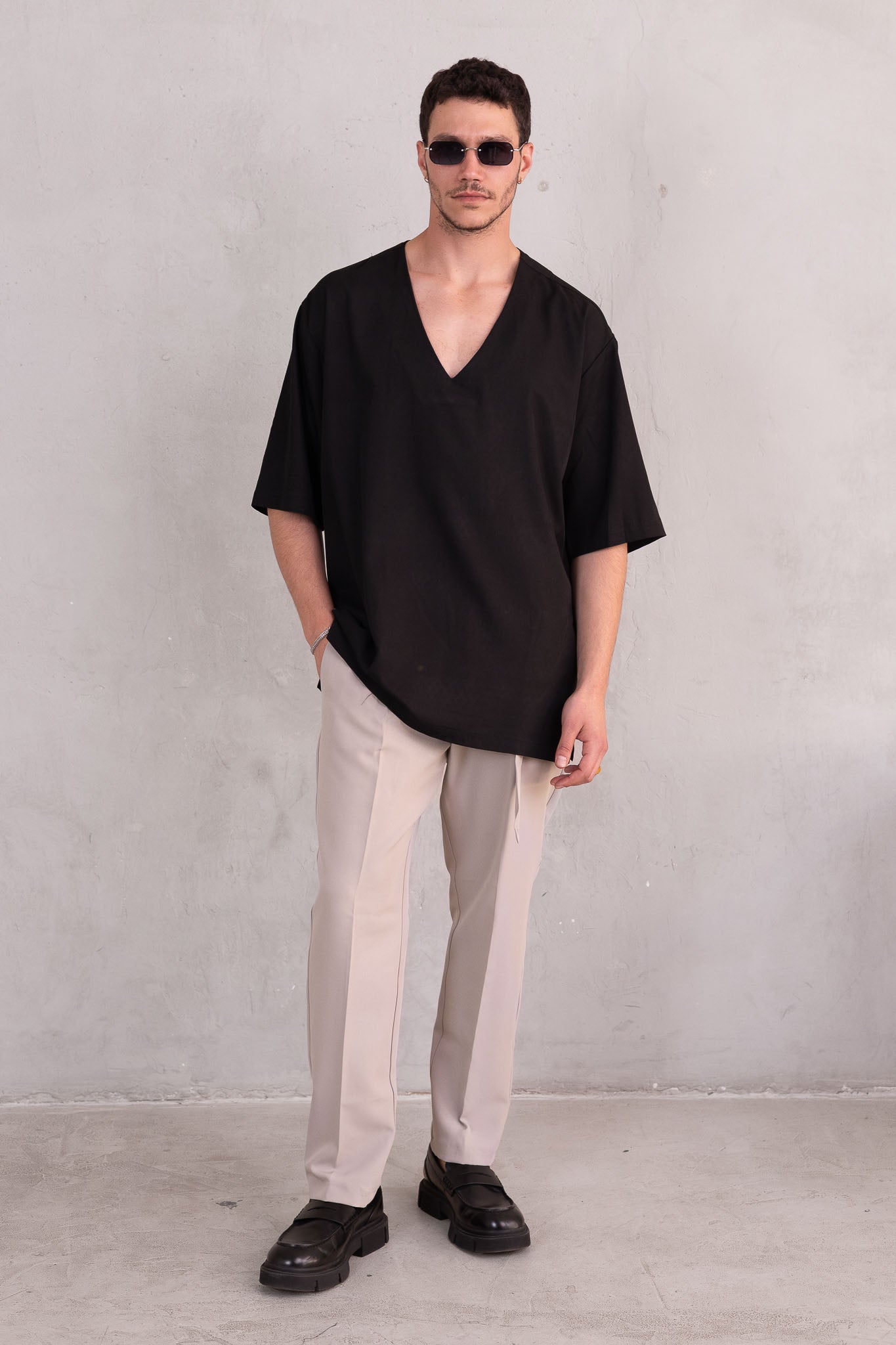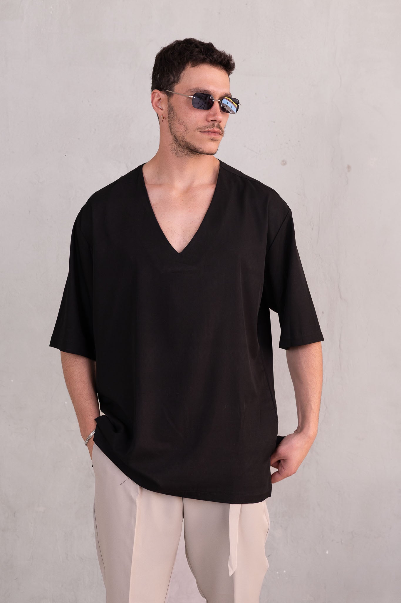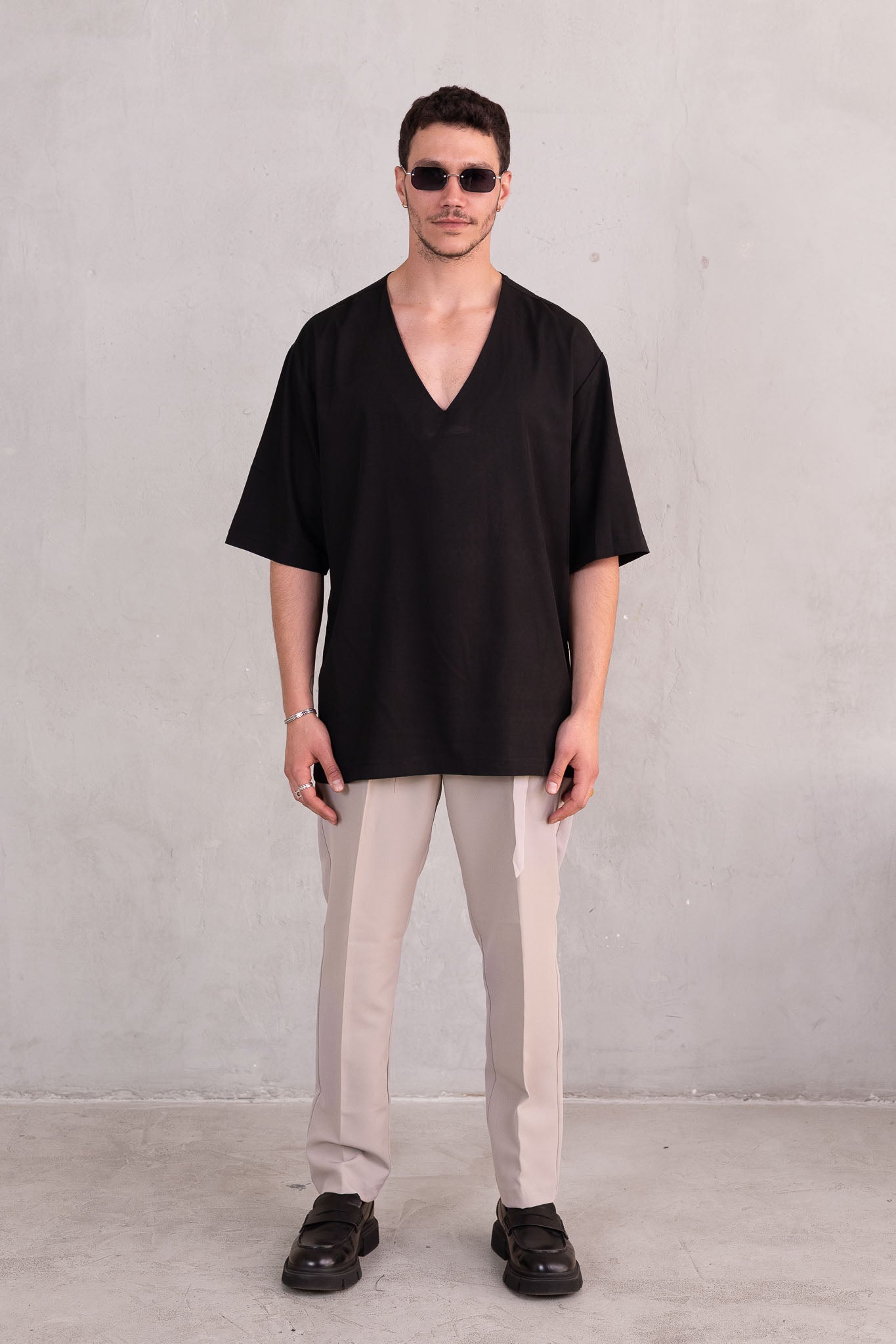 דוגמן בגובה 1.84 משקל 70 לובש מידה L  חולצה סופר אוברסייז מבד קליל עם צווארון פתוח וי, בגזרה רחבה שמעניקה נוחות וסטייל.