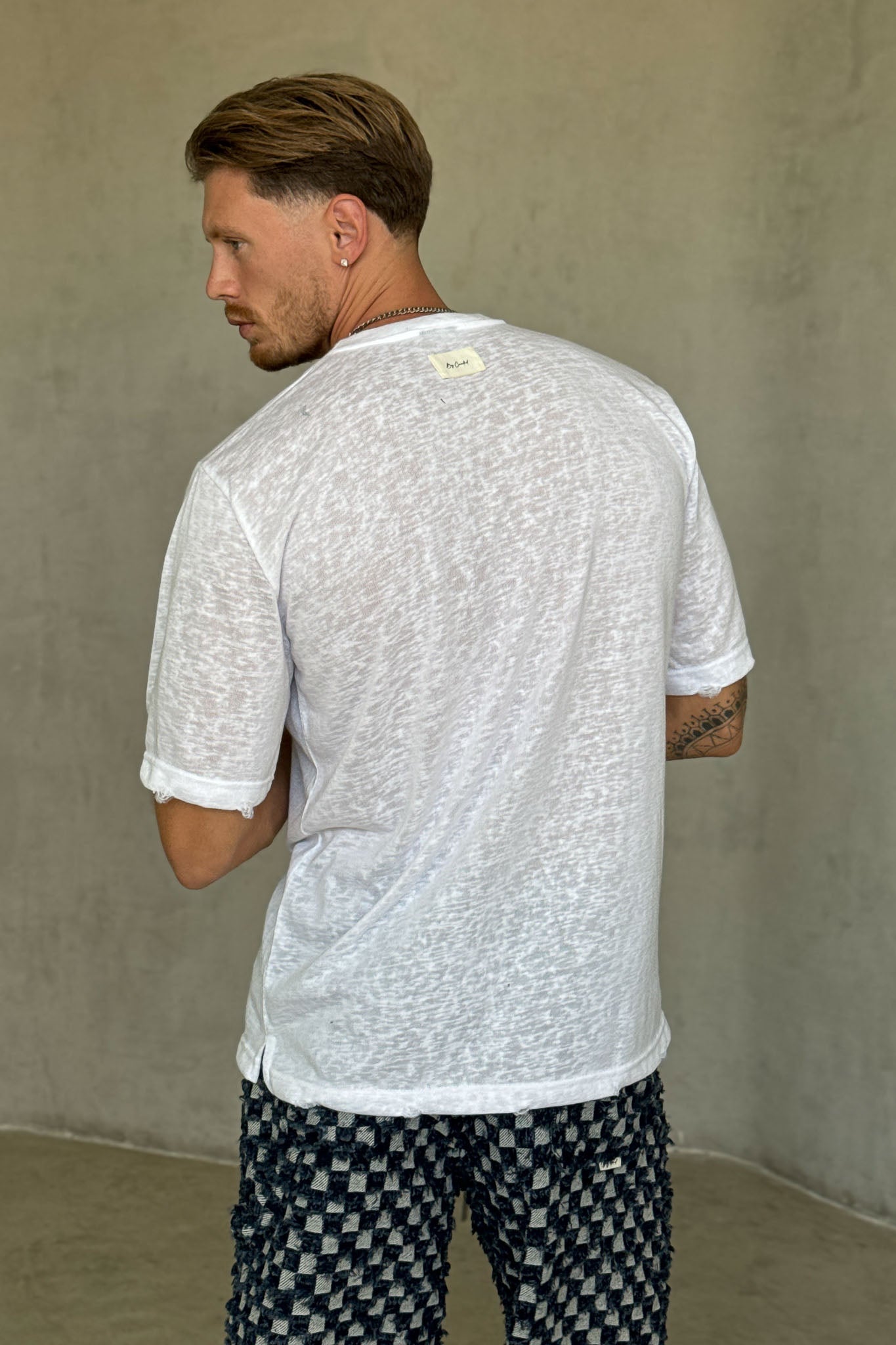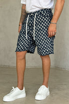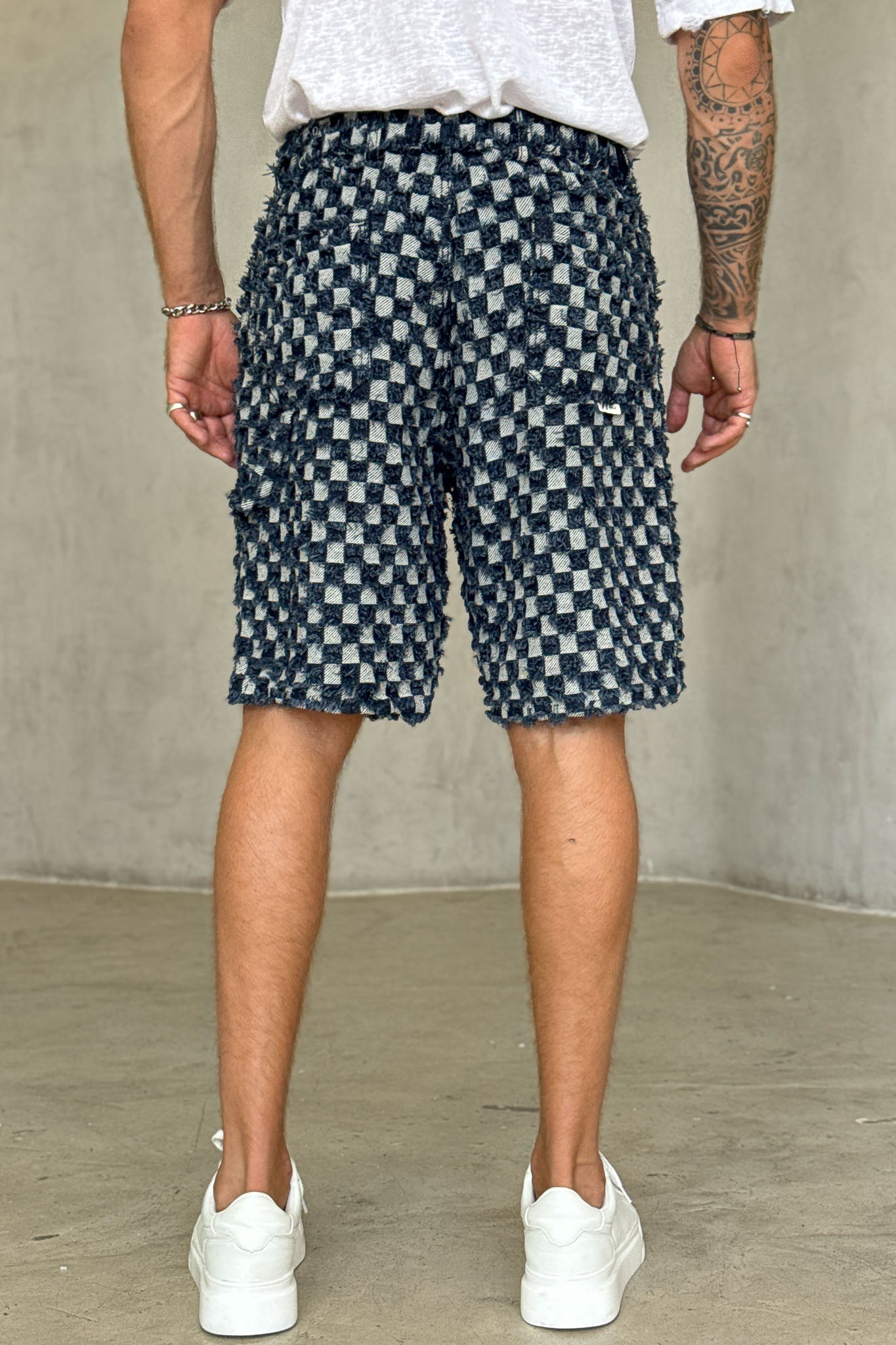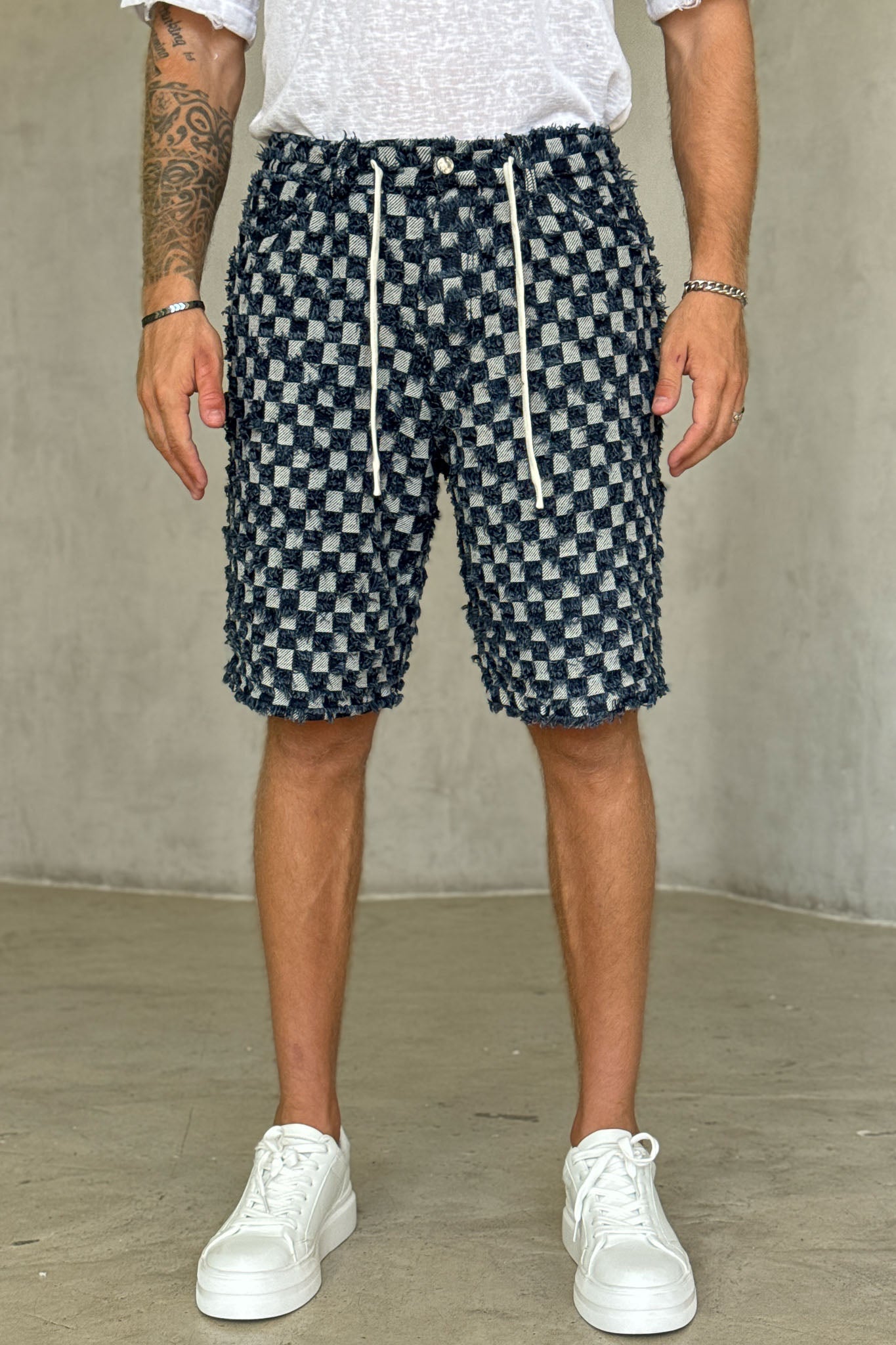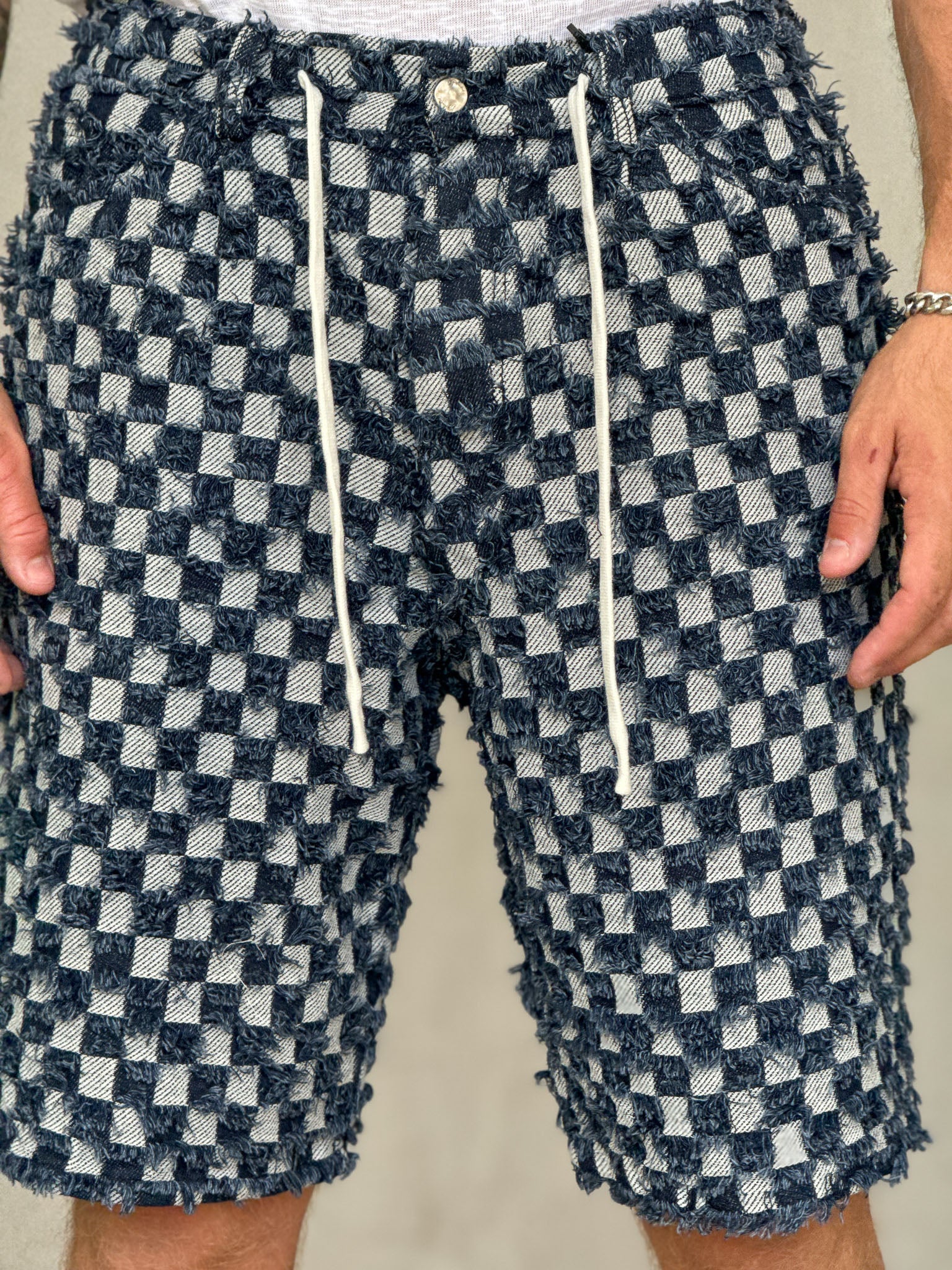 ג’ינס קצר בעיצוב ייחודי עם טקסטורת ריבועים ושרוכים בחזית, שמשלב בין סגנון רחוב עדכני לבין נוחות יומיומית. הבד האיכותי והגזרה המשוחררת מעניקים מראה מודרני, נועז ואופנתי. מושלם לשילוב עם טי-שירט או חולצת אוברסייז לסטייל בולט ולא מתאמץ.