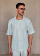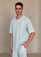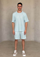 דוגמן בגובה 1.84 משקל 70 לובש מידה L חולצת קצרה אוברסייז, עם עיצוב פשוט ואוורירי שמספק מראה קליל ונעים.