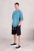 דוגמן בגובה 1.84 משקל 70 לובש מידה L חולצת קצרה אוברסייז, עם עיצוב פשוט עם הדפס מקדימה ומאחורה שמספק מראה קליל ונעים.