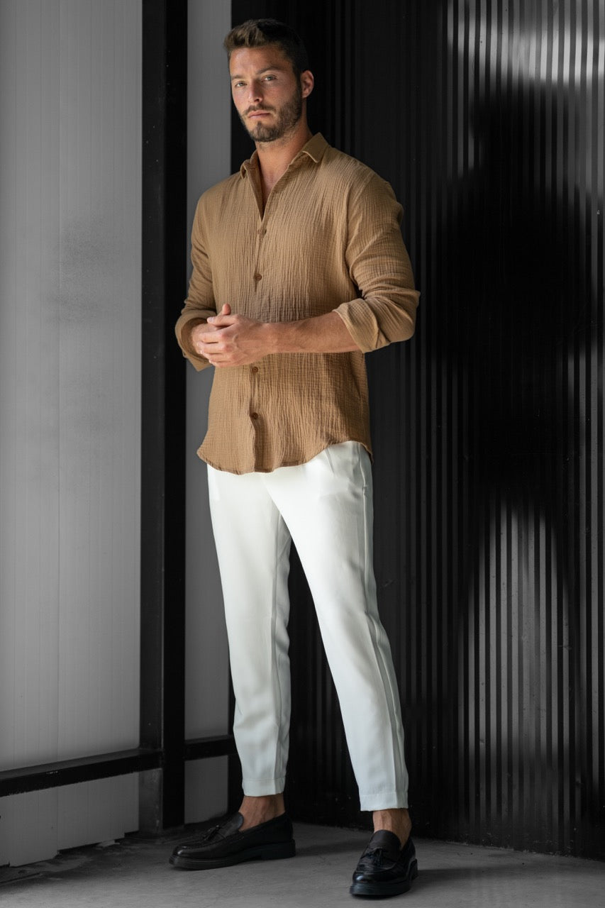 מכנס בגזרה רגילה ולא צמודה לגוף. עם שני כיסים קדמיים ושני כיסים מאחורה עם סגירת כפתור מקדימה,