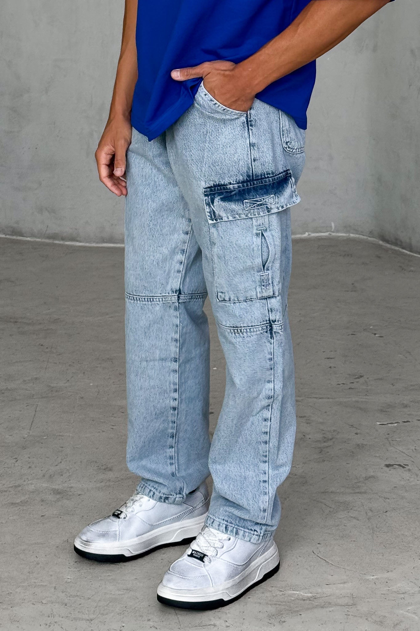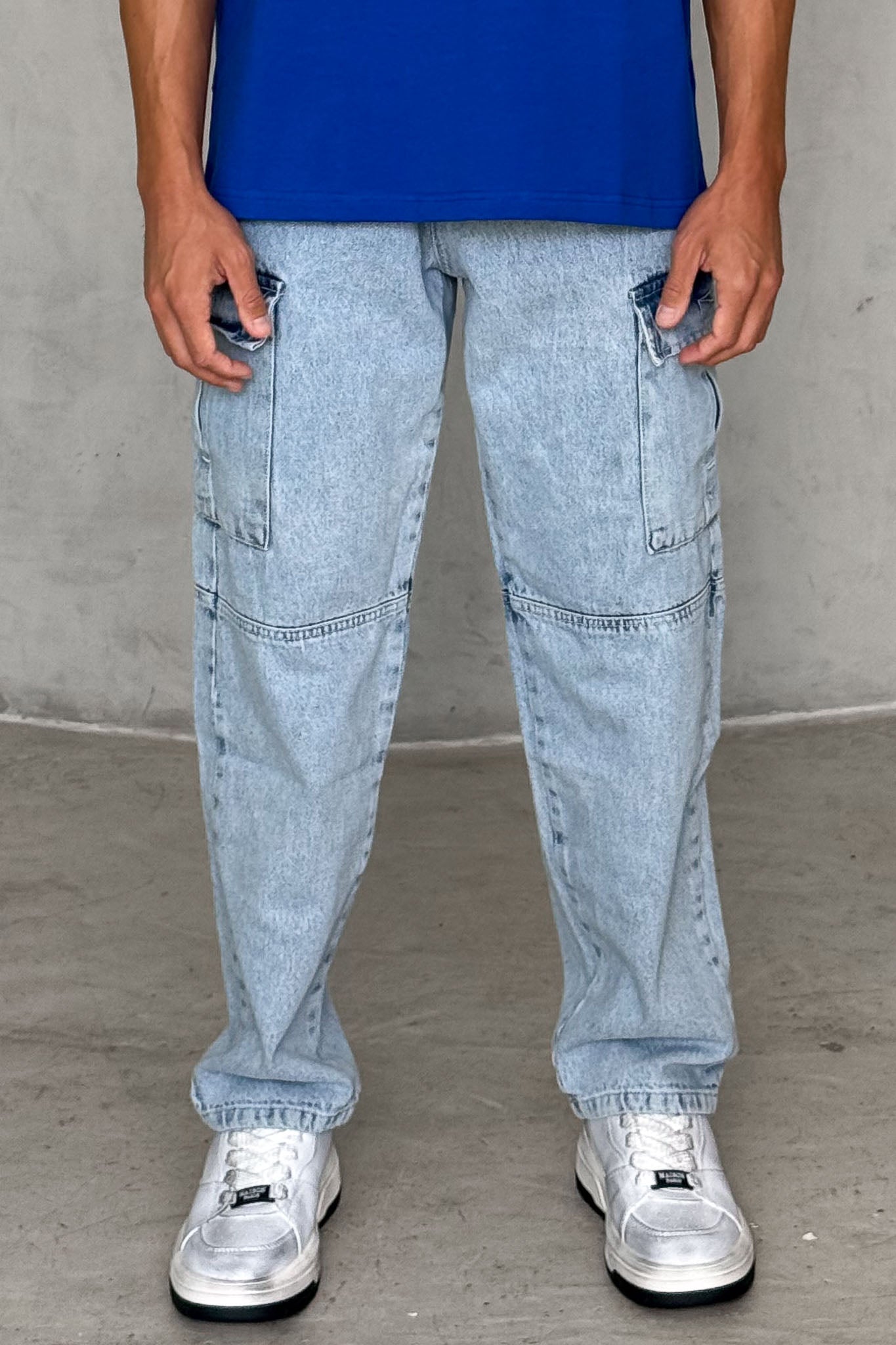ג׳ינס כחול קלאסי עם גזרה ישרה וטאץ׳ מחוספס.