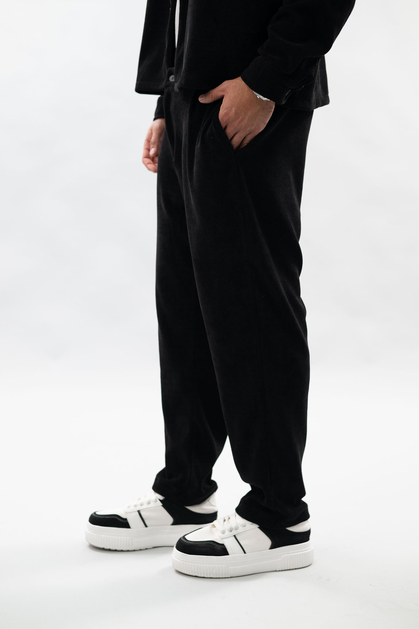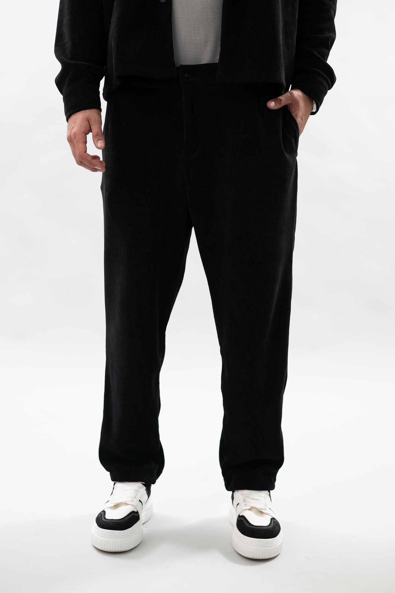 מכנסיים ארוכים בגזרת oversize, עשויים מבד סריג קורדרוי איכותי שמספק נוחות מקסימלית.