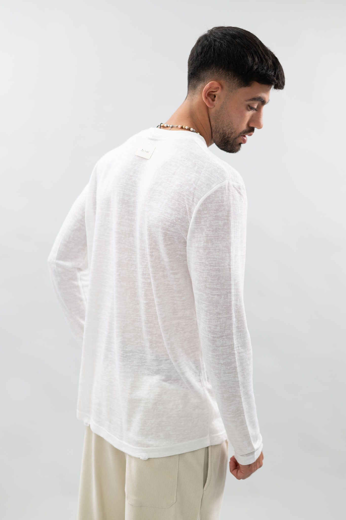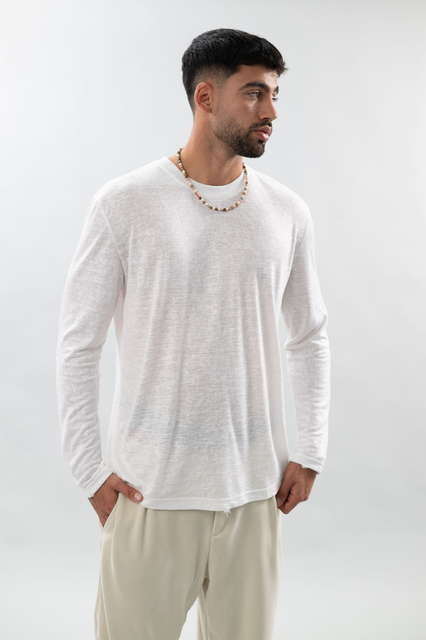 טי שרט בגזרת רגולר עם שרוולים ארוכים, עשויה מבד סלב פשתן, בשילוב קרעים שמוסיפים טוויסט ייחודי ומודרני.