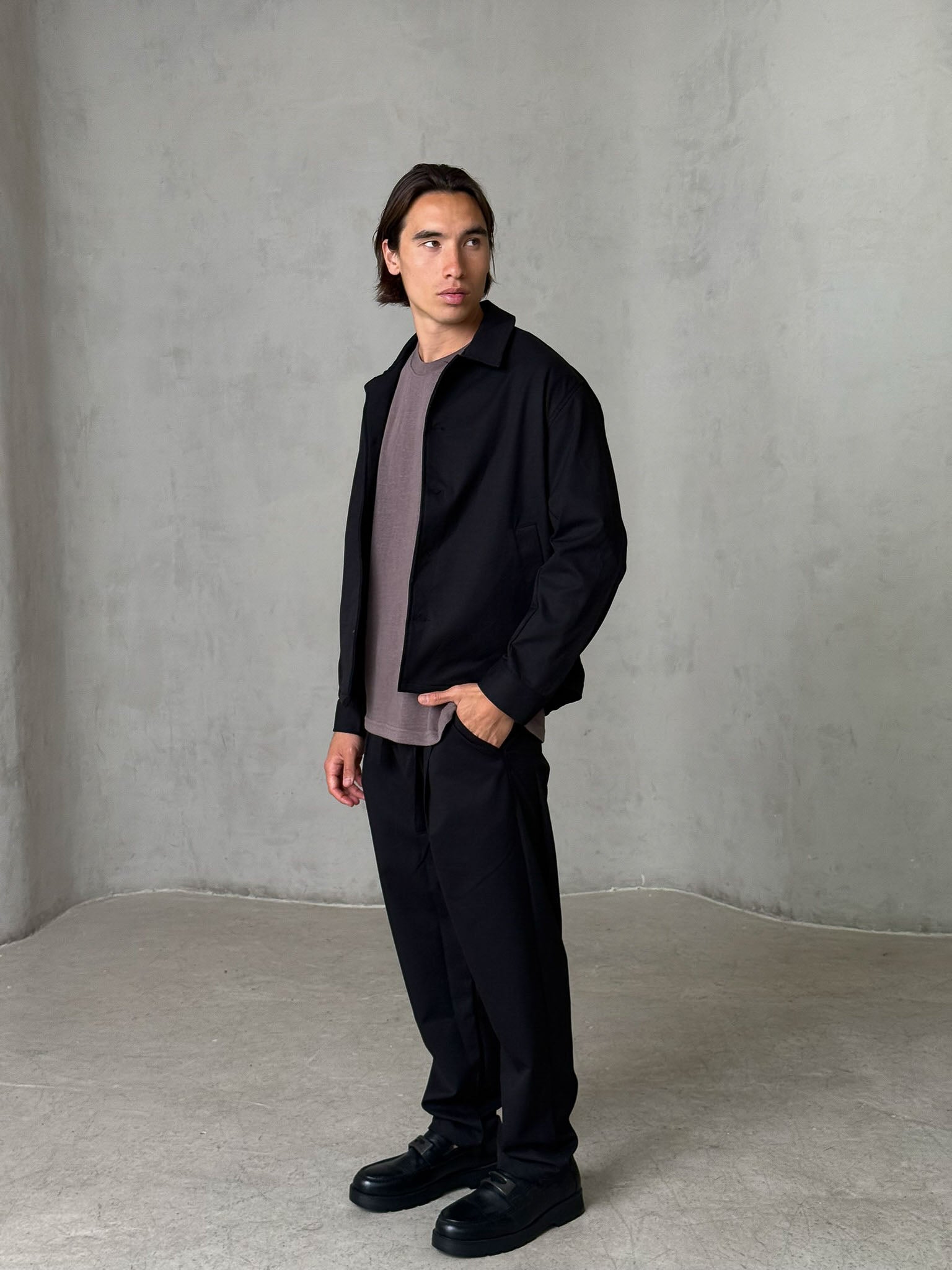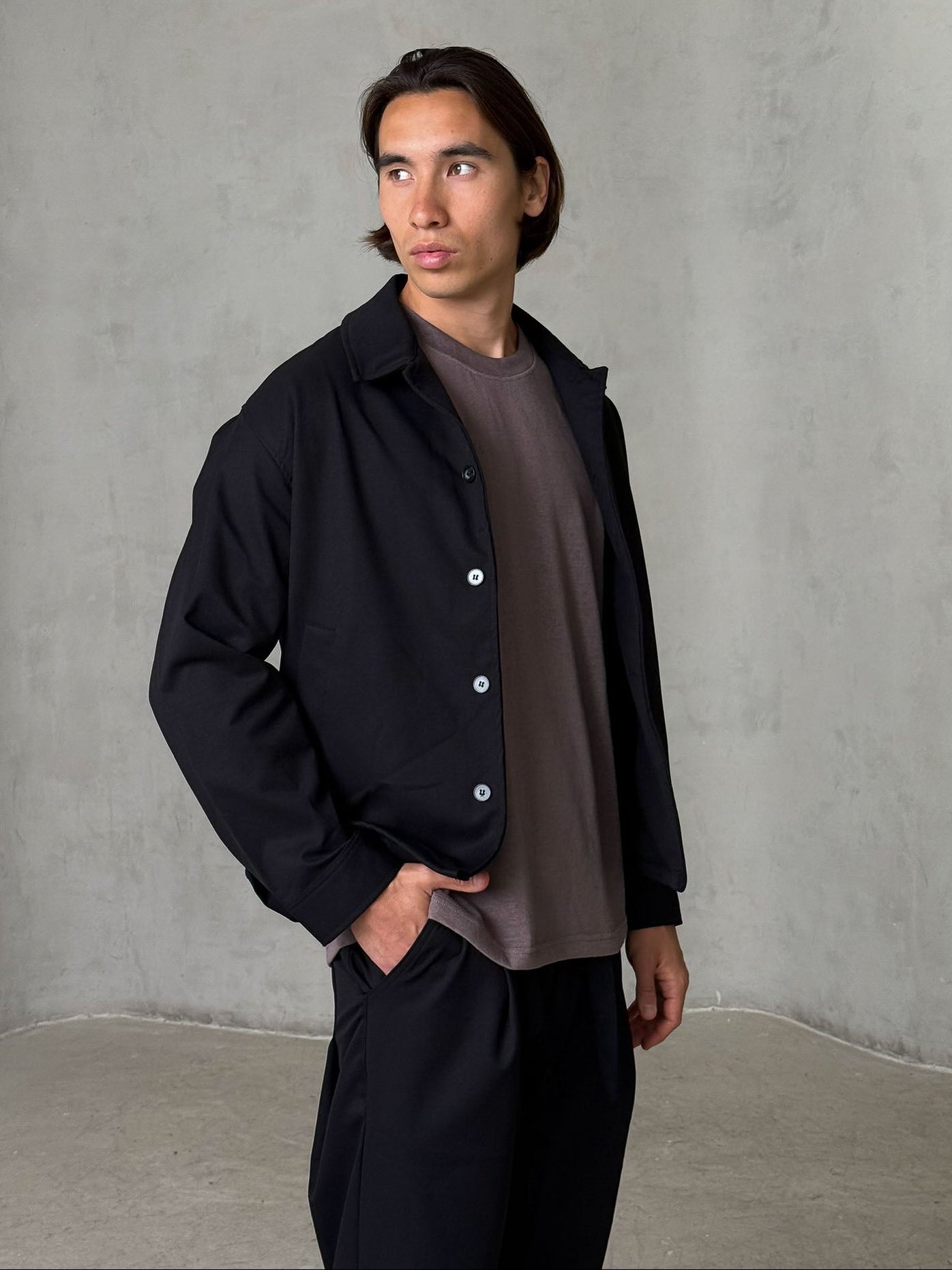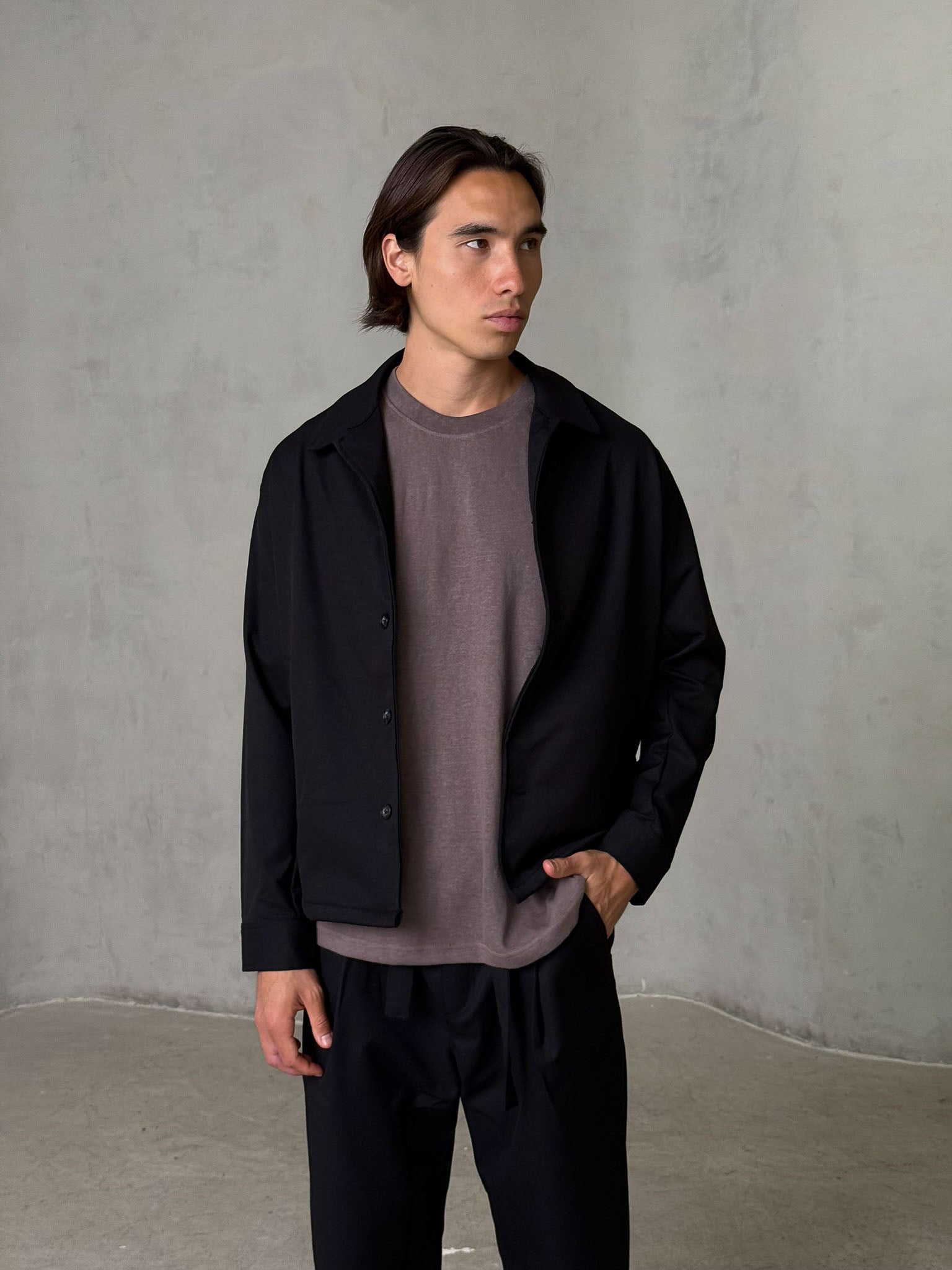 בד חלק עם נפילה טבעית שנותן לוק מדויק בין מכופתרת לג׳קט קל – מושלם לשכבות יומיומיות.