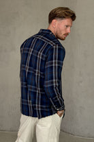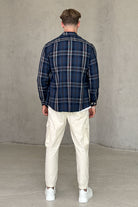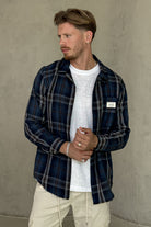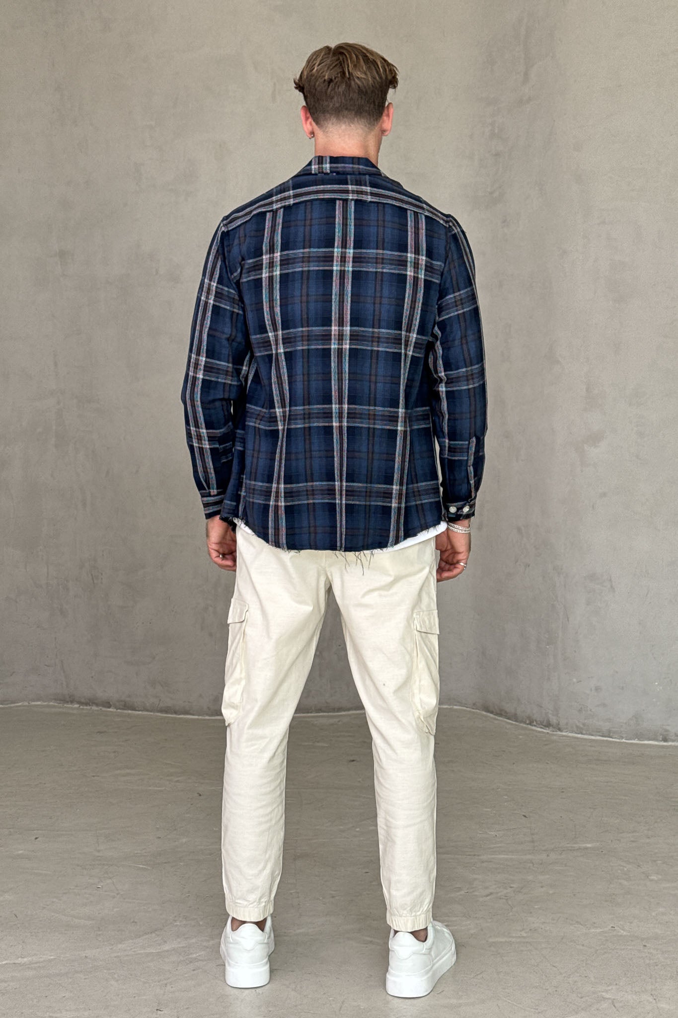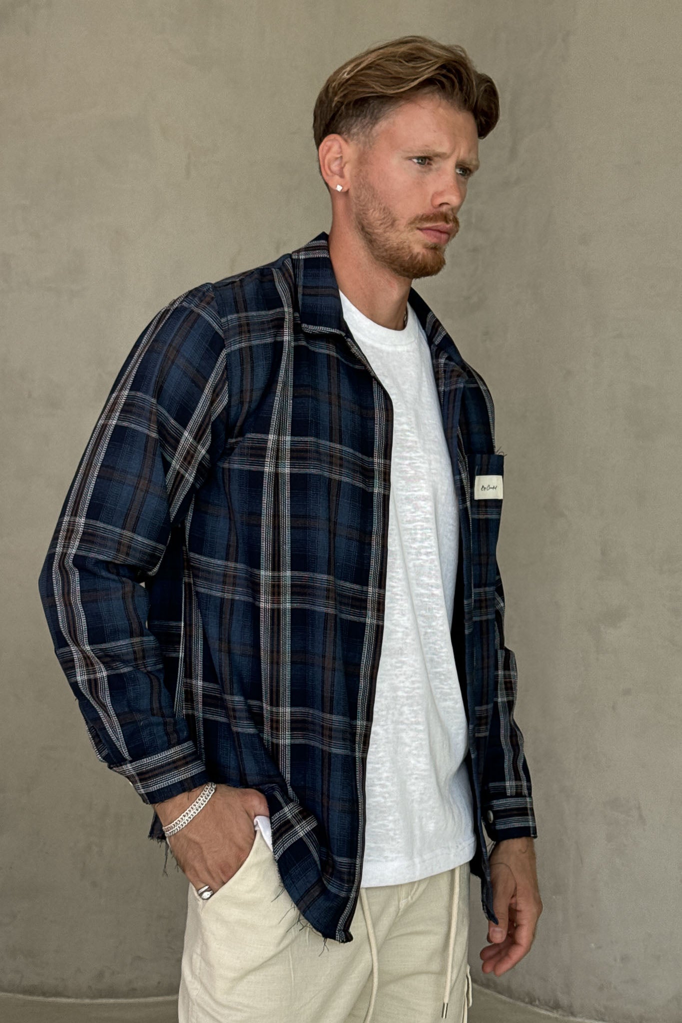 עליונית משובצת בגווני כחול-חום עם כפתורים ולוגו עדין על החזה.