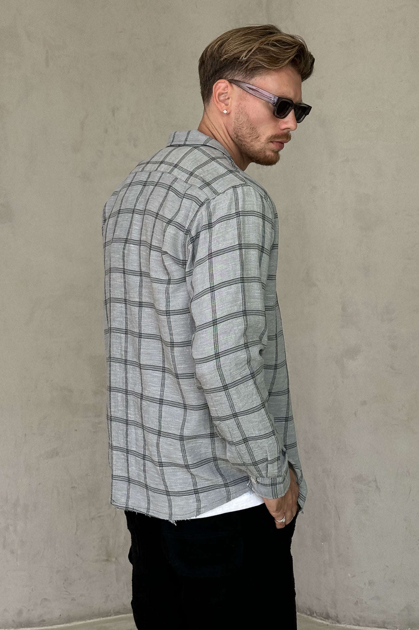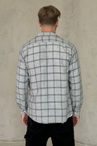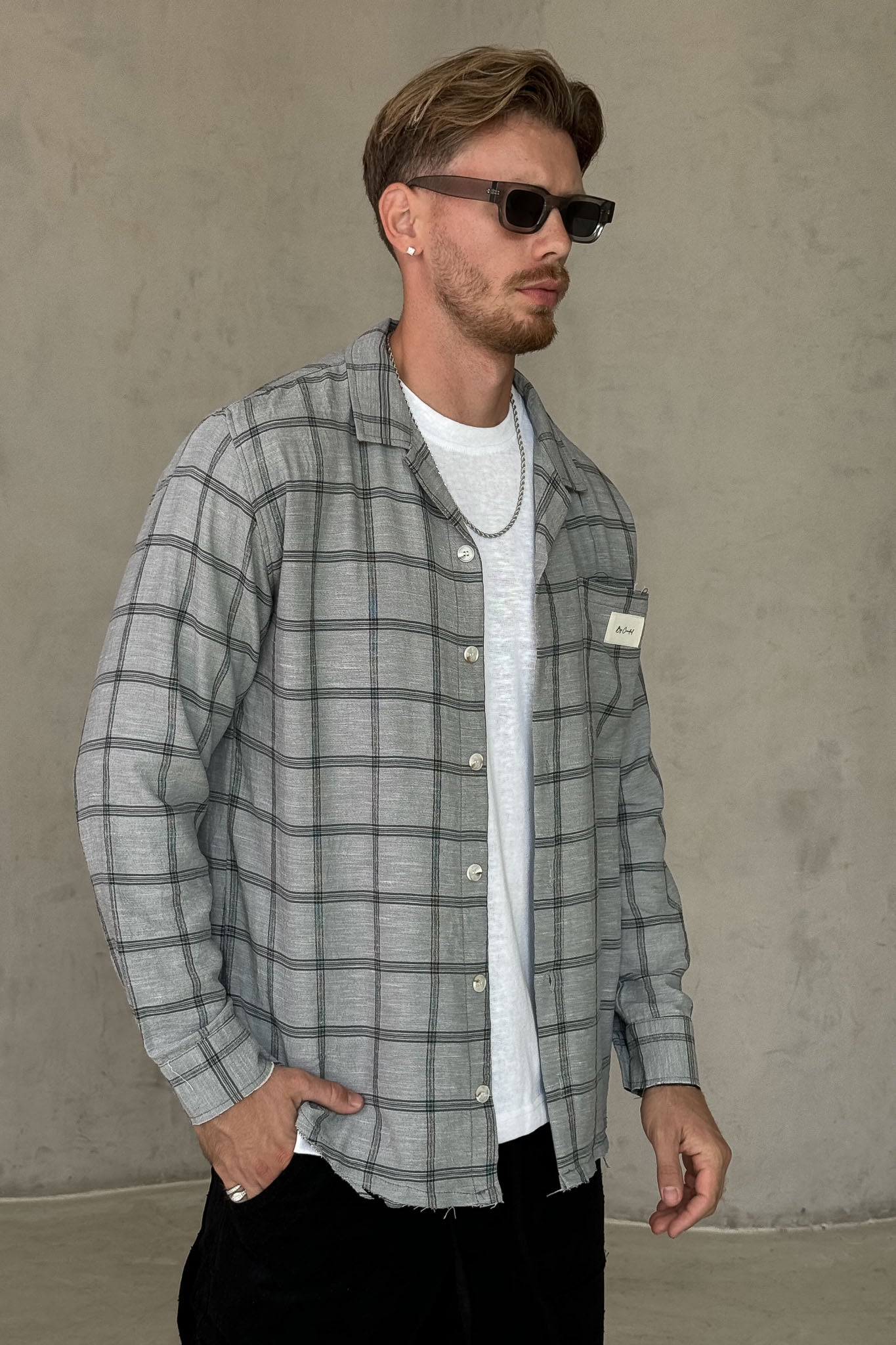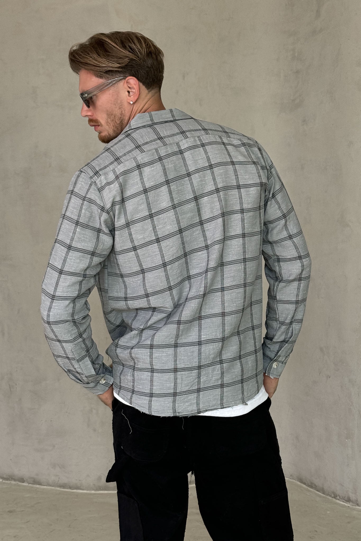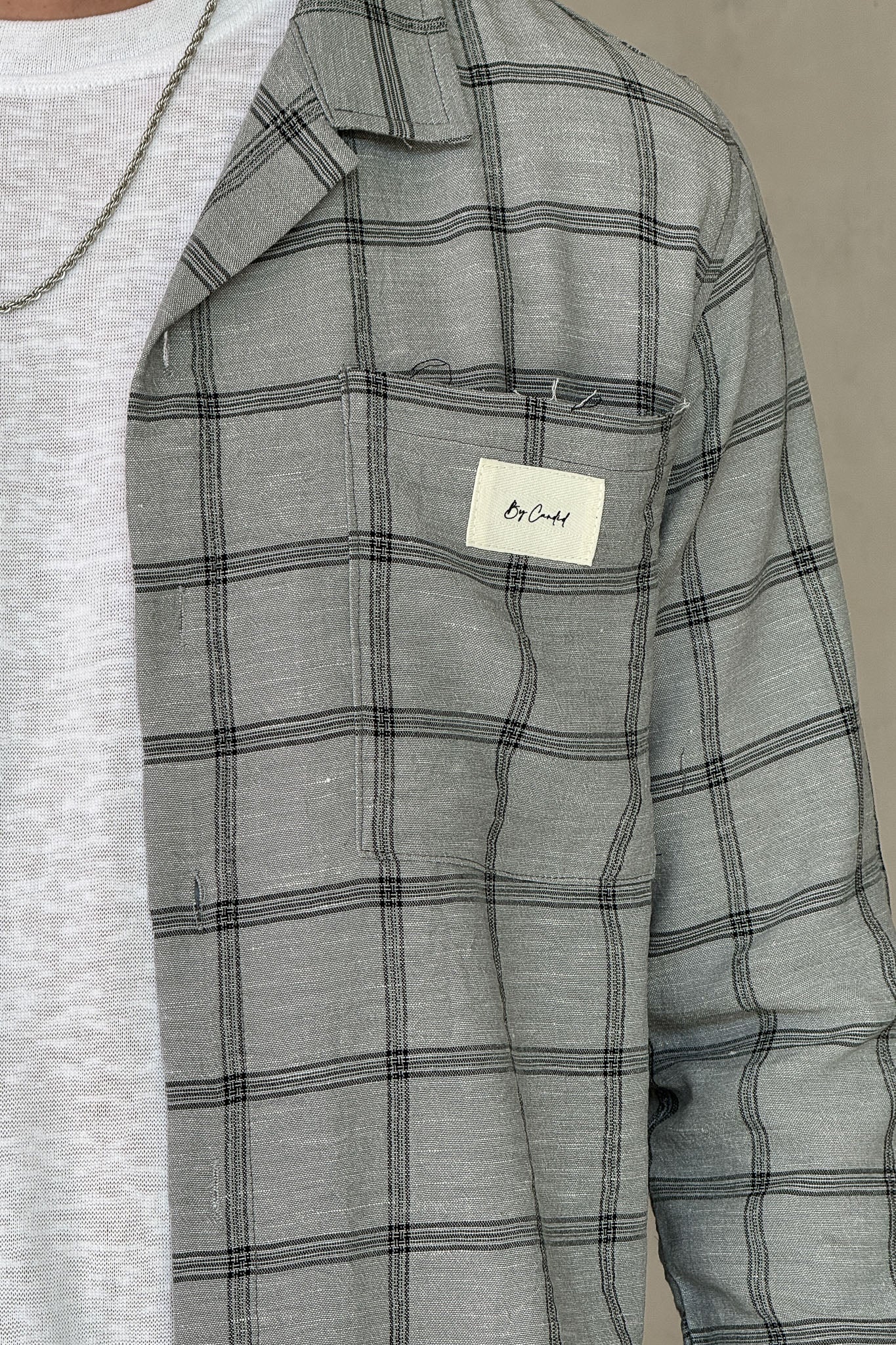 עליונית משובצת בגווני אפור עם כפתורים ולוגו עדין על החזה.