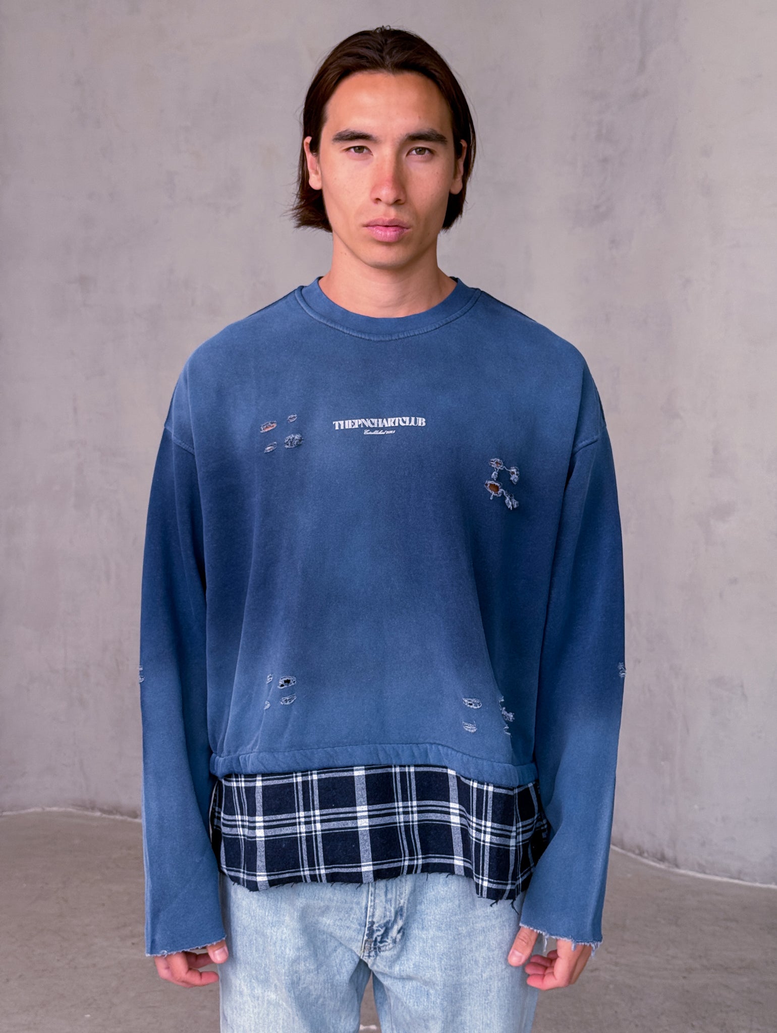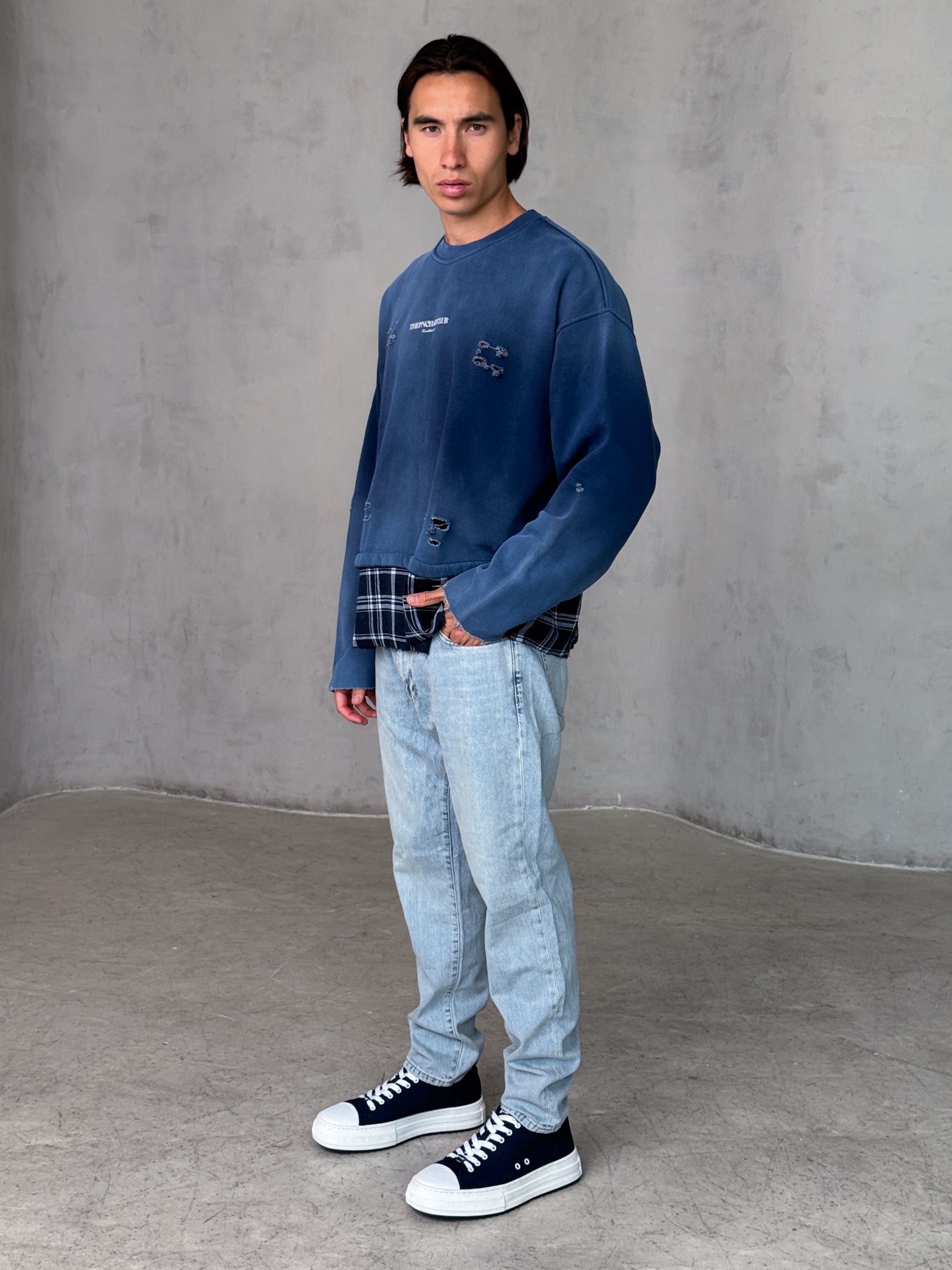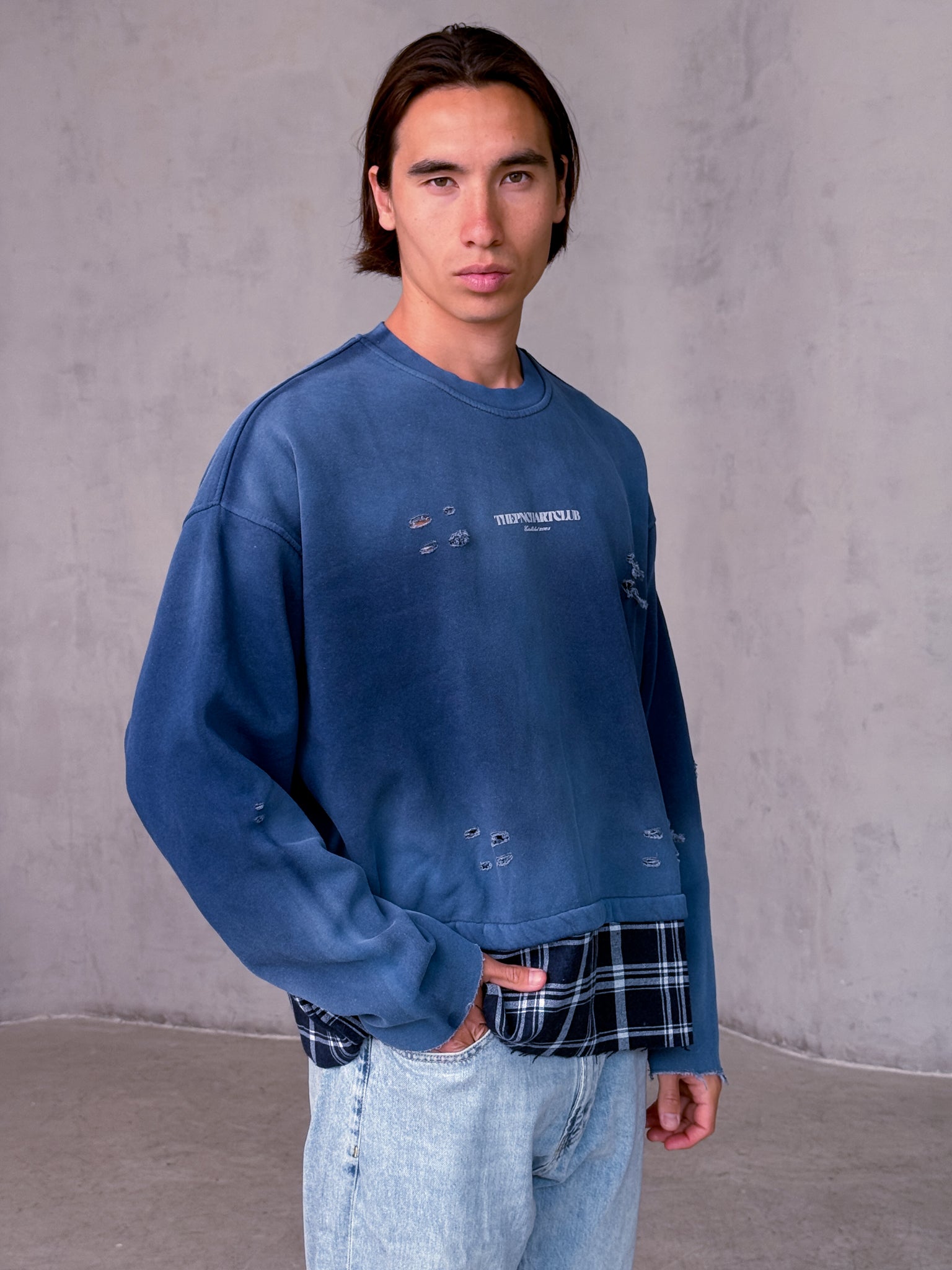 בד כותנה רך, אפקט קרעים עדין ועיצוב שכבות עם סיומת משובצת למראה אורבני לא מתאמץ.