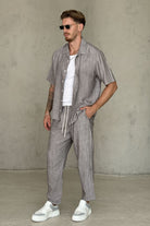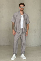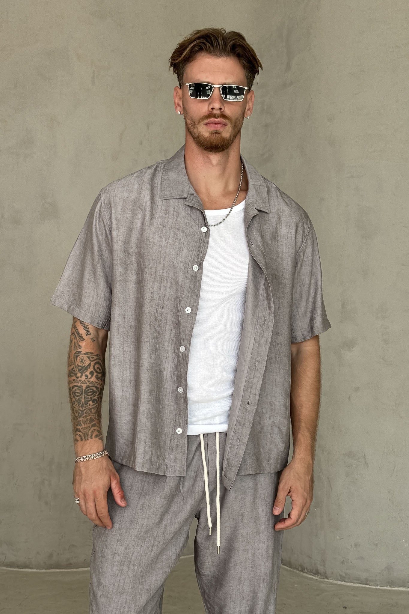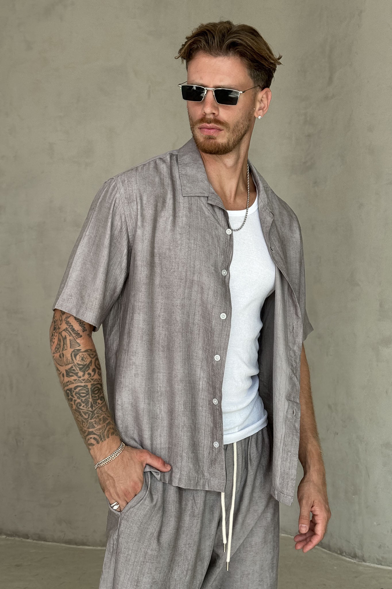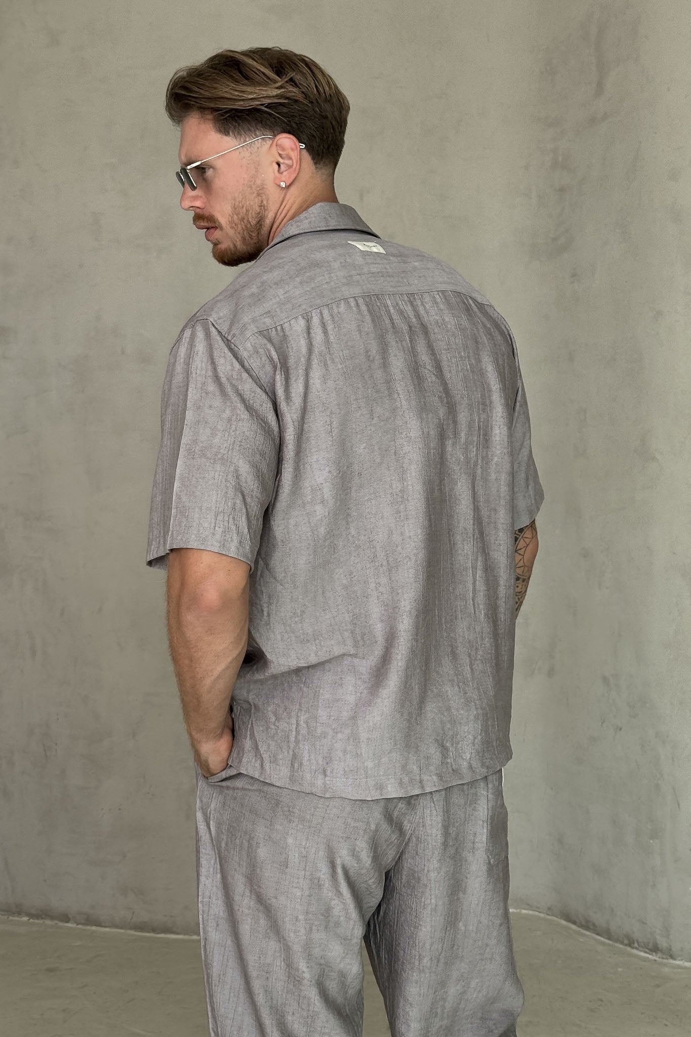 חולצת מכופתרת קצרה בגוון אפור בהיר, חלק מסט קייצי מלא.