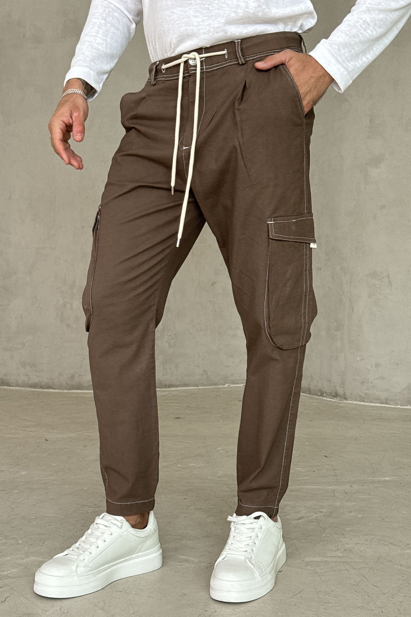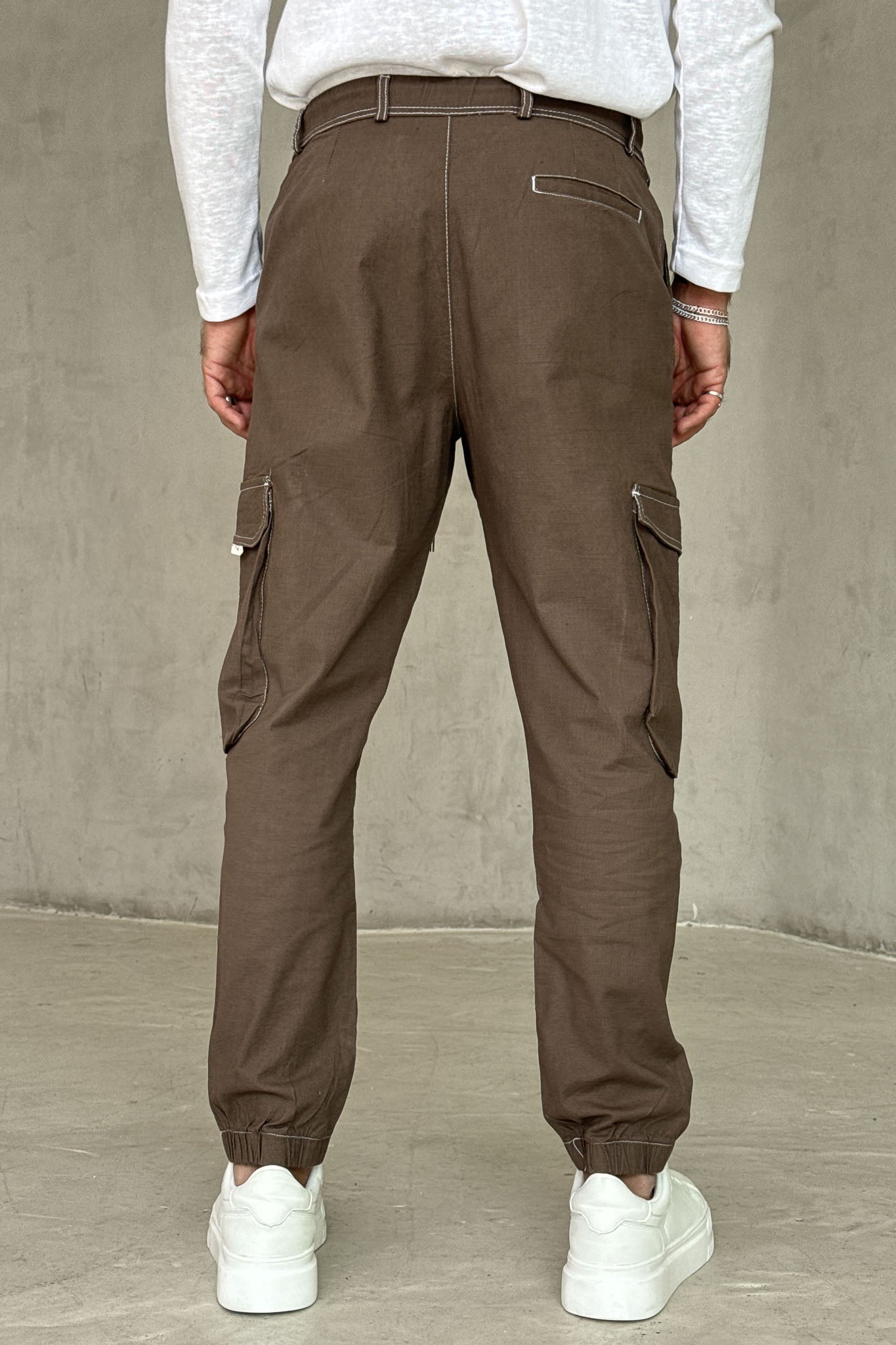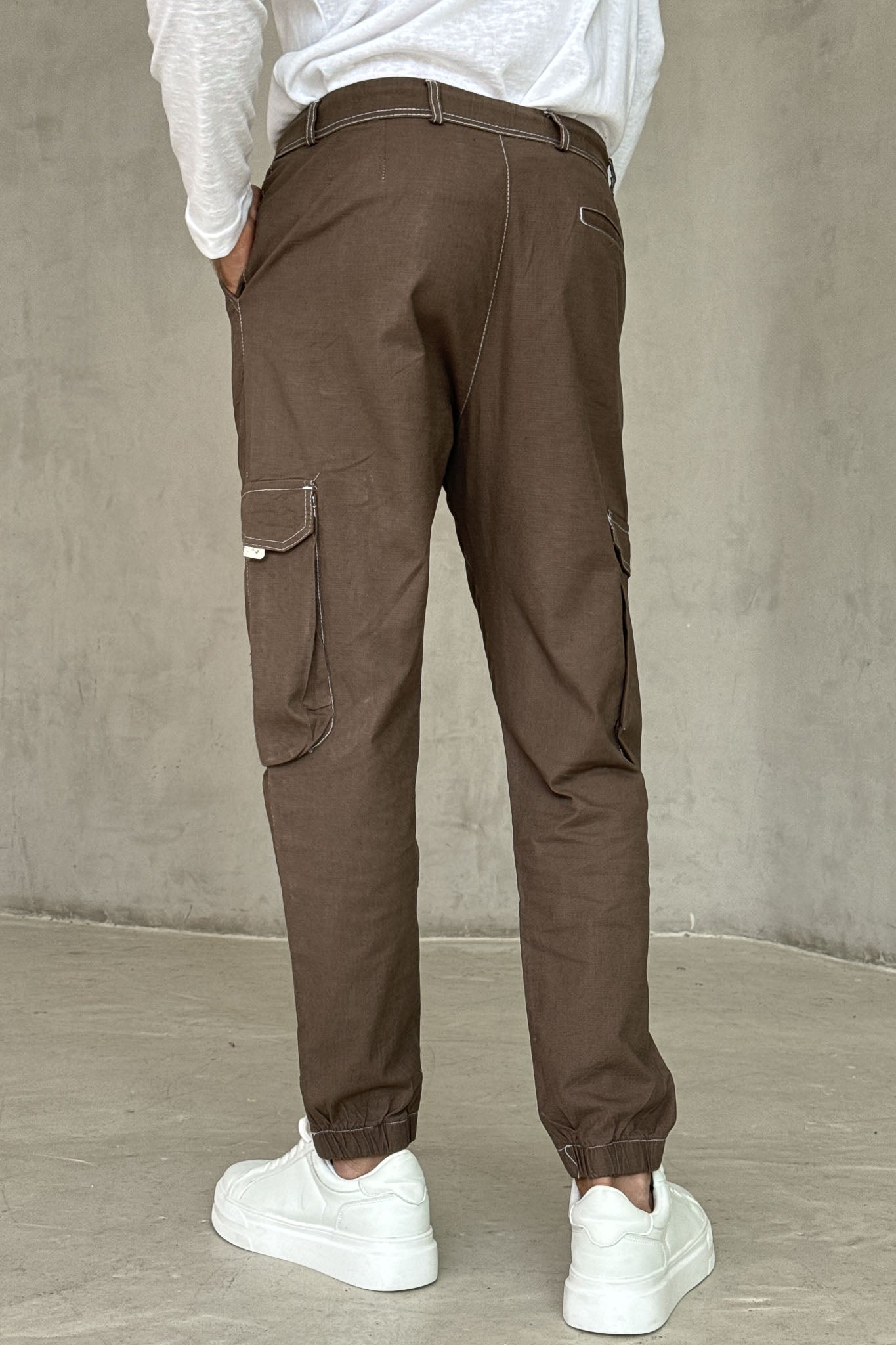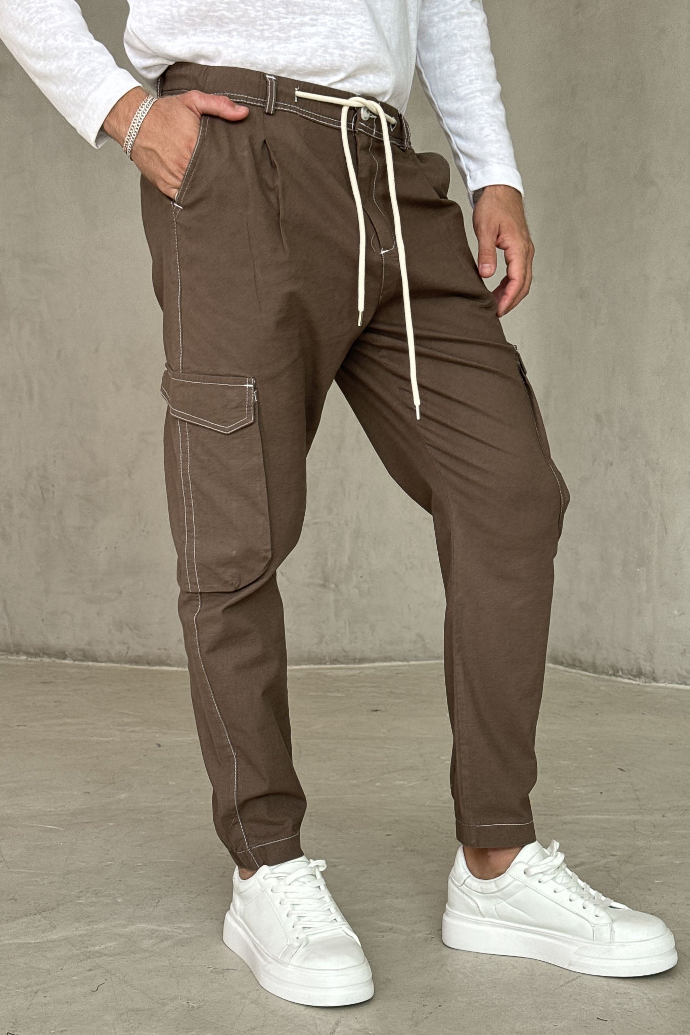 ג׳וגר בגוון חום עם כיסי צד פרקטיים ושרוך מותן לבן שמוסיף טאץ׳ נקי ומדויק.