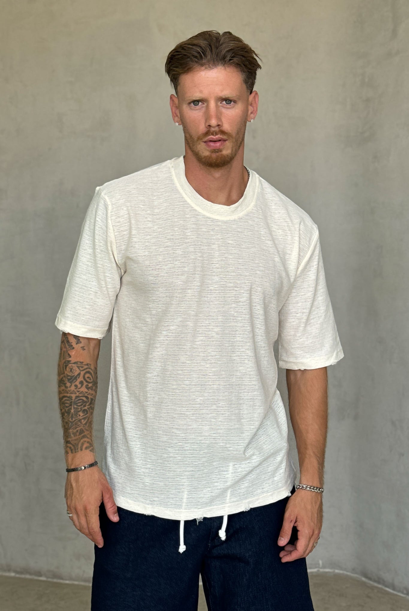 חולצה קצרה בגזרת אוברסייז שמעניקה מראה משוחרר ונינוח, ומתאימה כמעט לכל הופעה. עשויה מבד סריג פשתן נעים ונושם, שמוסיף טאץ’ אלגנטי גם ללוק יומיומי.
