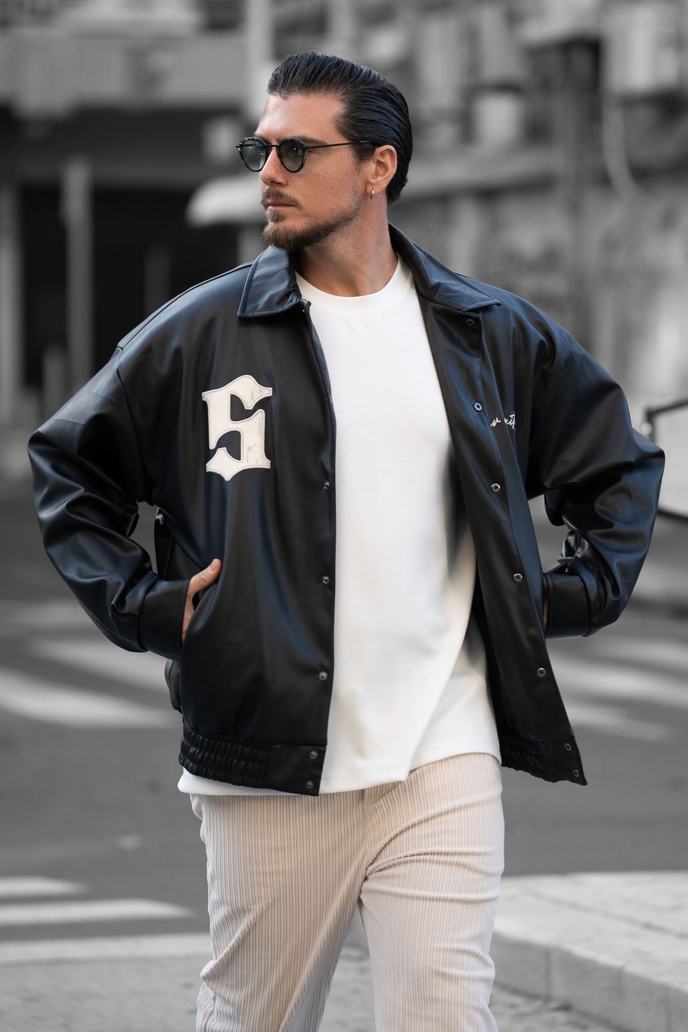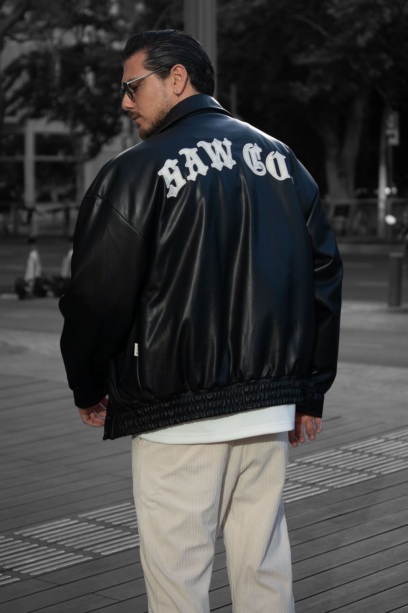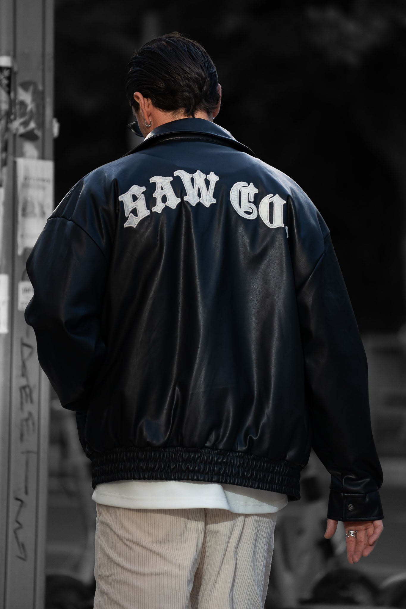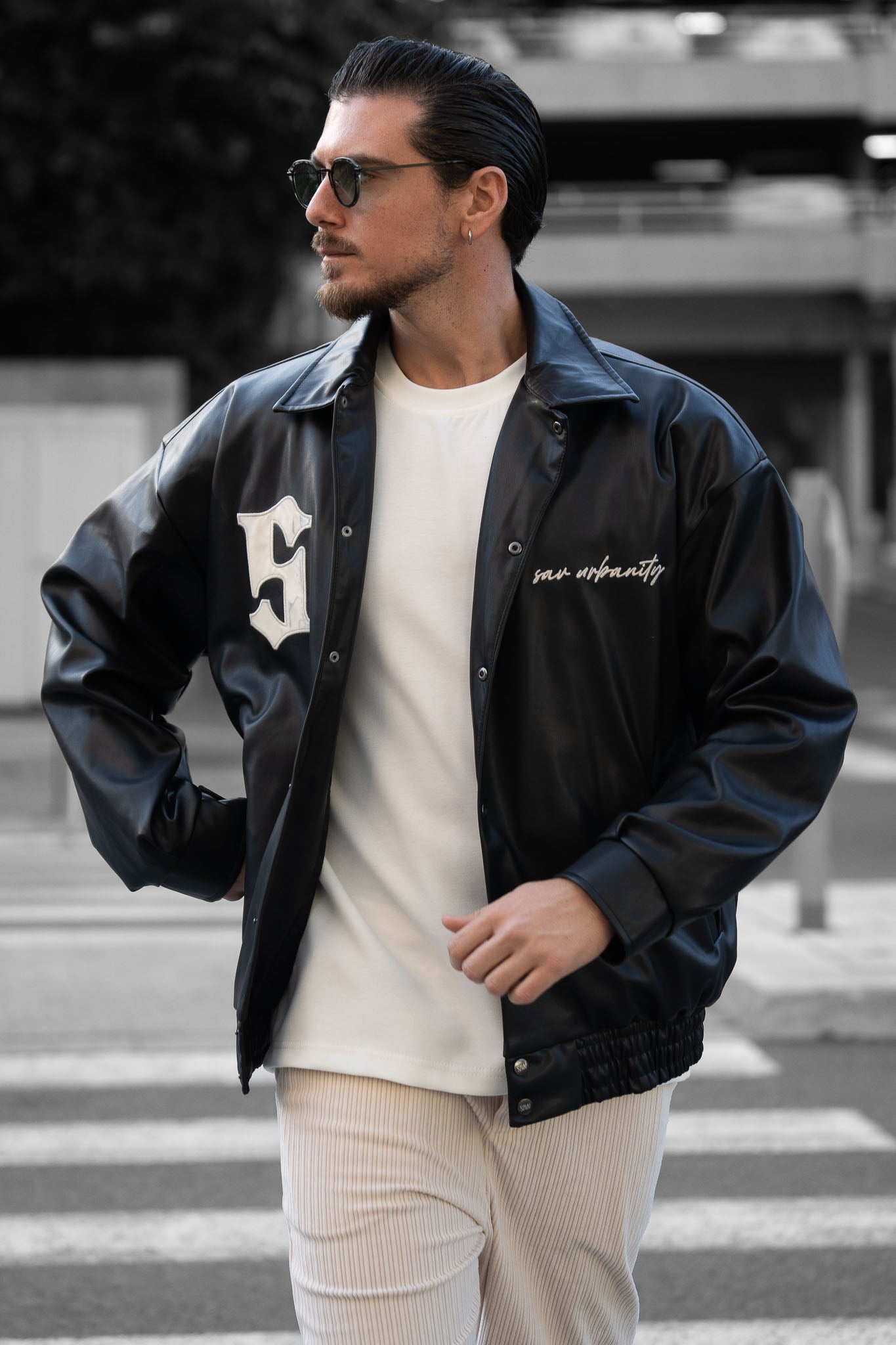 ג'קט עור אופנתי עם כיתוב בולט בגב וכיתוב עדין בחזית,