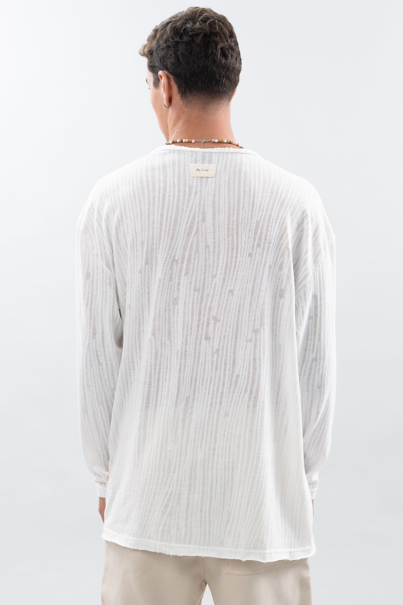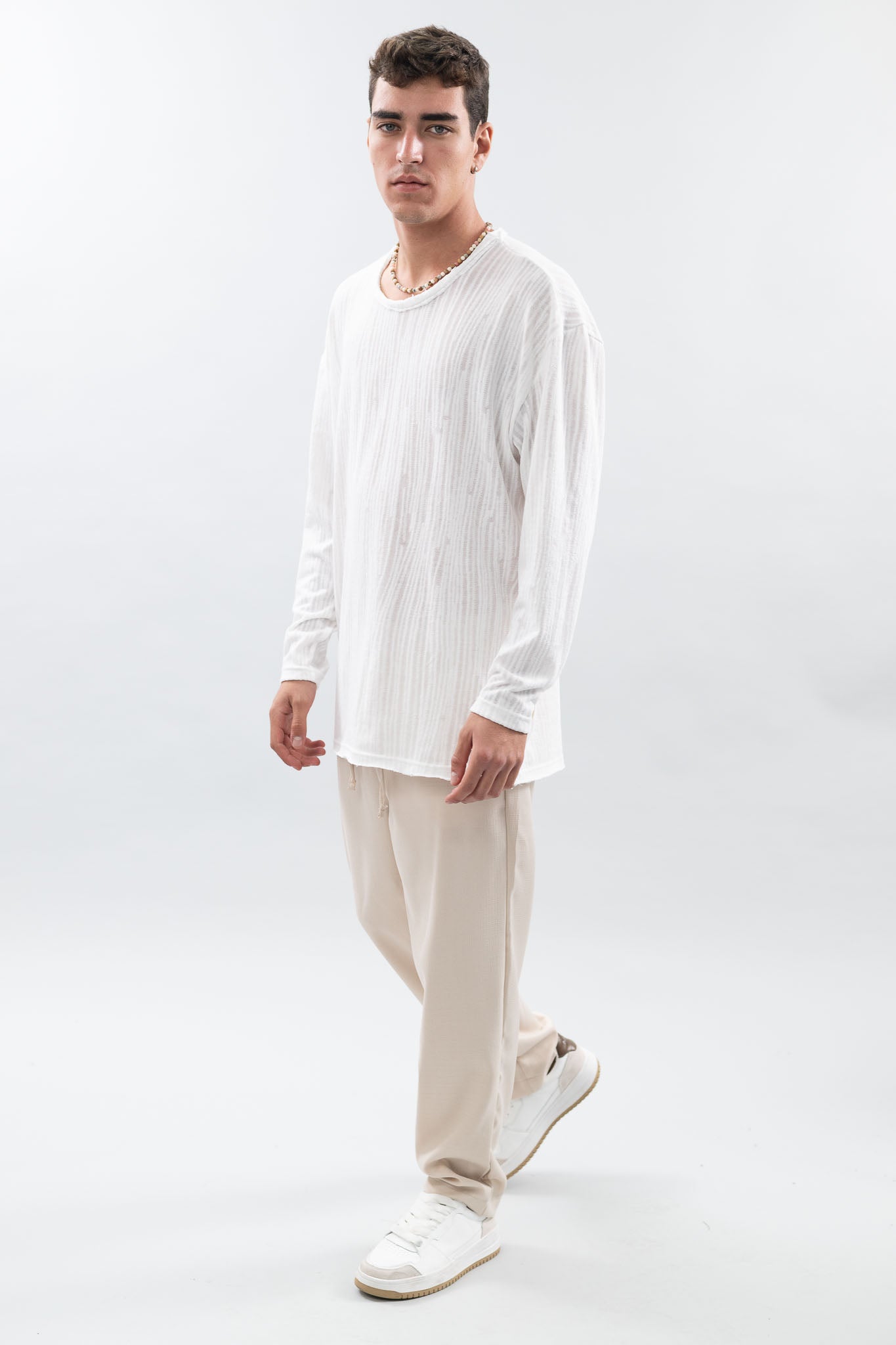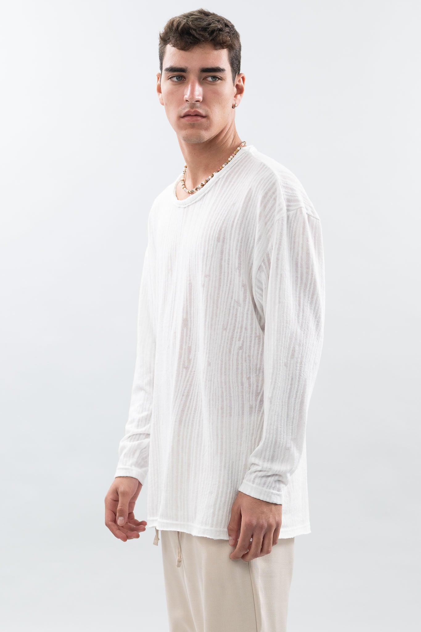 מידות הדוגמן - גובה 1.85 שוקל 75 לובש מידה L טי שרט עם שרוולים ארוכים, עשויה מבד סריג עם טקסטורה מיוחדת.