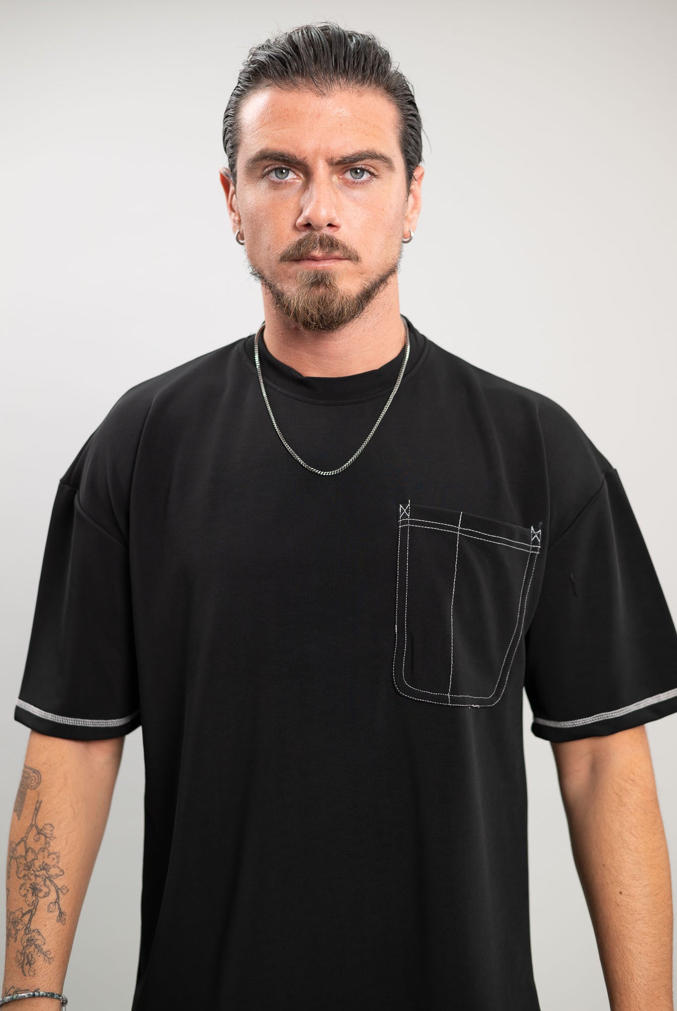 טי שרט קצרה בגזרת oversize , עם כיס מקדימה ותפרים בצבע לבן שיוצרים ניגוד עדין שיוצר מראה מתוחכם לחולצה ,