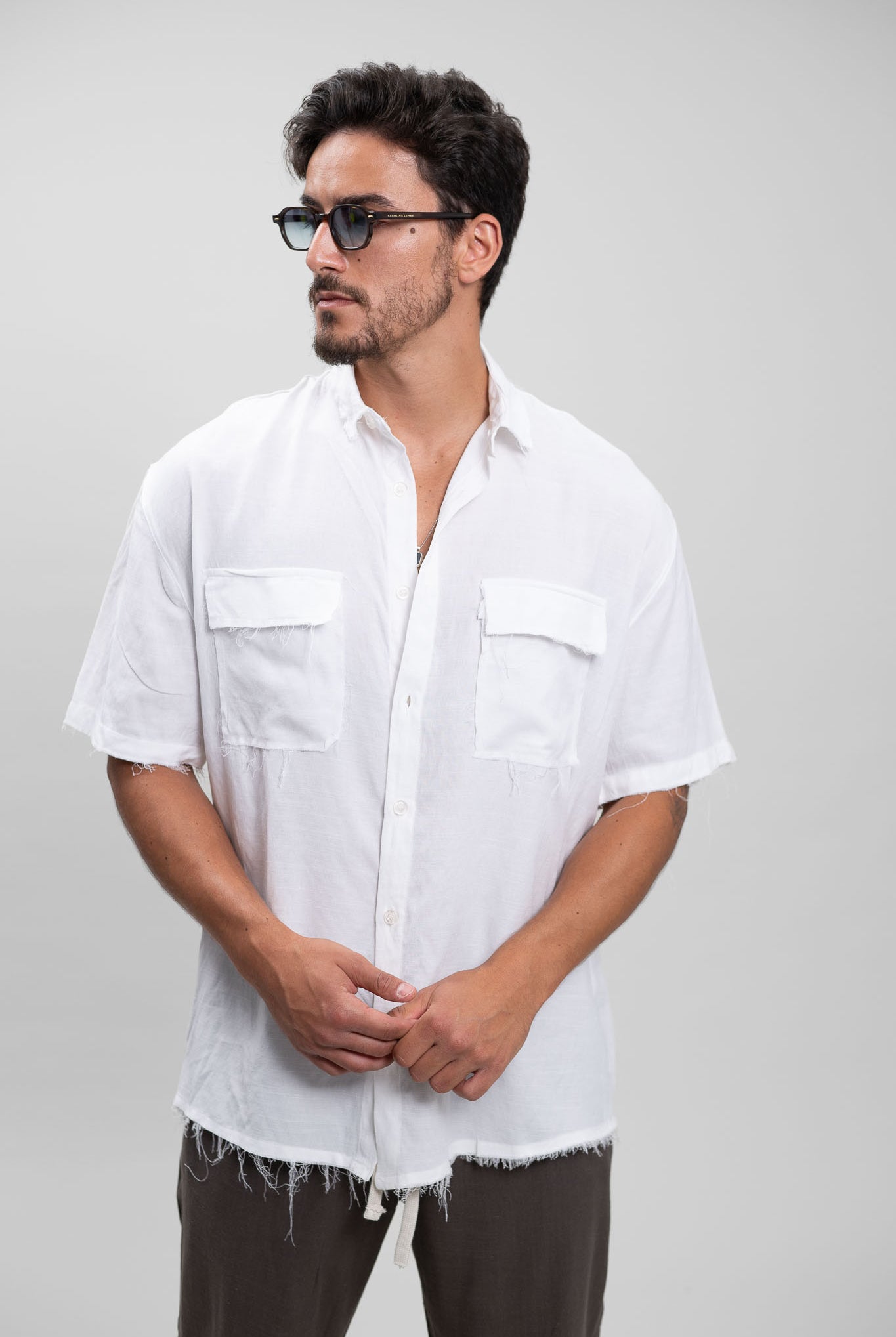 מידות הדוגמן : הדוגמן בגובה 1.79 שוקל 77 לובש מידה M מכופתרת קצרה בגזרת oversize עם צווארון קלאסי,