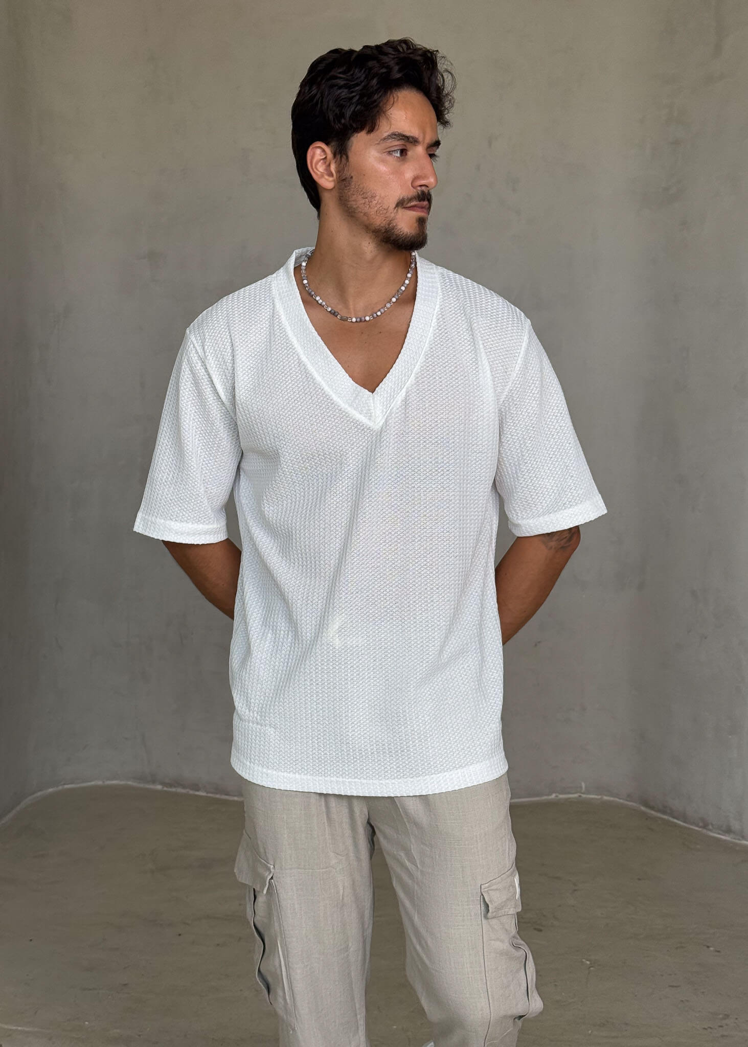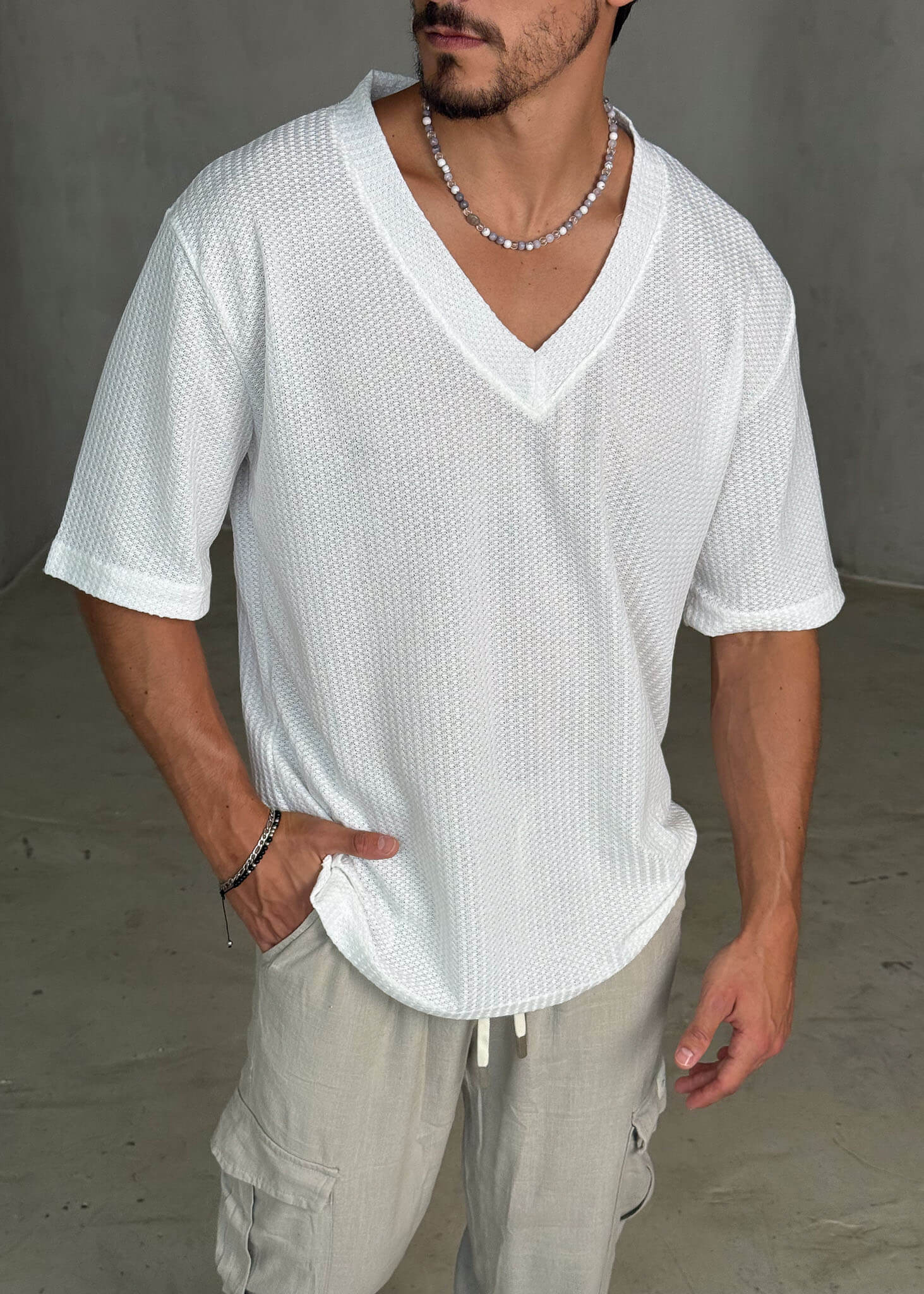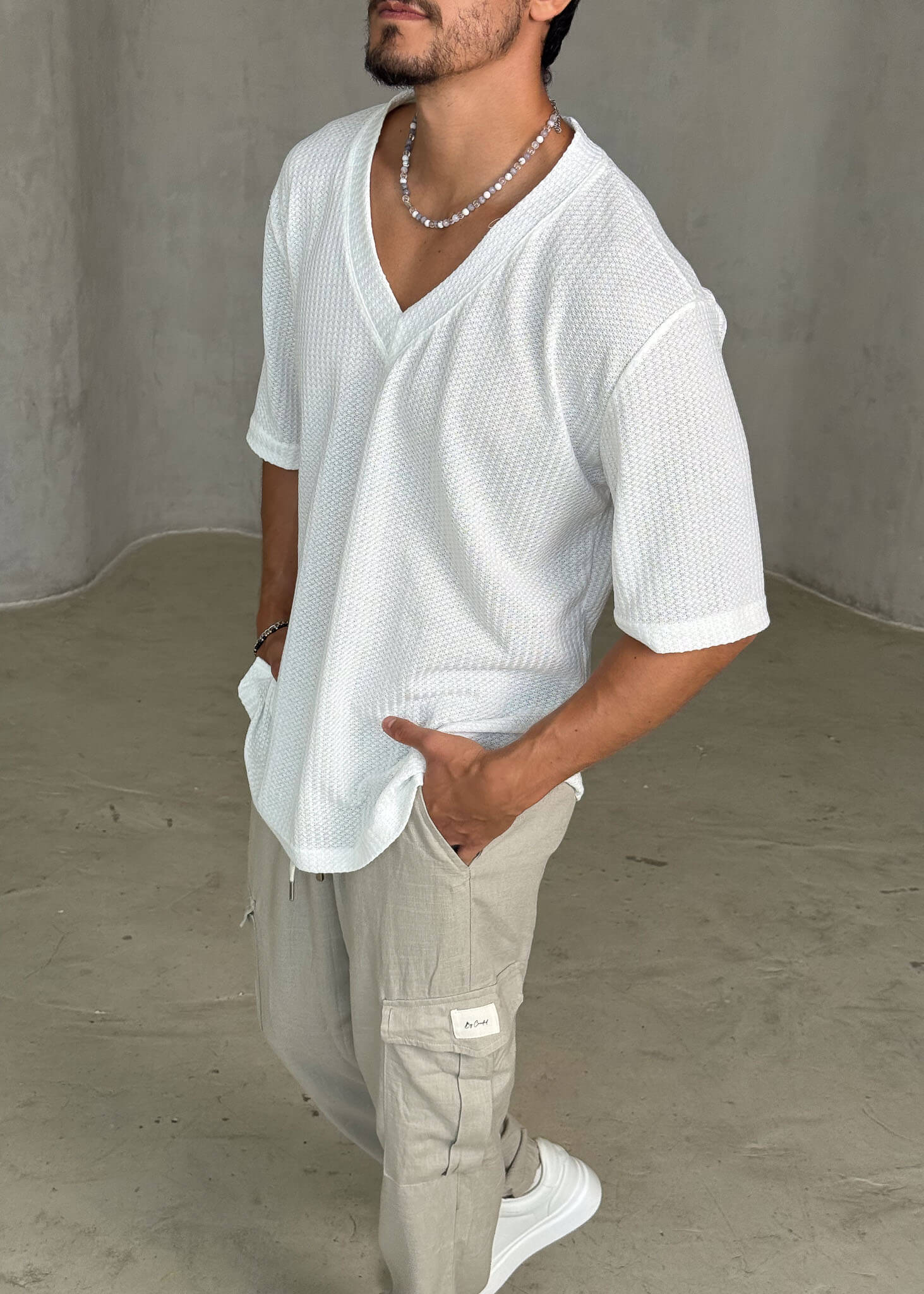 חולצת קצרה אוברסייז, עם עיצוב פשוט ואוורירי שמספק מראה קליל ונעים.