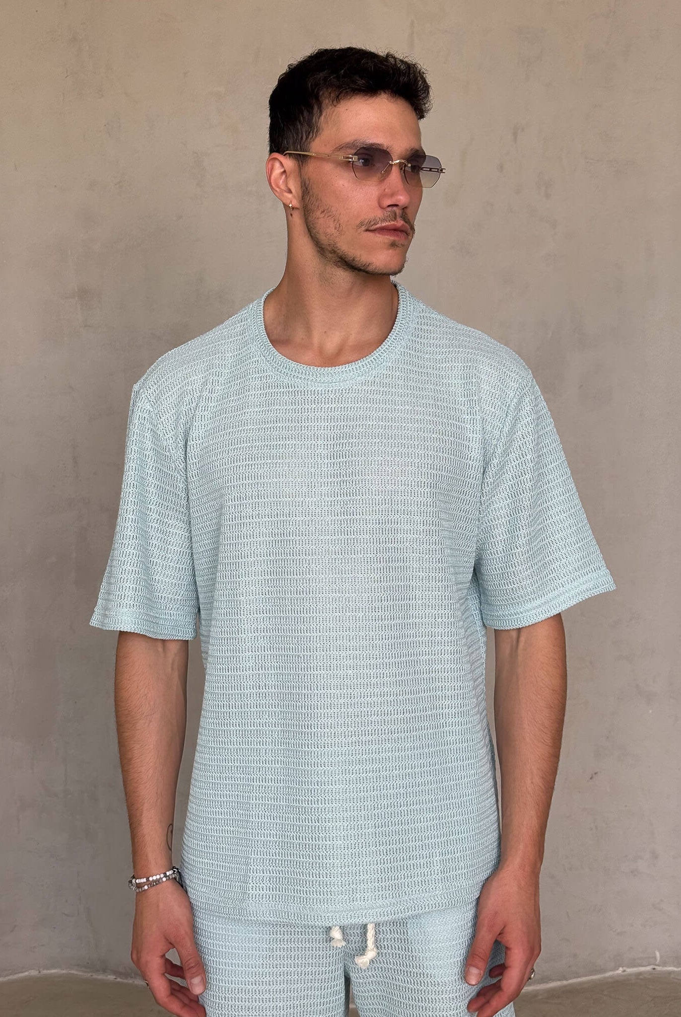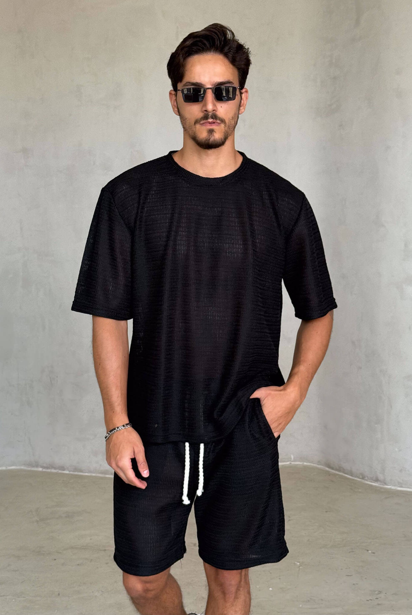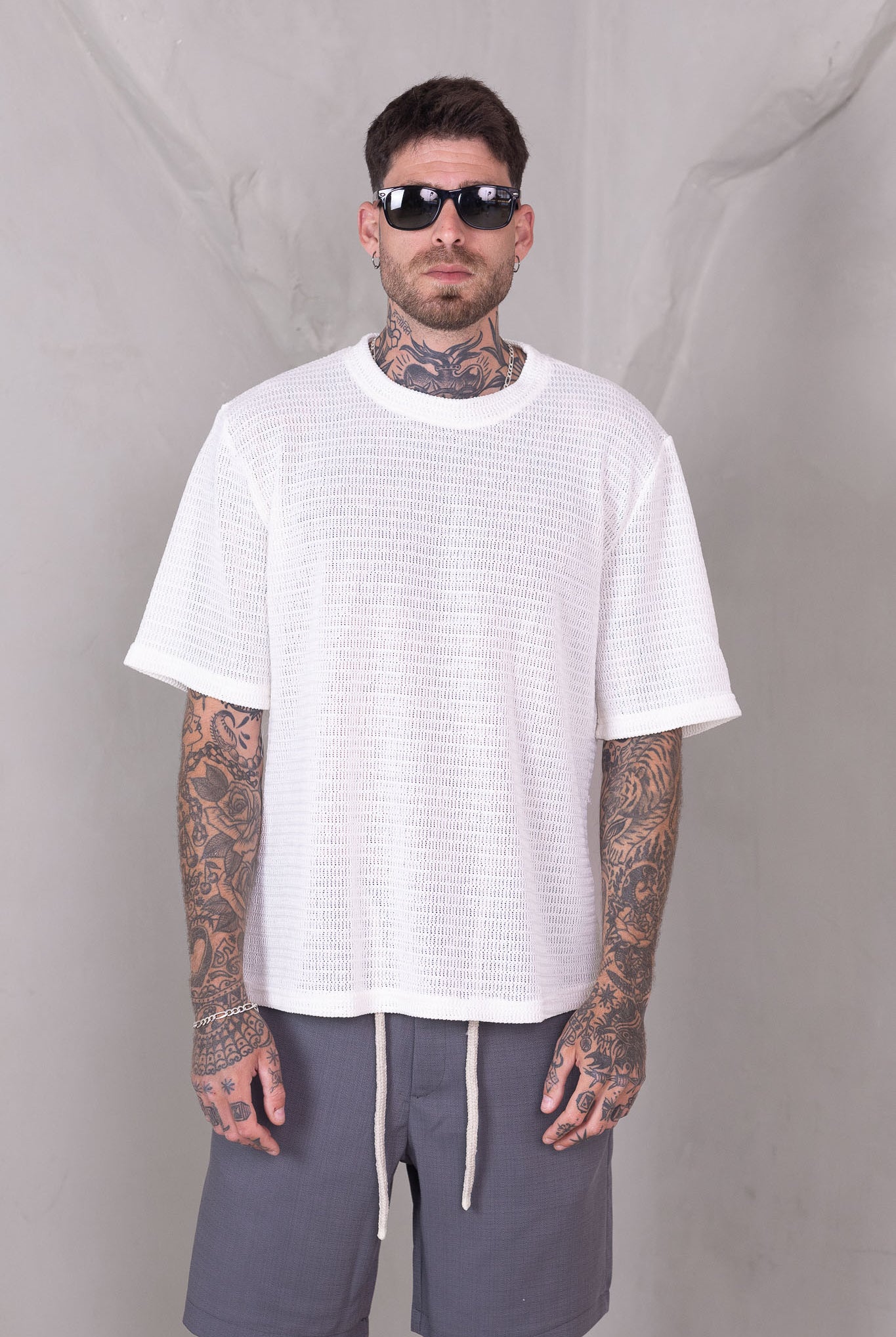 דוגמן בגובה 1.84 משקל 70 לובש מידה L חולצת קצרה אוברסייז, עם עיצוב פשוט ואוורירי שמספק מראה קליל ונעים.